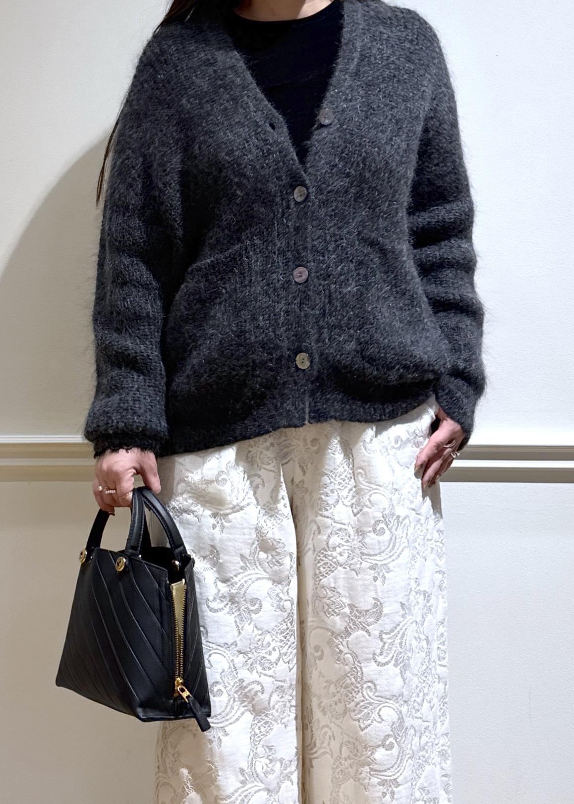 ROPÉスーパーキッドモヘヤVネックカーディガン/イージーケアチャコール / F¥41,800レビュー163cmでフリーサイズ着用。