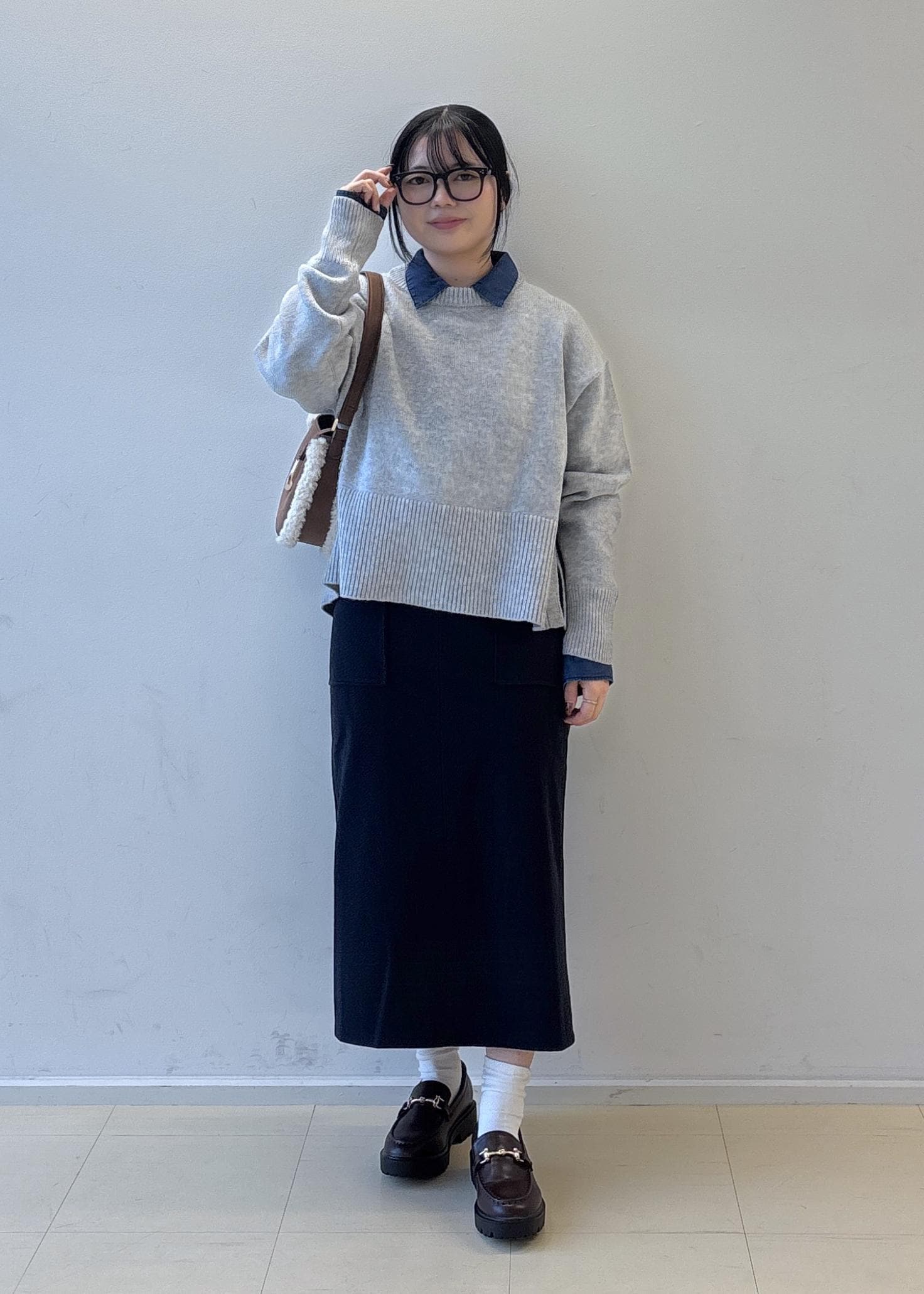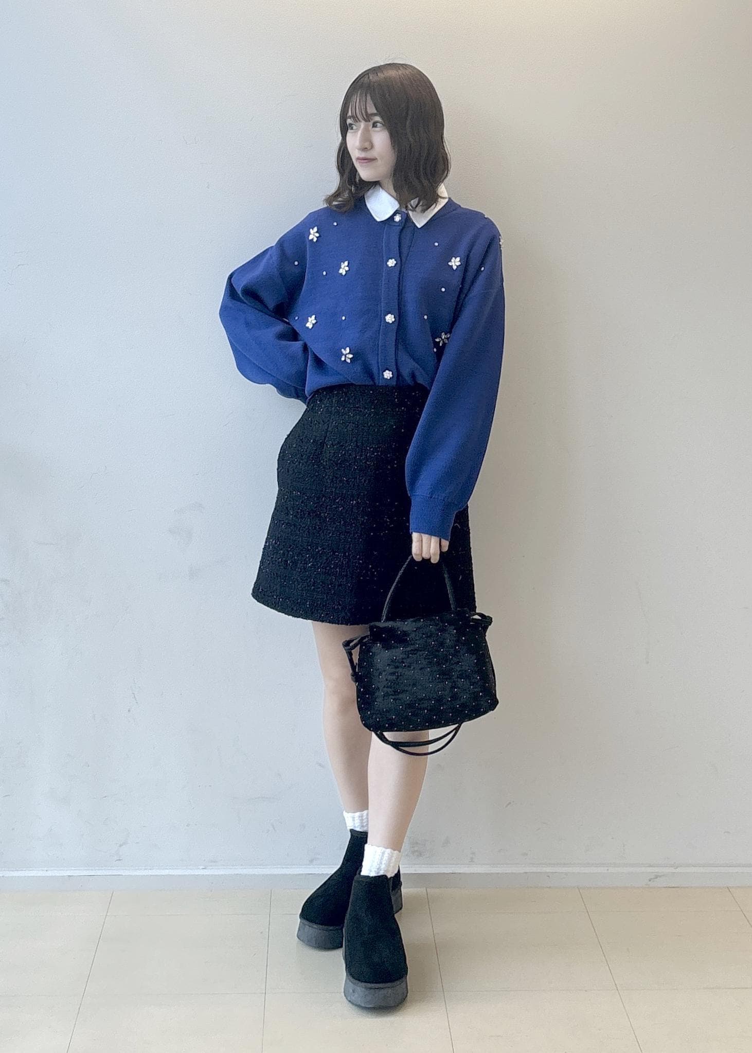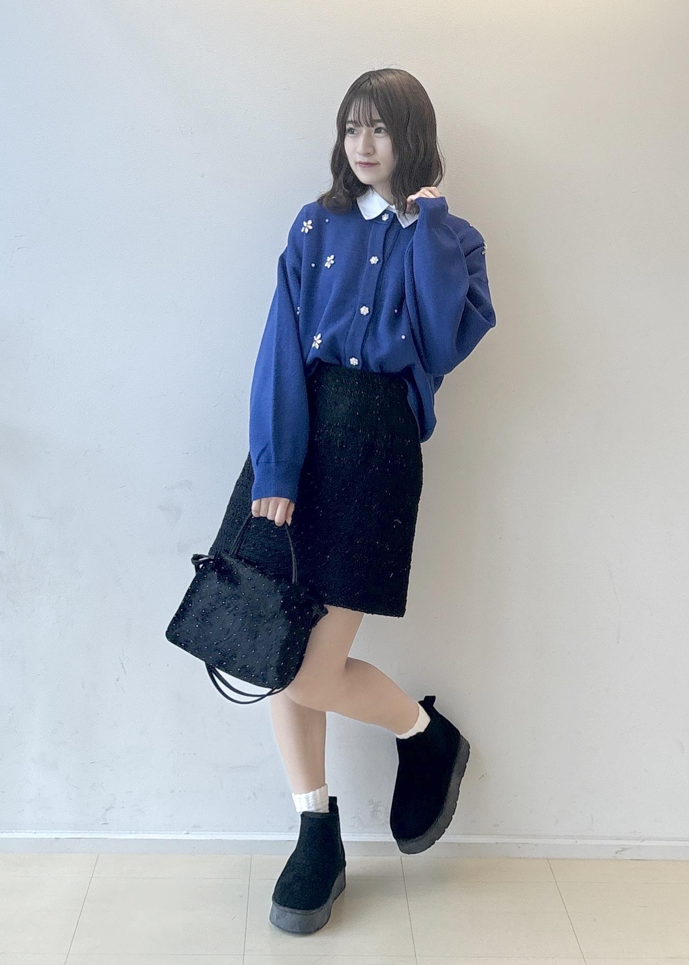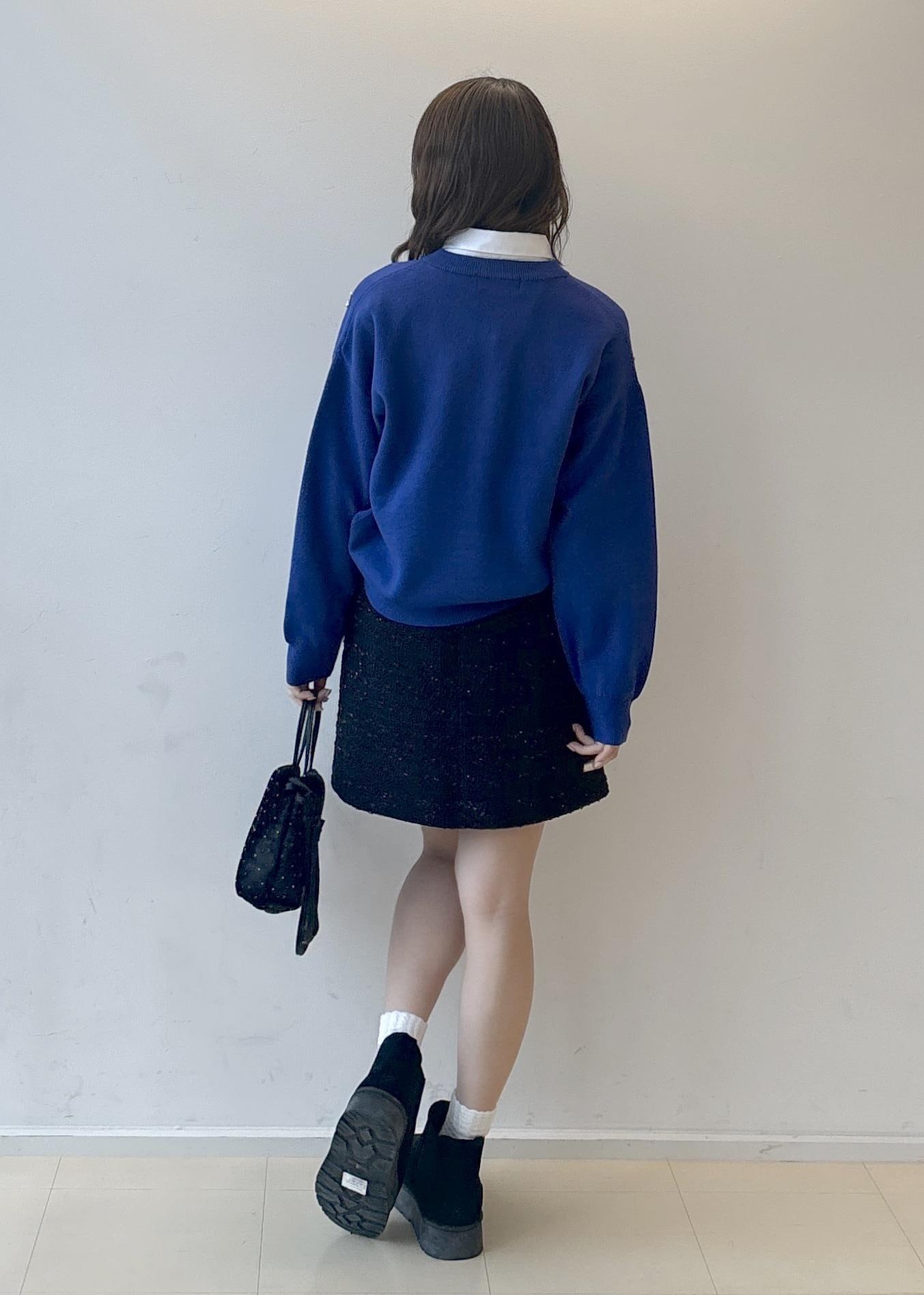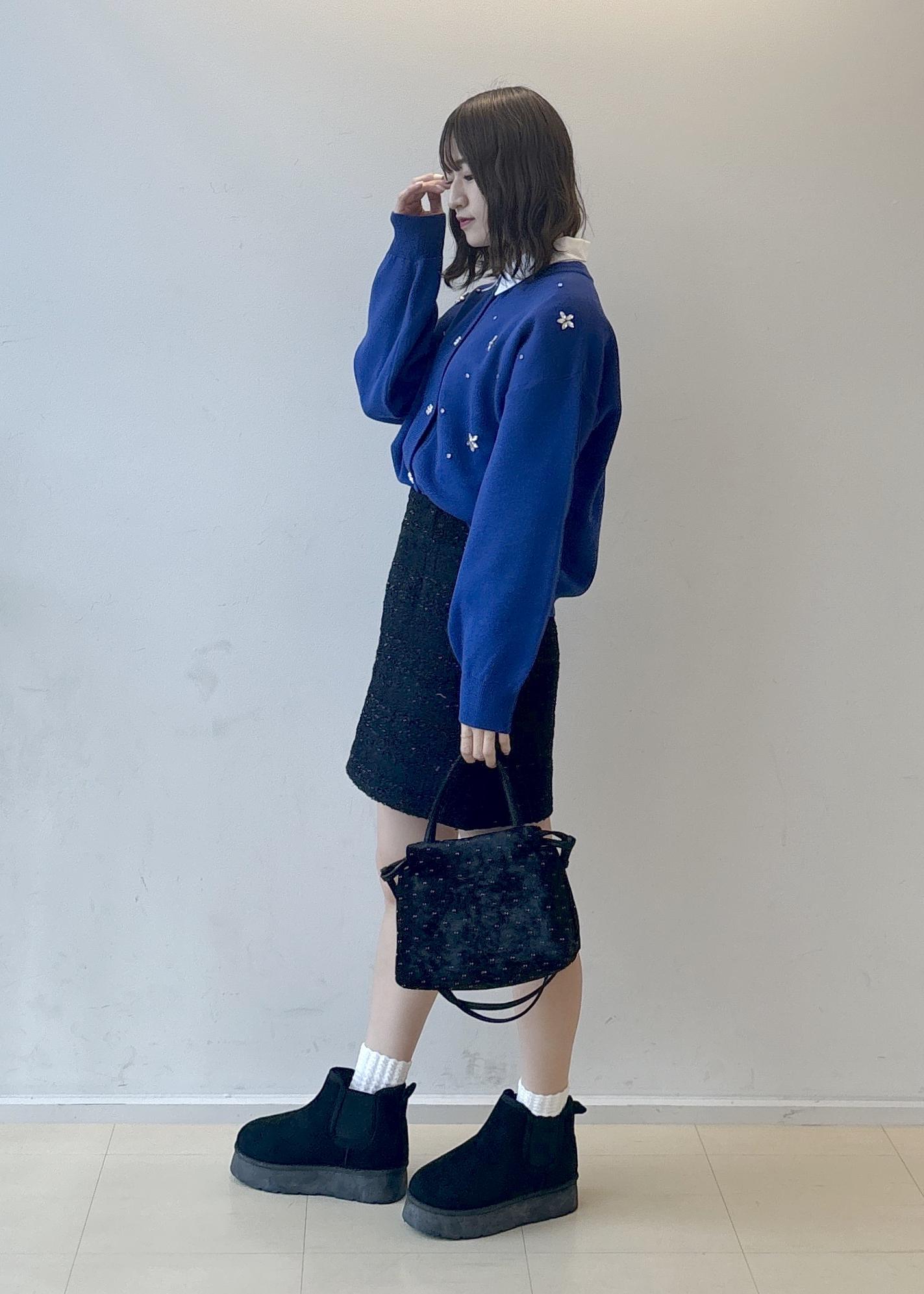 ブルー×ブラックの組み合わせが甘すぎず大人っぽい印象にしてくれるのでミニスカートでも合わせやすいです!