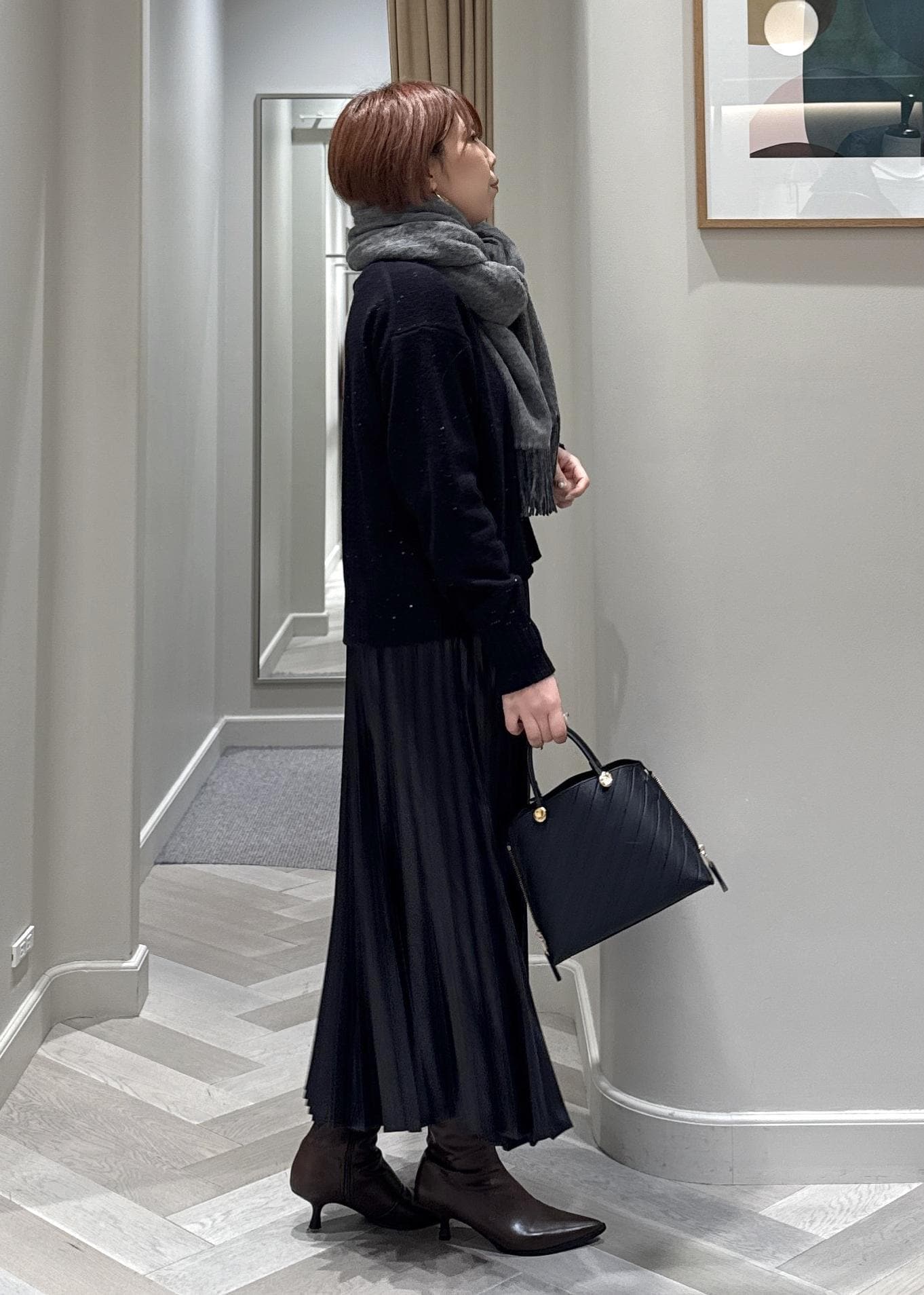 ニットなどには勿論、ジャケットスタイルにも合わせやすいので秋から春にかけての通勤コーデとしても