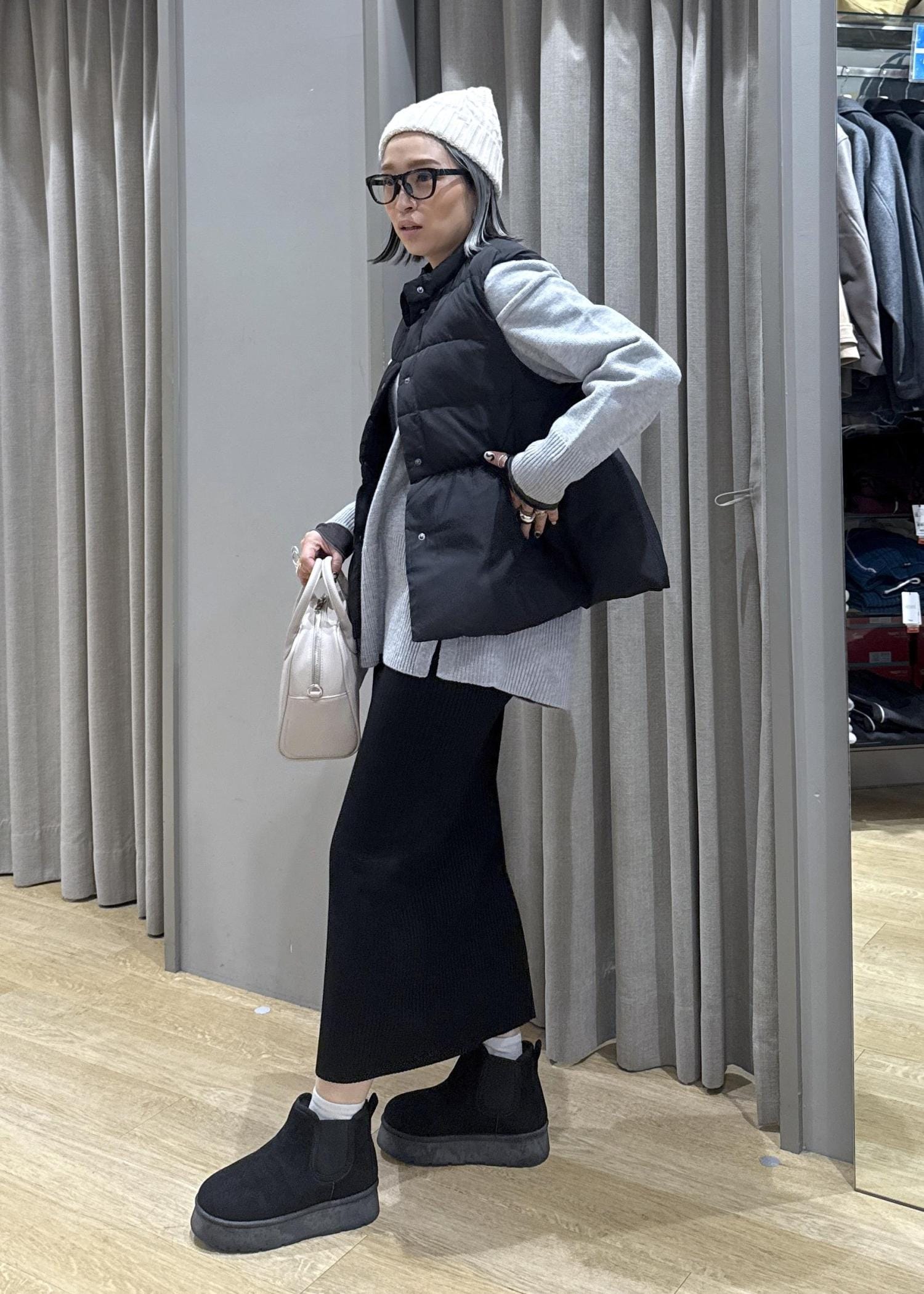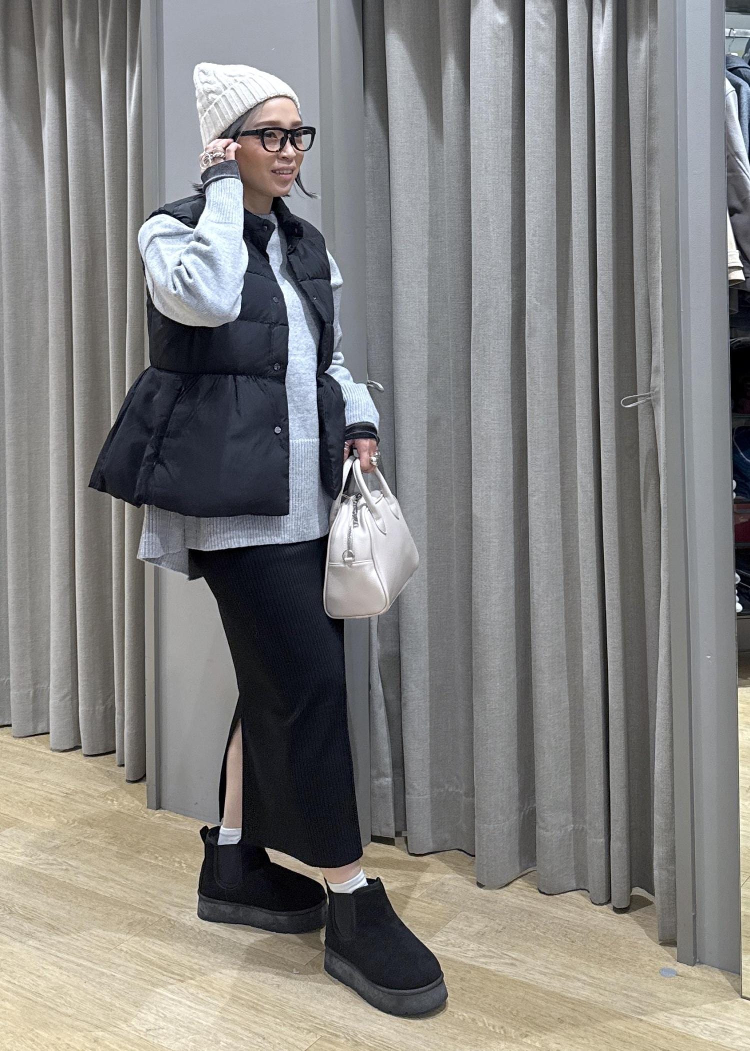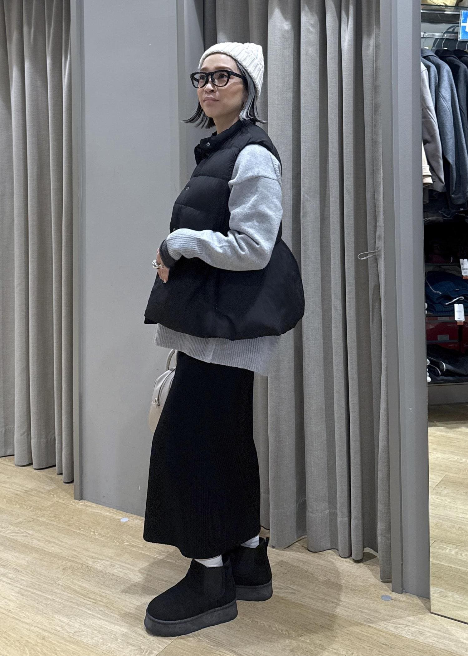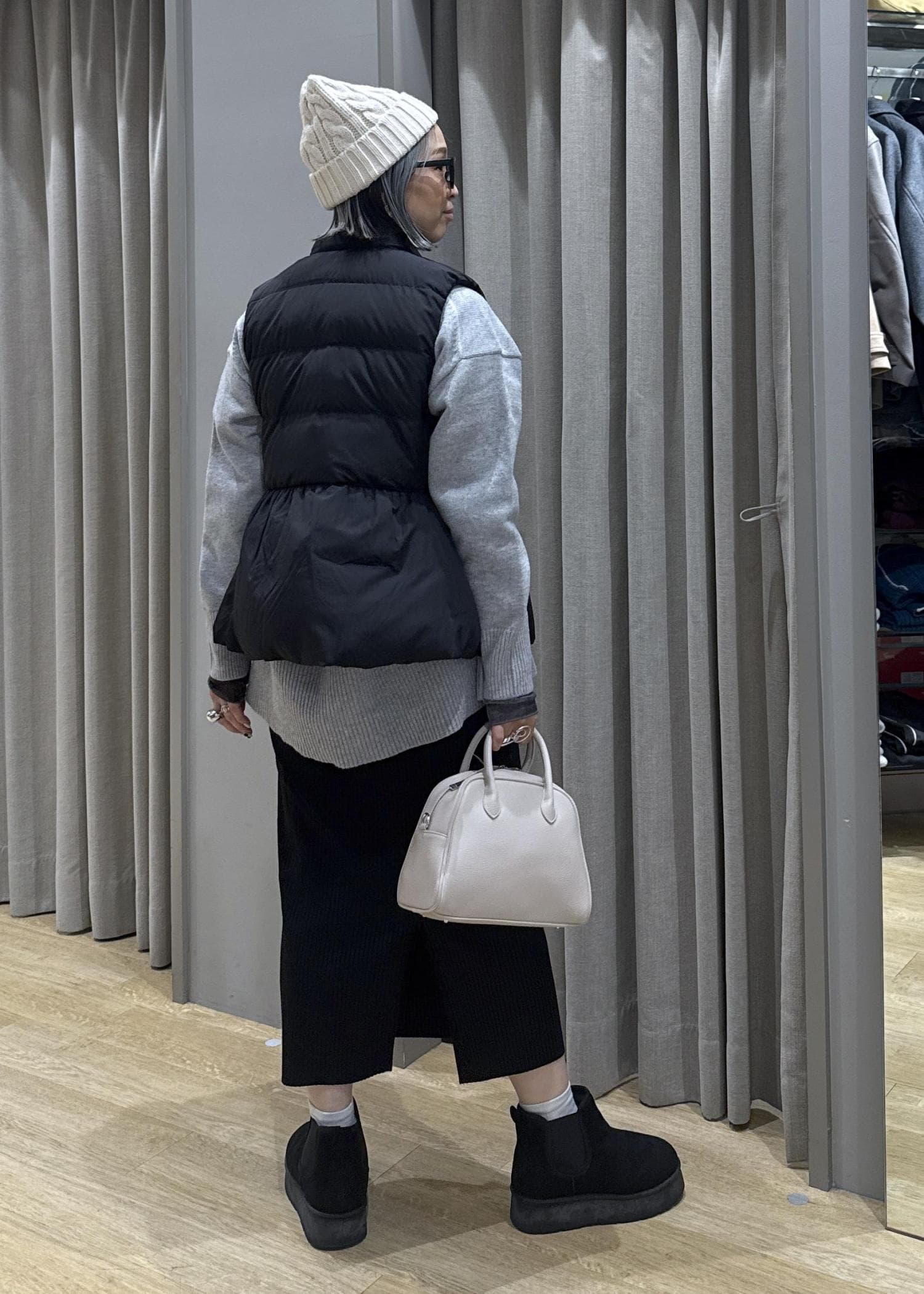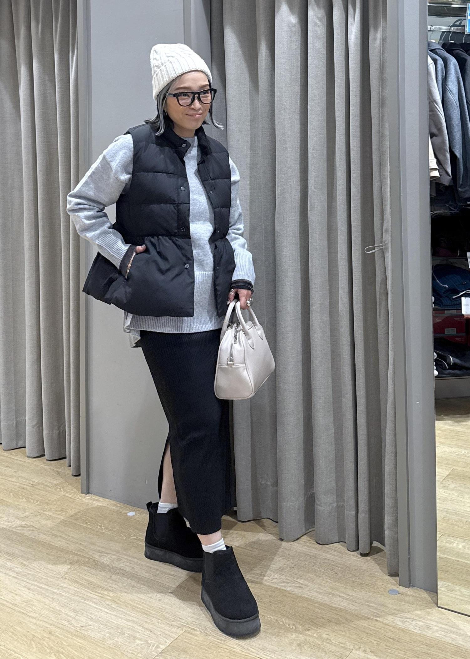 トップスはしっかり長さのある緩めにして、タイトスカートによって出るヒップラインをカバーしています♪