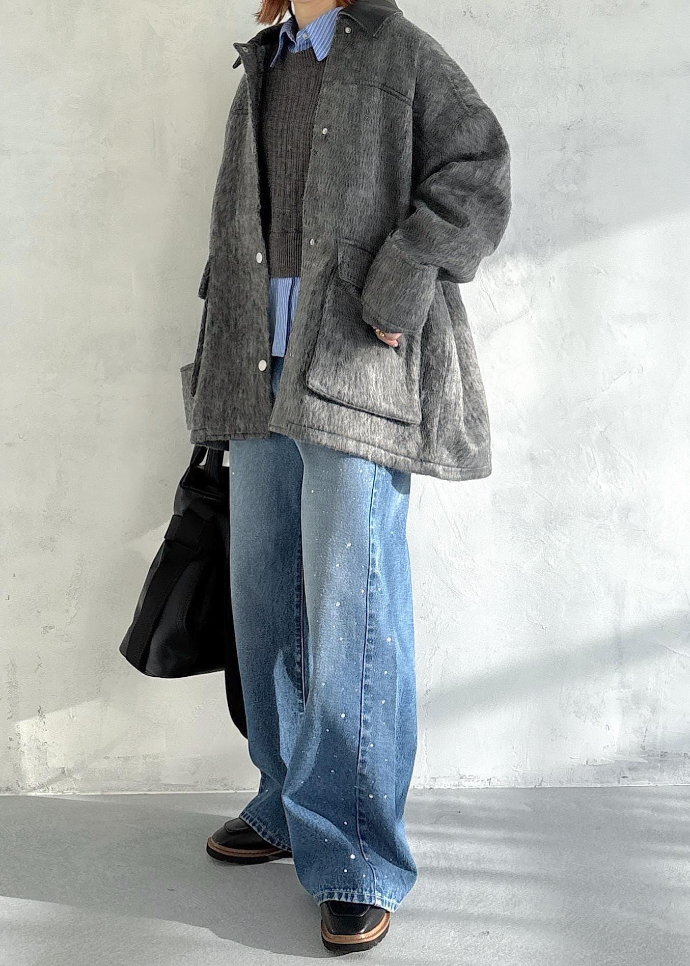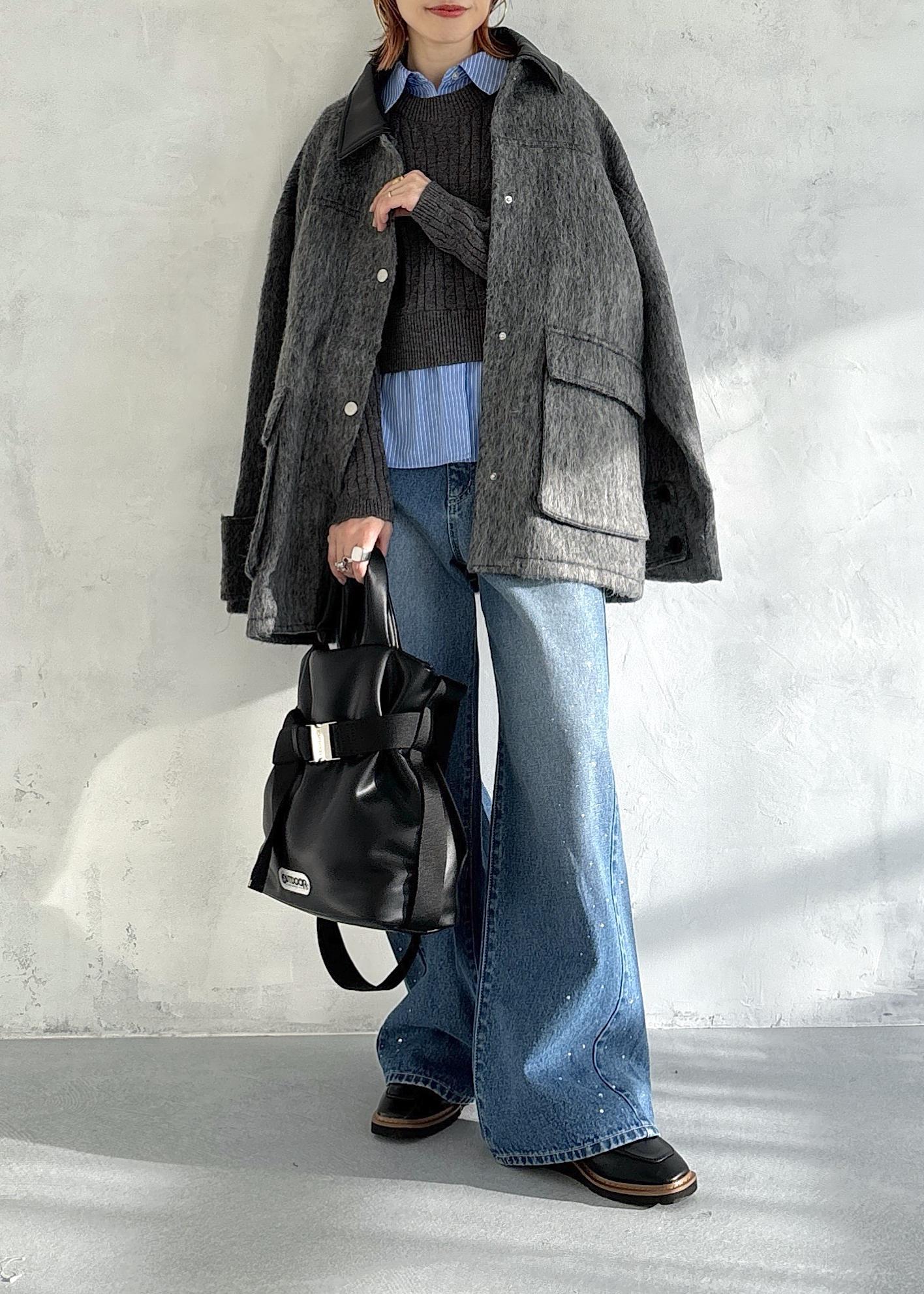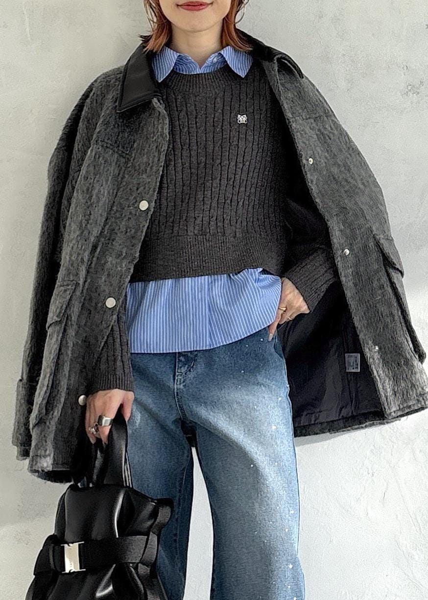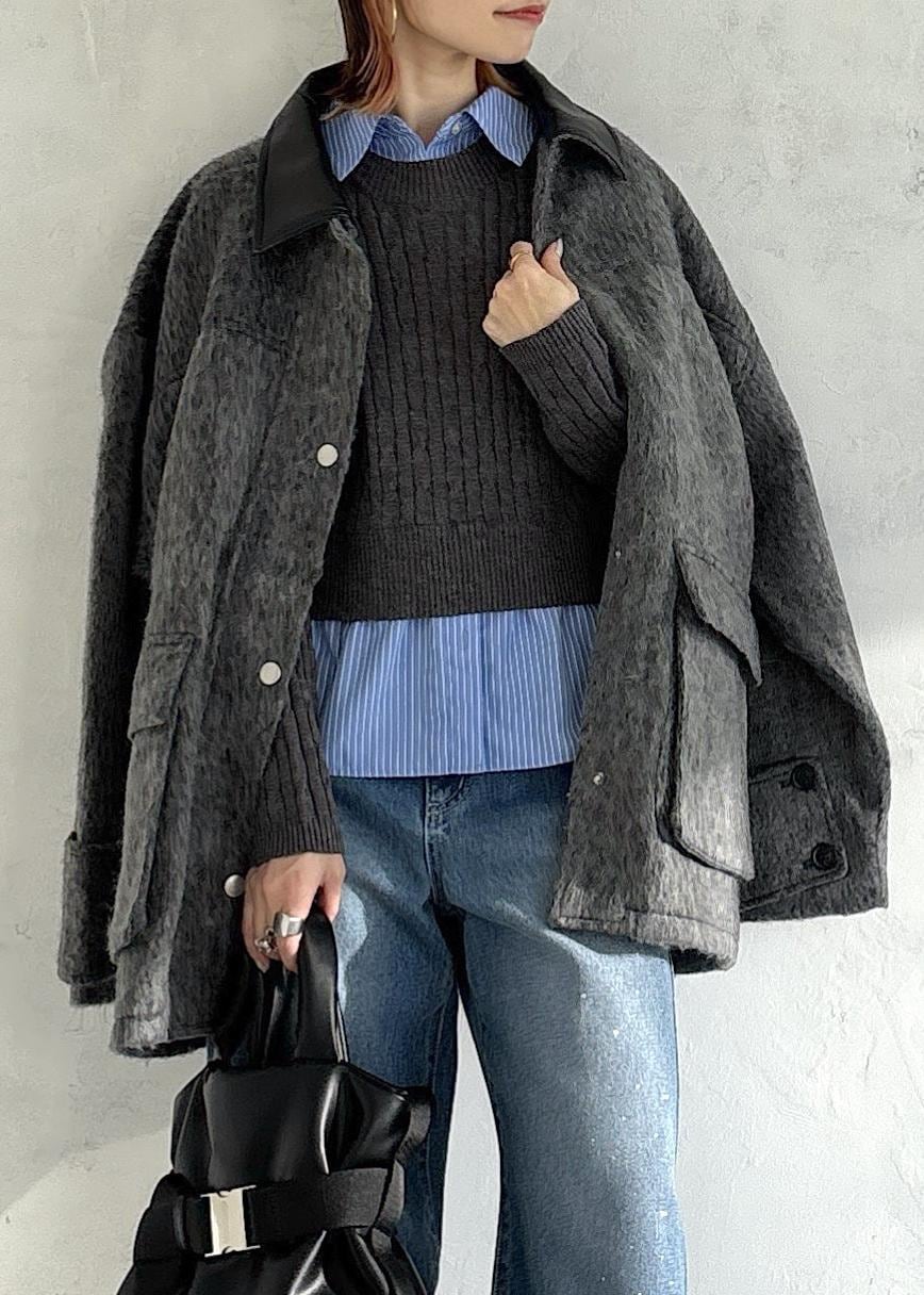 ふわっとシャギーと襟元のフェイクレザーが今年らしいコートをポイントに、レイヤードニット、デニムで合わせた休日スタイル♪アウターのグレーに合わせ、インナーもグレーのワントーン風に、レイヤードでシャツがドッキングとなっているので、一枚でトレンドスタイルの完成です◎冬のお出かけにぴったりな大人カジュアルコーデ。