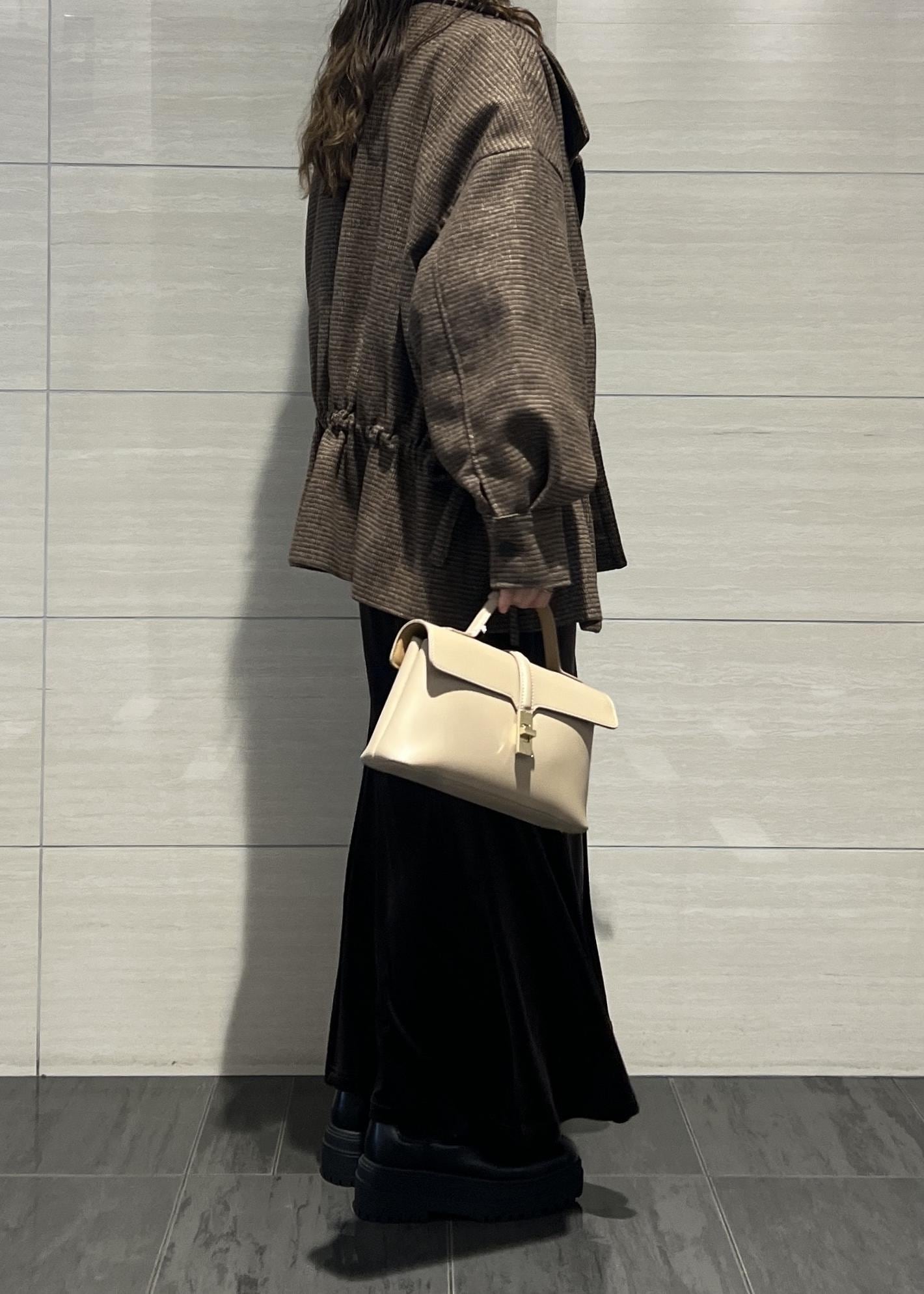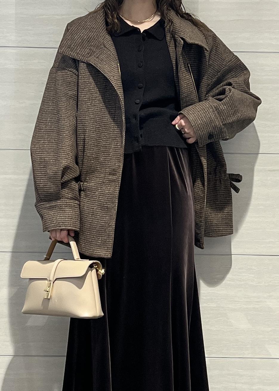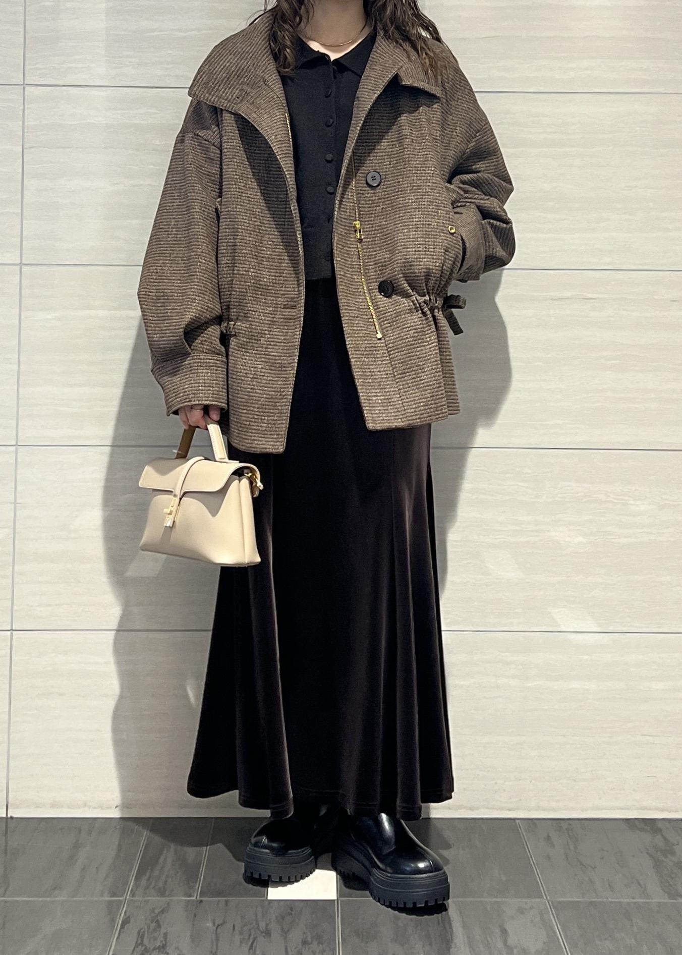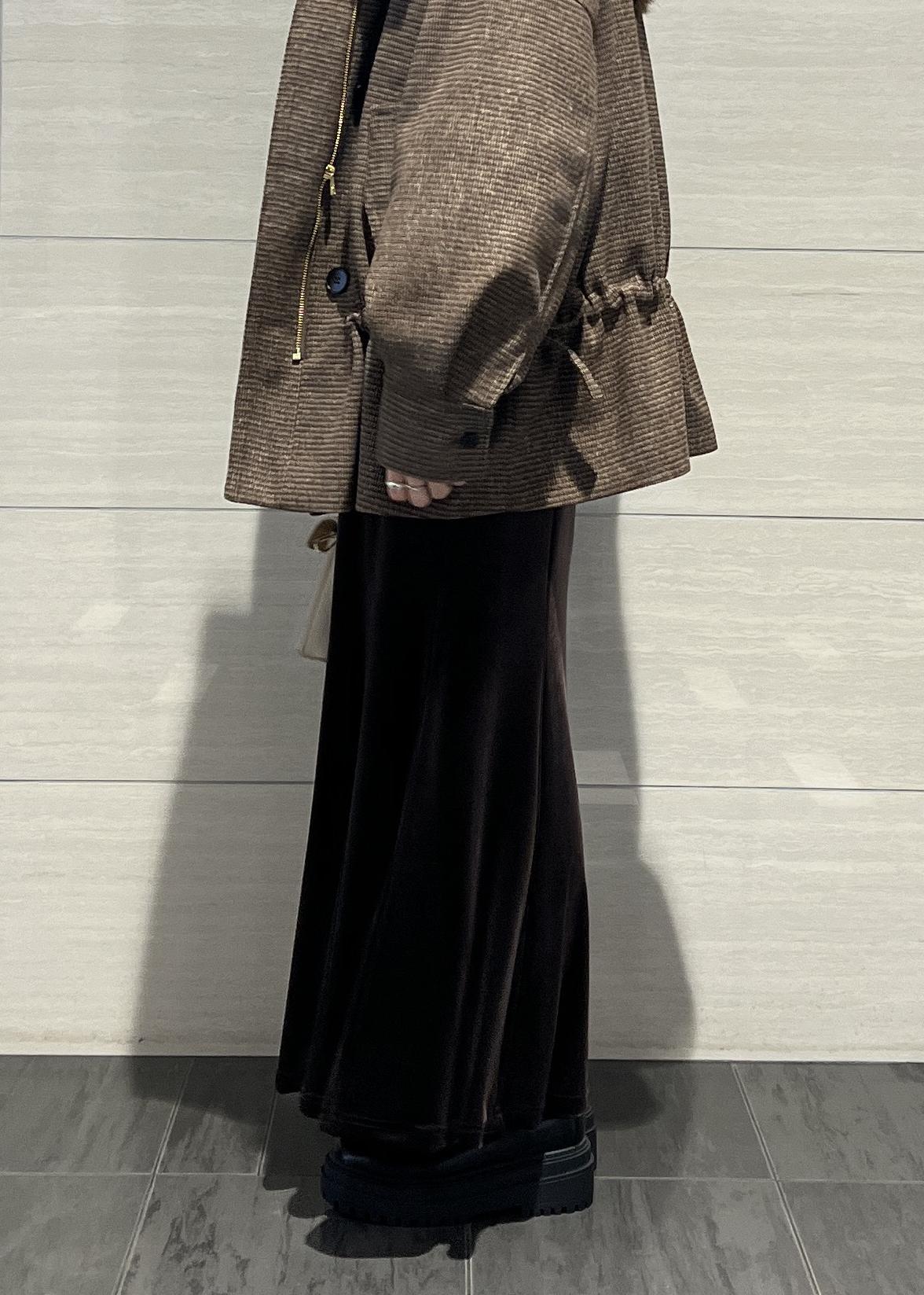 落ち感のあるベロア素材で、シルエットがとてもきれいでほどよいフィット感でラインを拾いすぎず、すっきり見えます。 -