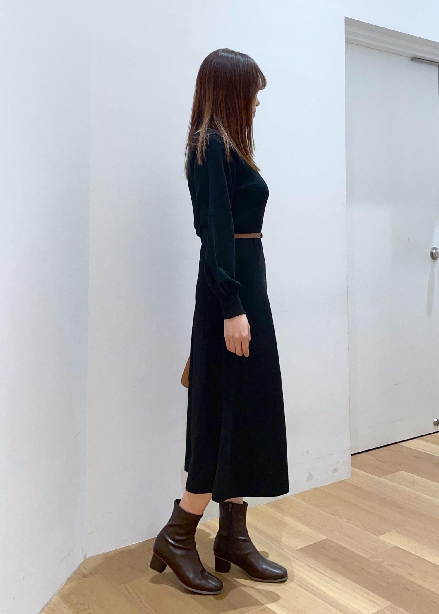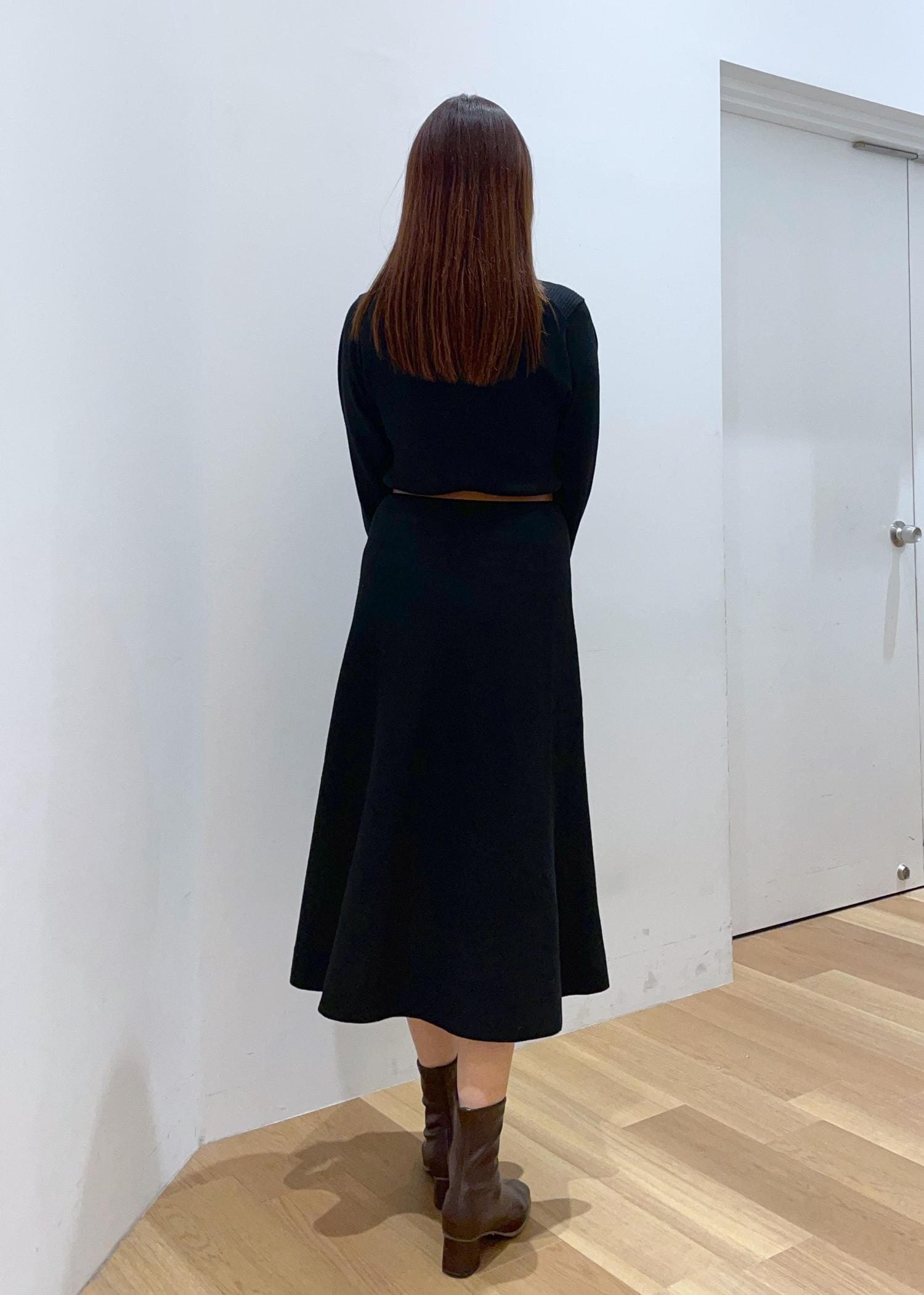 トップス部分は身体のラインが出るくらいですが、ウエストから裾に向かって広がるシルエットがとても綺麗です。 -
