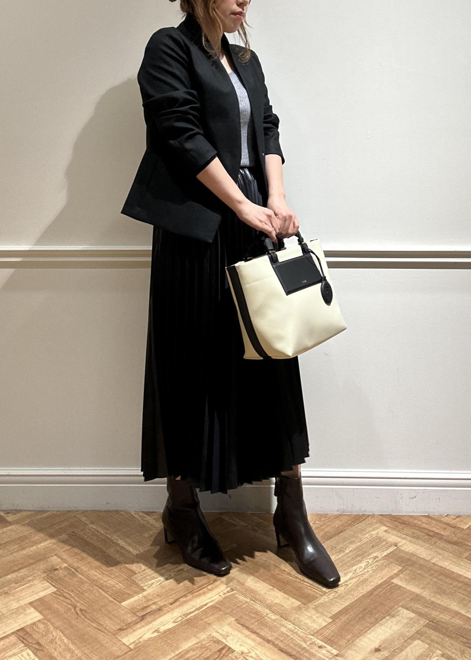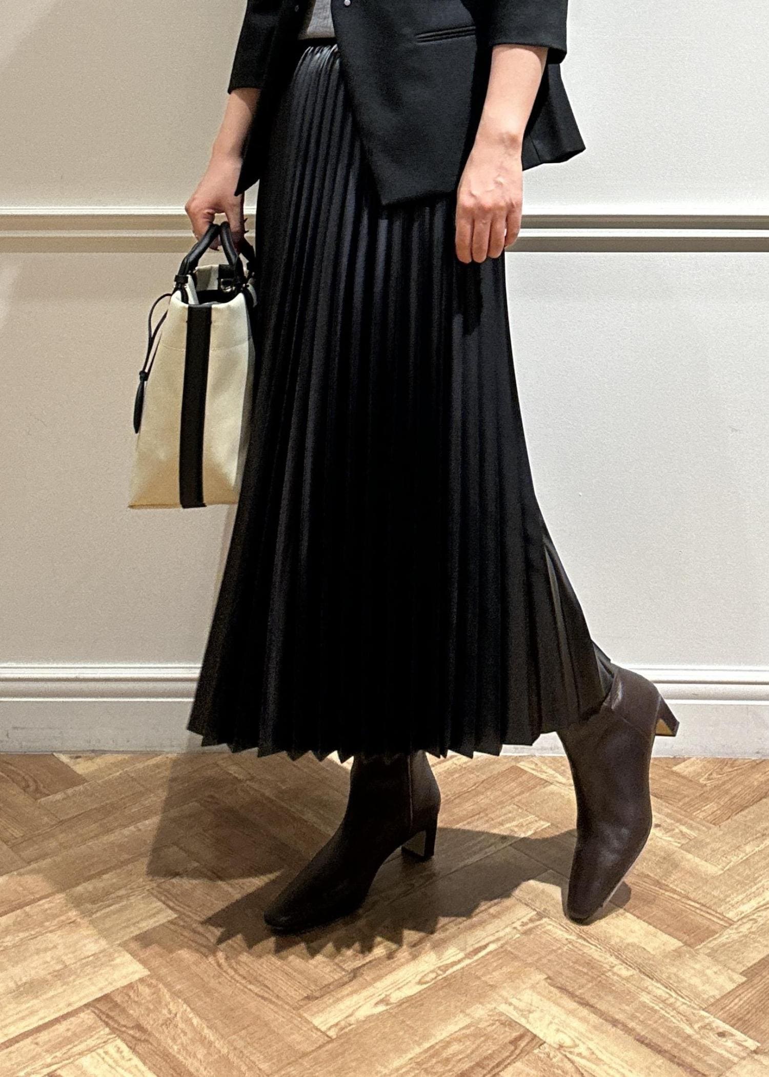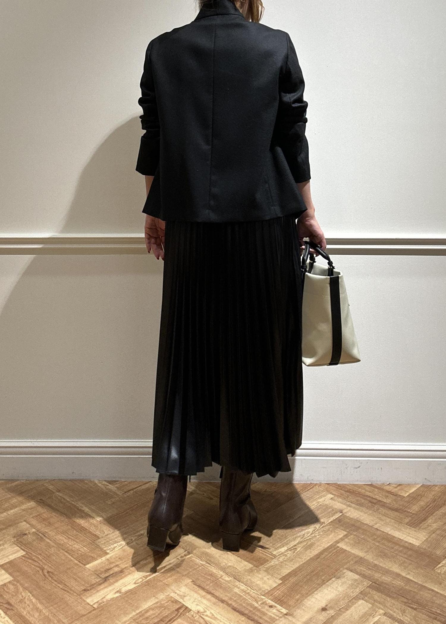 黒のジャケットにプリーツスカートで合わせてみました。