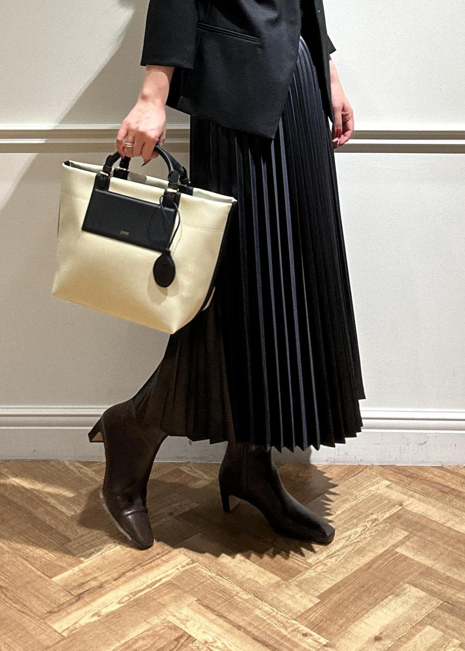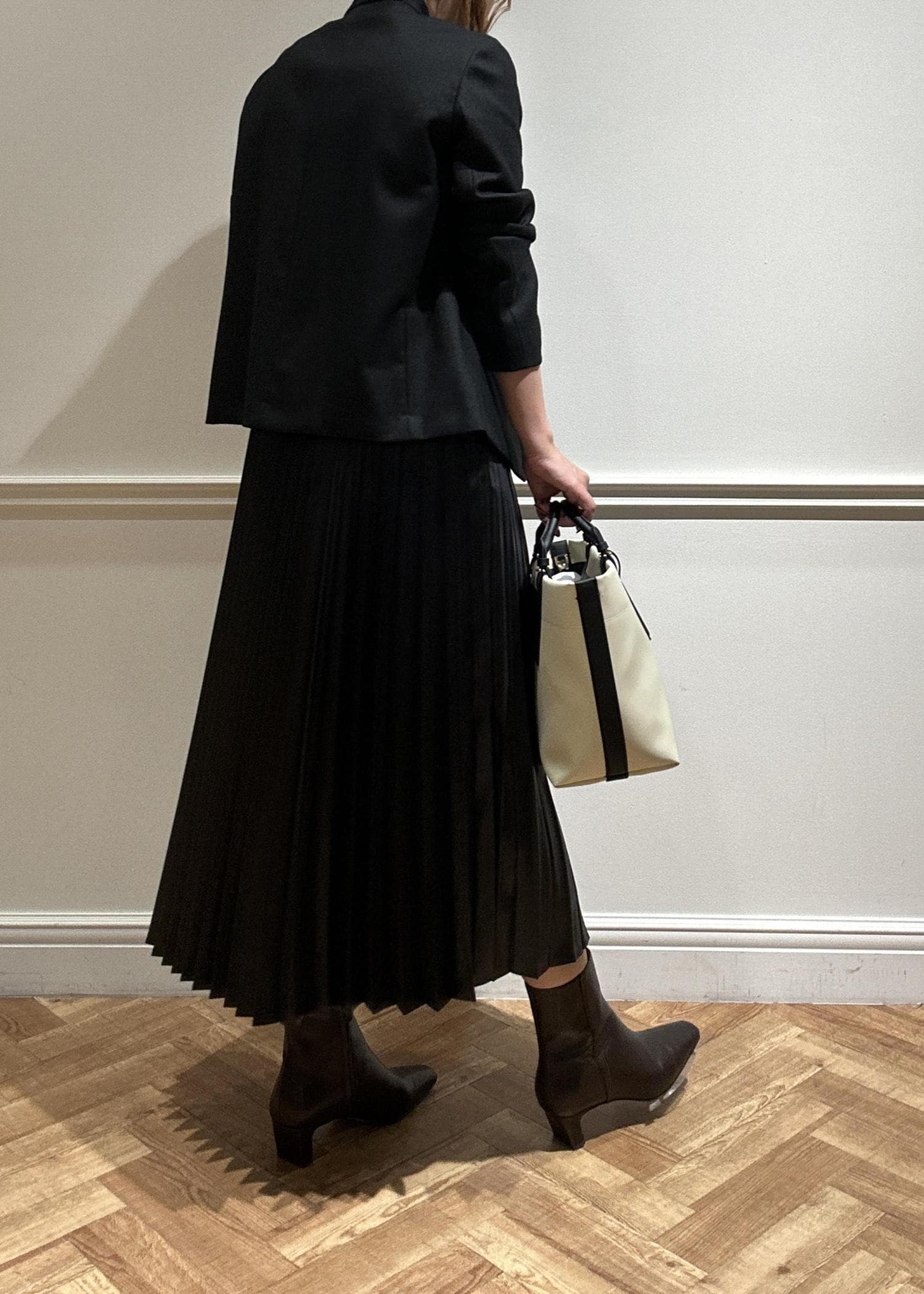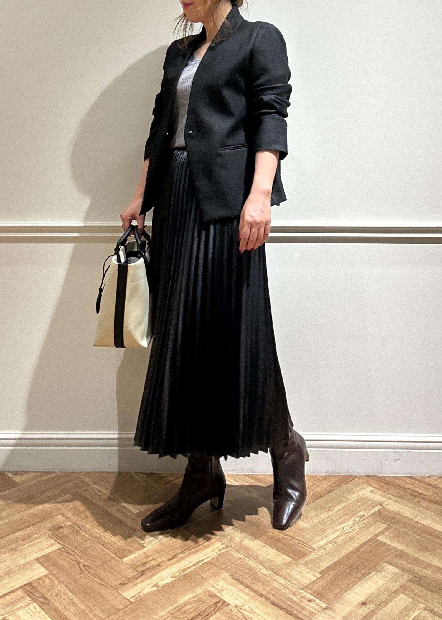 黒のジャケットにプリーツスカートで合わせてみました。