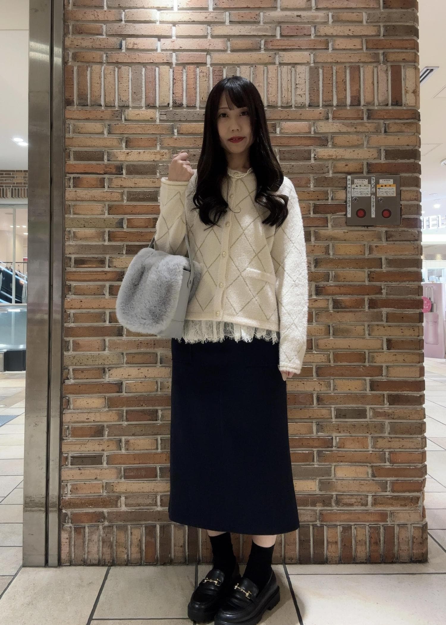 コートを脱いだらふわふわのフェザーカーディガンで柔らかい印象を与えてくれます!
