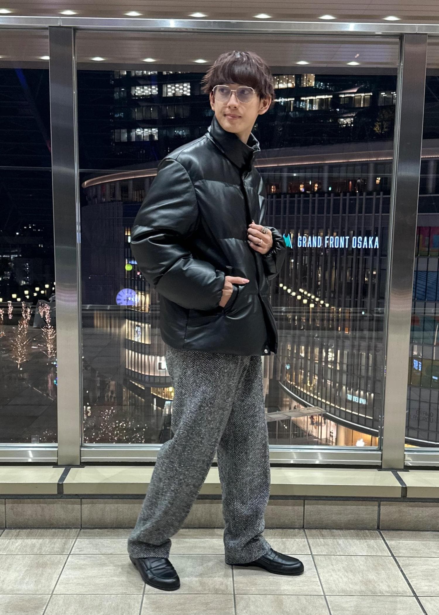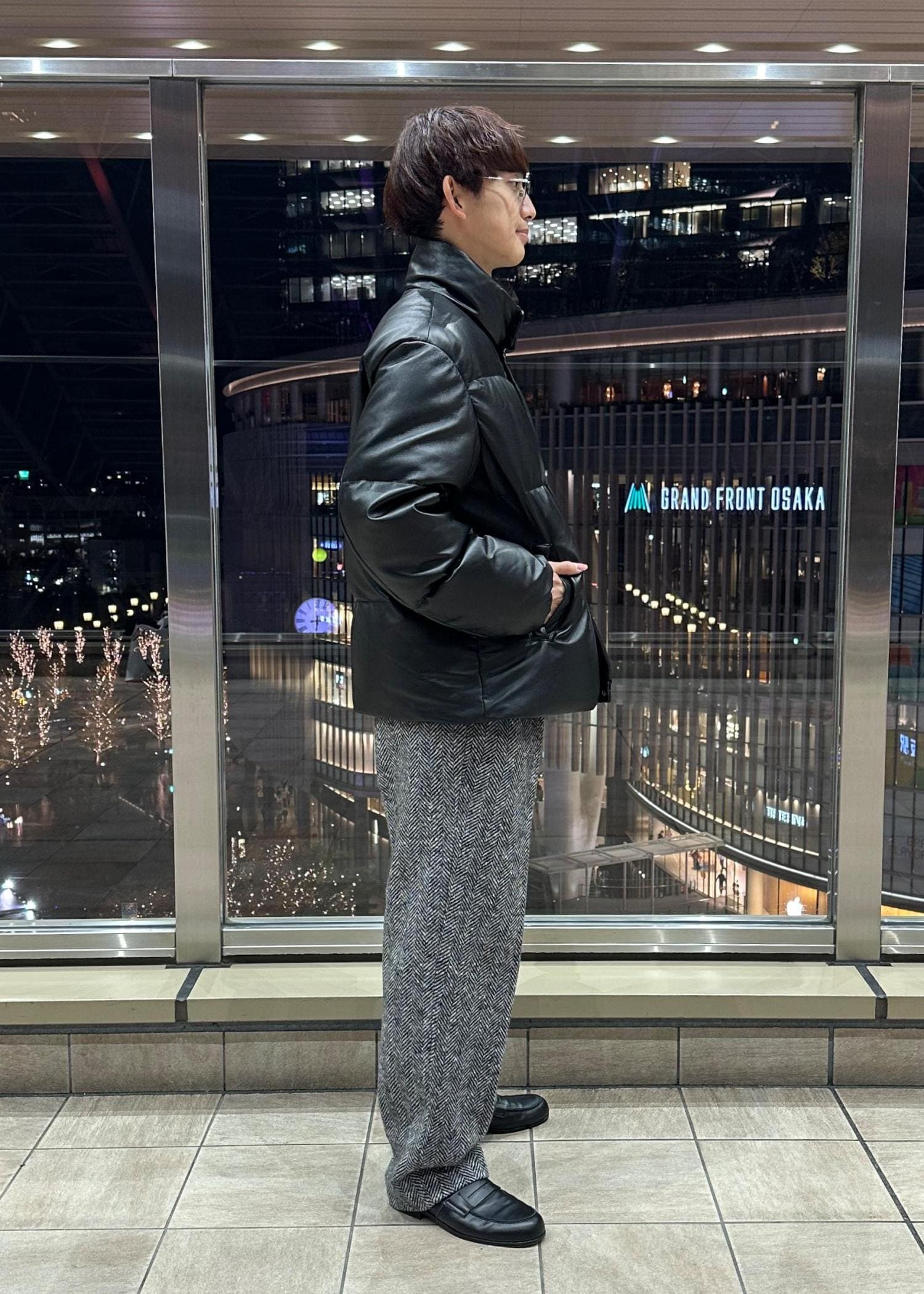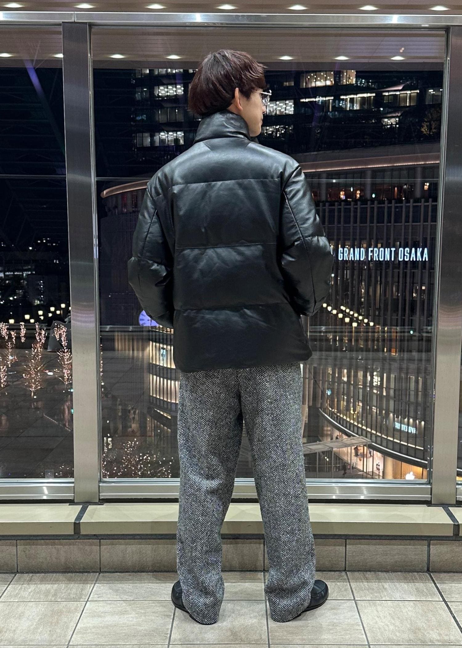 レザーダウンジャケットを主役にした大人っぽい雰囲気のコーデです。グレーのヘリンボーンパンツを合わせ、暗すぎないモノトーンコーデに仕上げました。強すぎないコーデにするため、インナーはカシミヤのニットを着ました。冬のシンプルコーデとして参考にしてみてください。