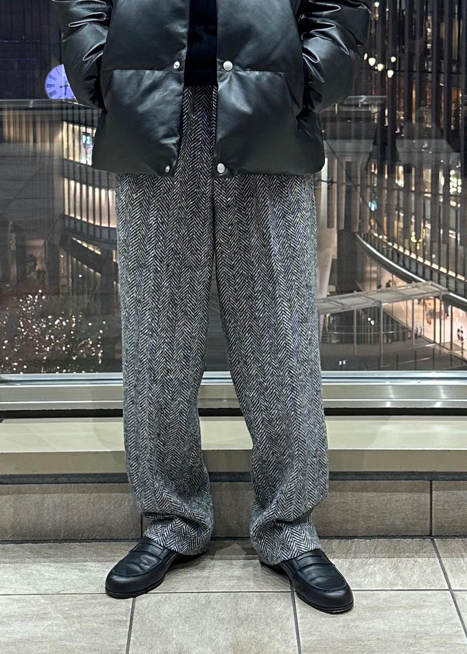 ヘリンボーン柄のスラックス。やや長めの丈感、テーパードシルエットで下にきれいに落ちるラインです。上品でクラシカルな雰囲気ながらもカジュアルなスタイリングやスニーカーなどとも相性良く、合わせやすいです。 -