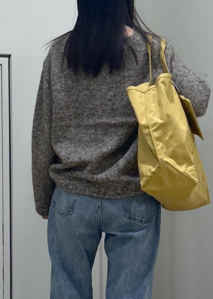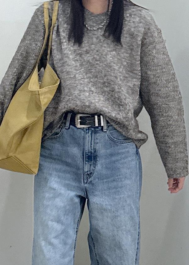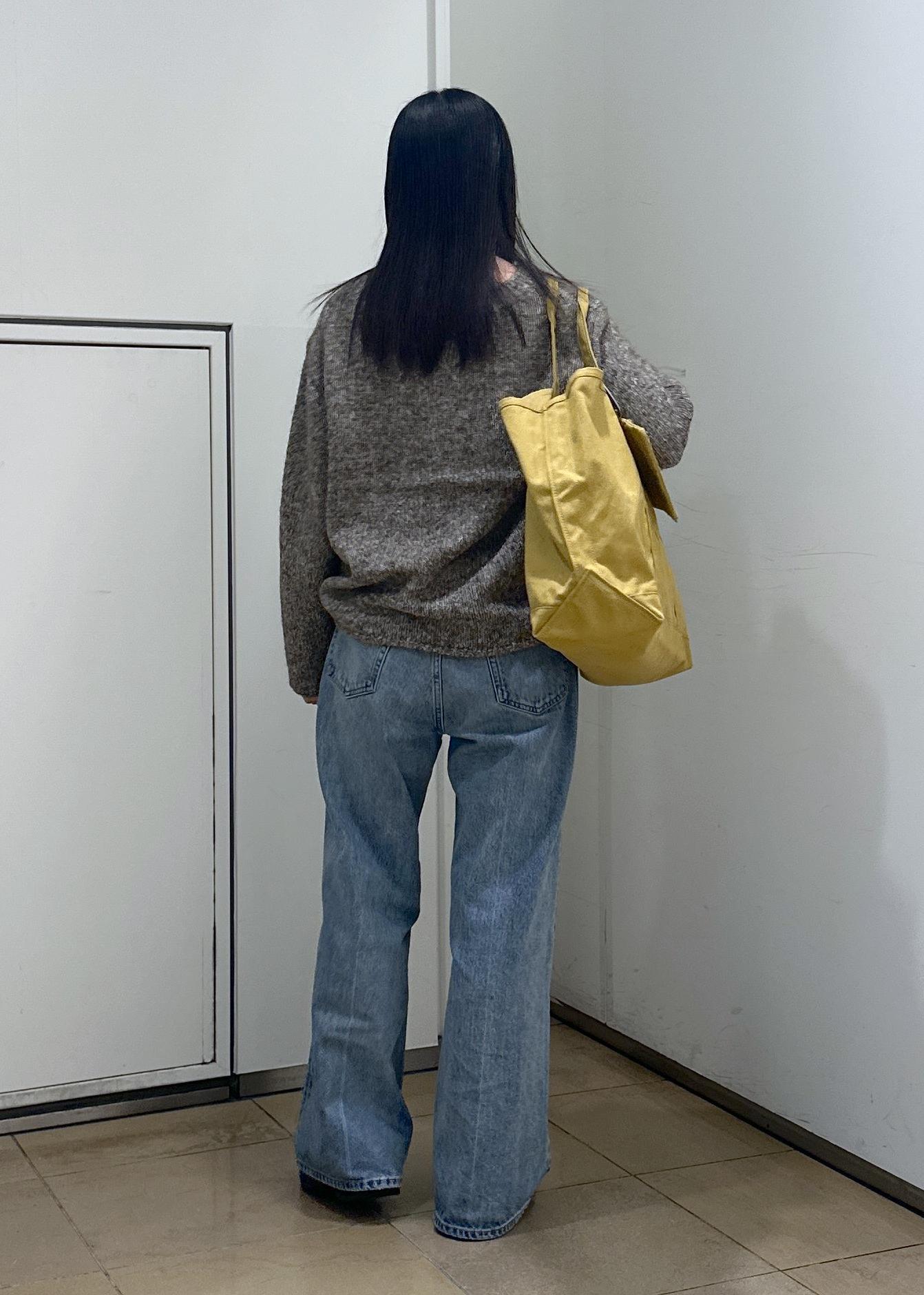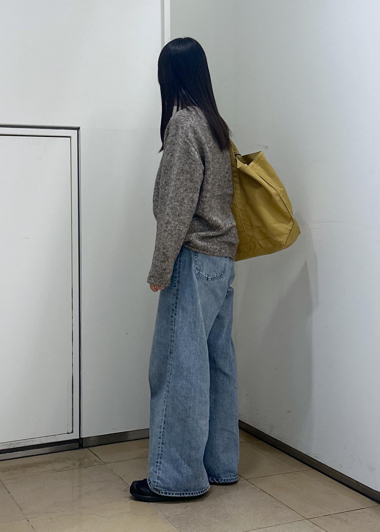 ふんわりとしたメランジニットに、脚のラインを拾わないバギーデニムを合わせてこなれた雰囲気に。抜け感のあるVネックで顔まわりがすっきり見えるのも嬉しいポイント。