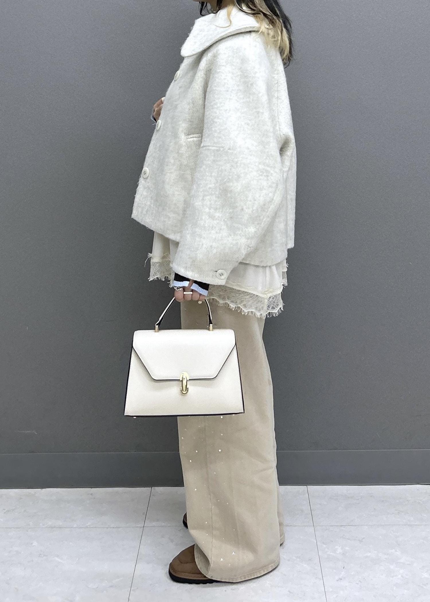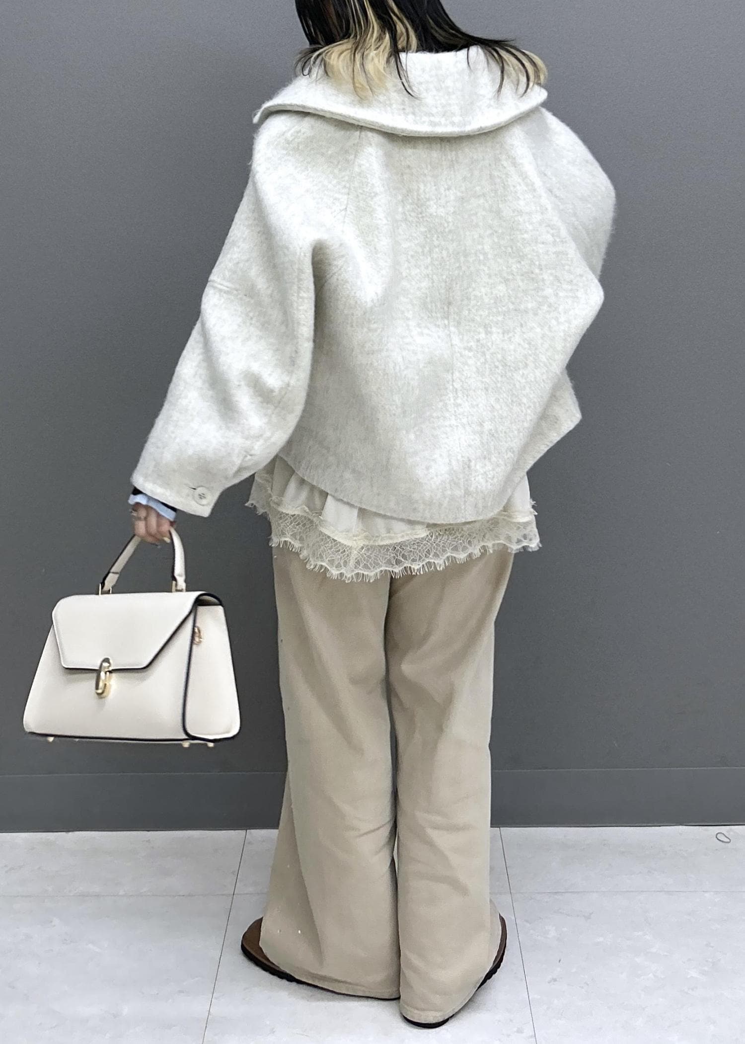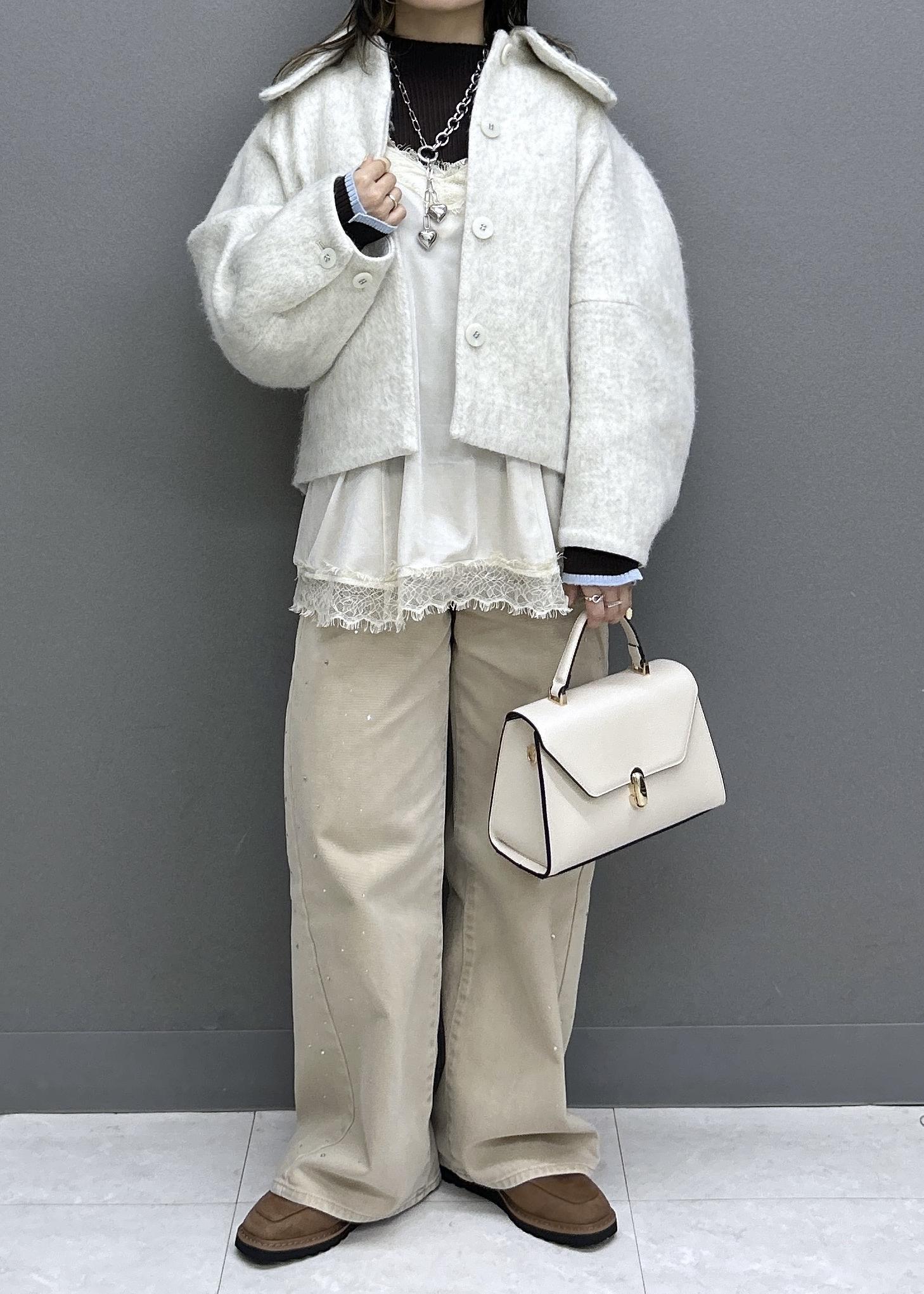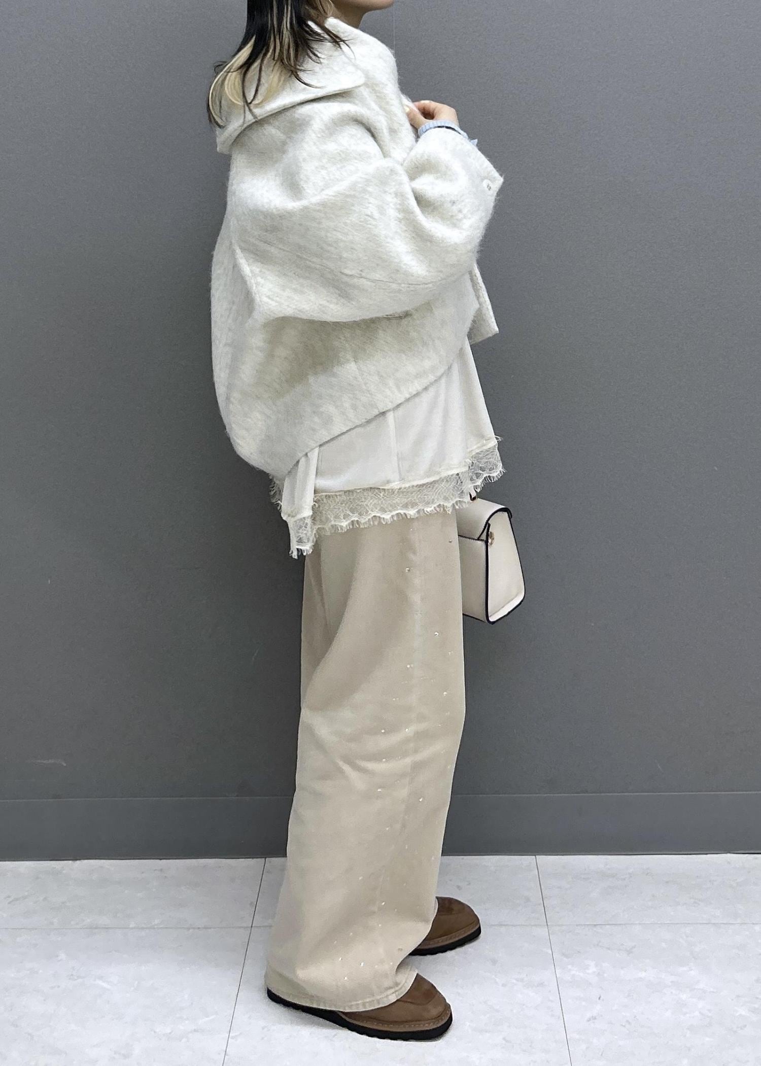 ホワイト系のワントーンは着膨れて見えないか心配でしたが、アウターのシルエットが綺麗+顔の近くに濃いブラウンを合わせることでコーデがグッと引き締まりました◎