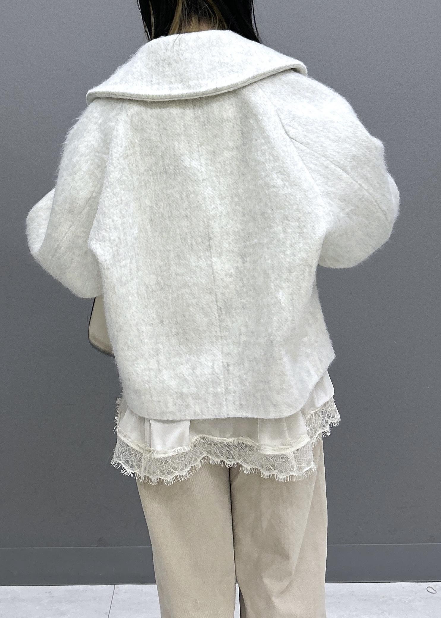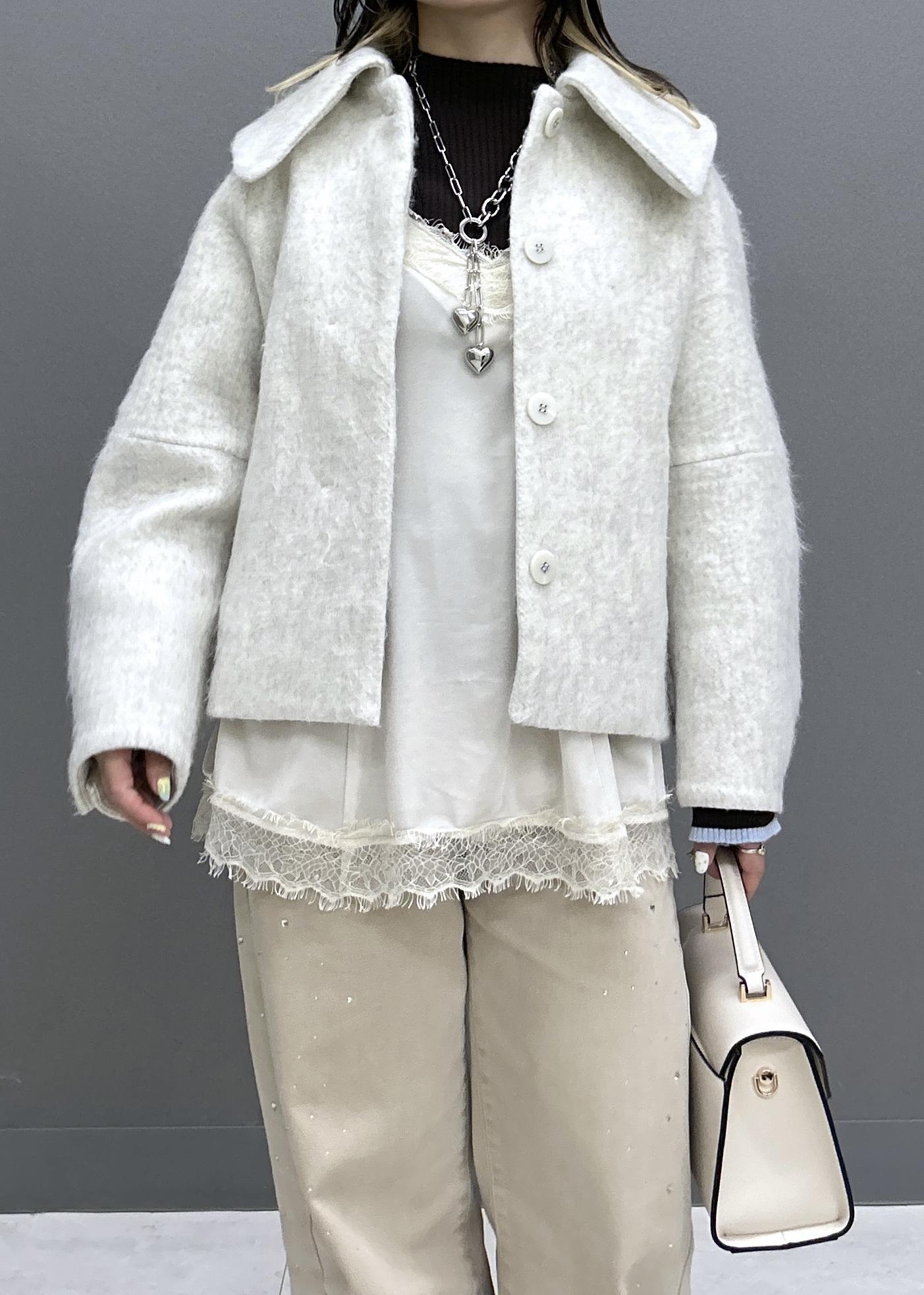予約VIS【アウター総選挙1位】ビッグカラーモモンガシャギーショートコートオフホワイト / S¥10,989レビュー157cmでSサイズでもお尻にかかるくらいの着丈でした。