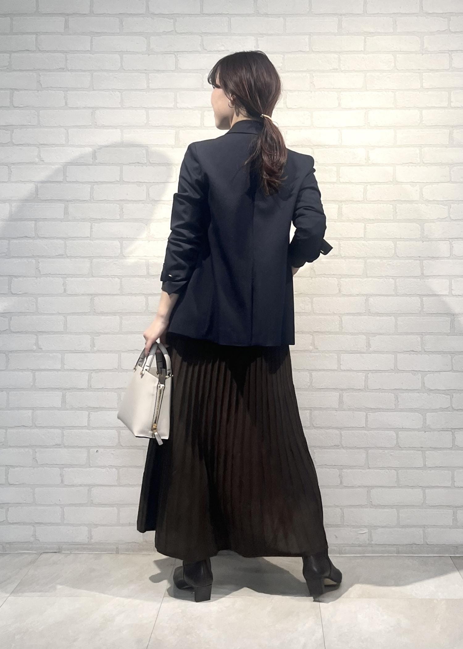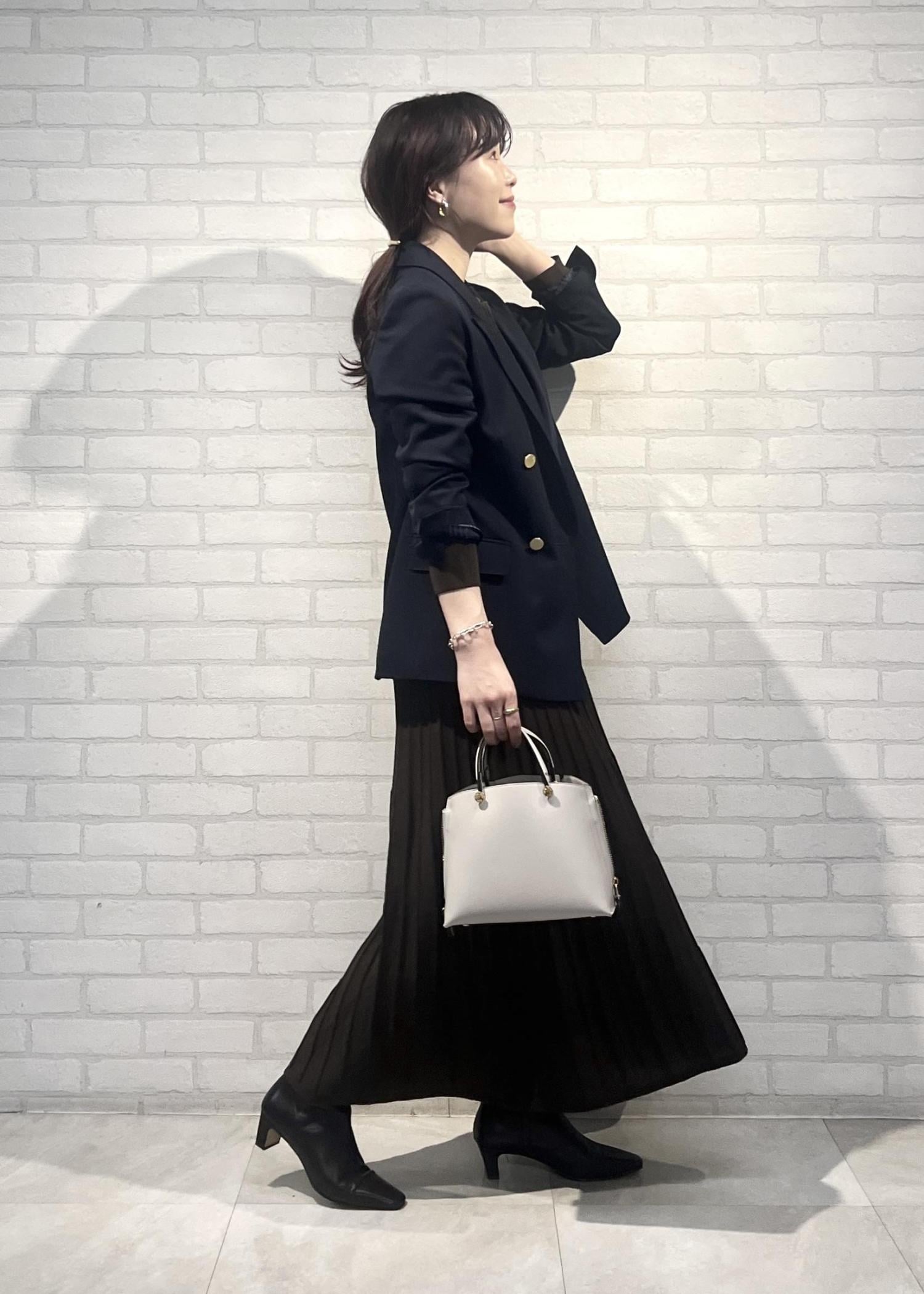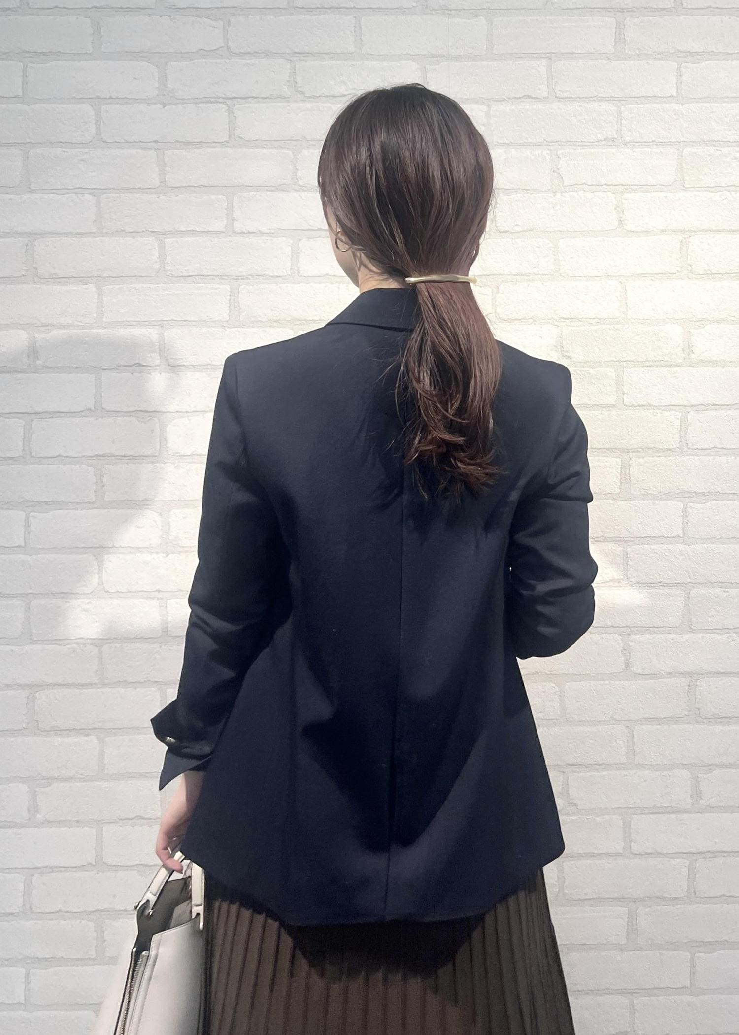 袖丈は手首が隠れるくらいの短めで、袖幅やアームホールもコンパクトなので厚手のニットを着るとやや窮屈感がありました。ブラウスやハイゲージニットだと違和感なく着ていただけます♪