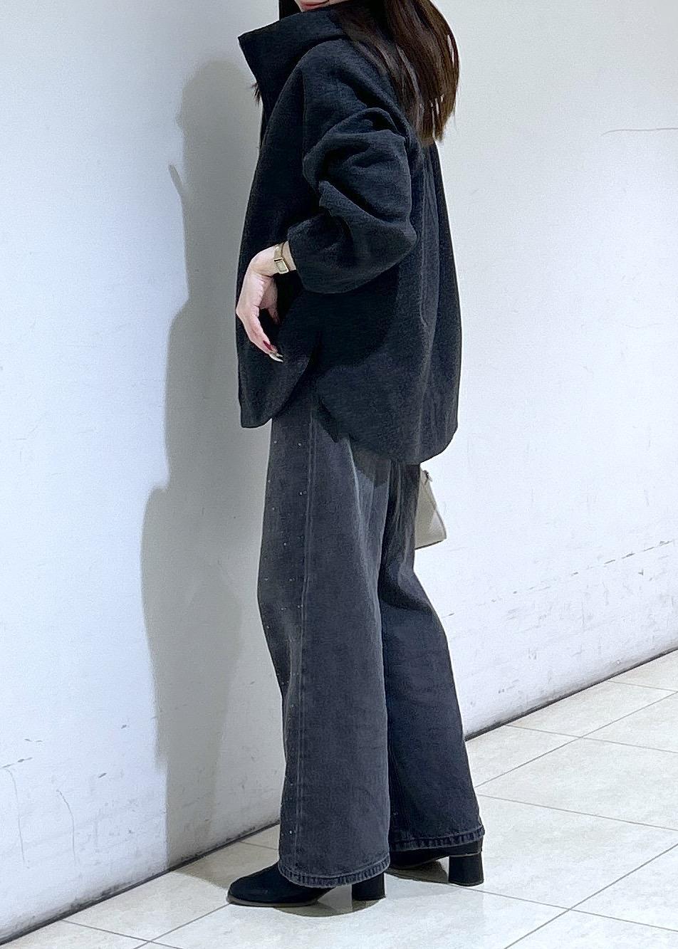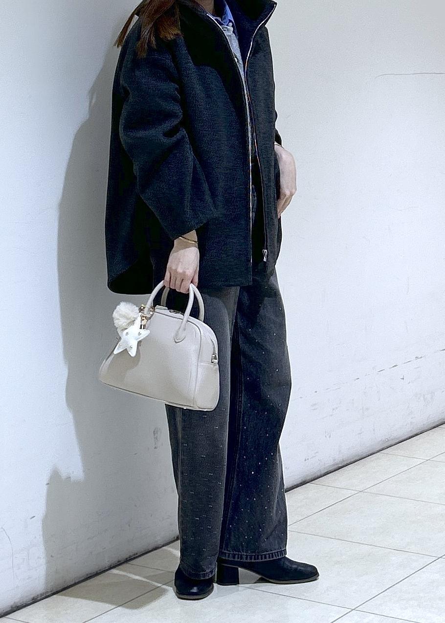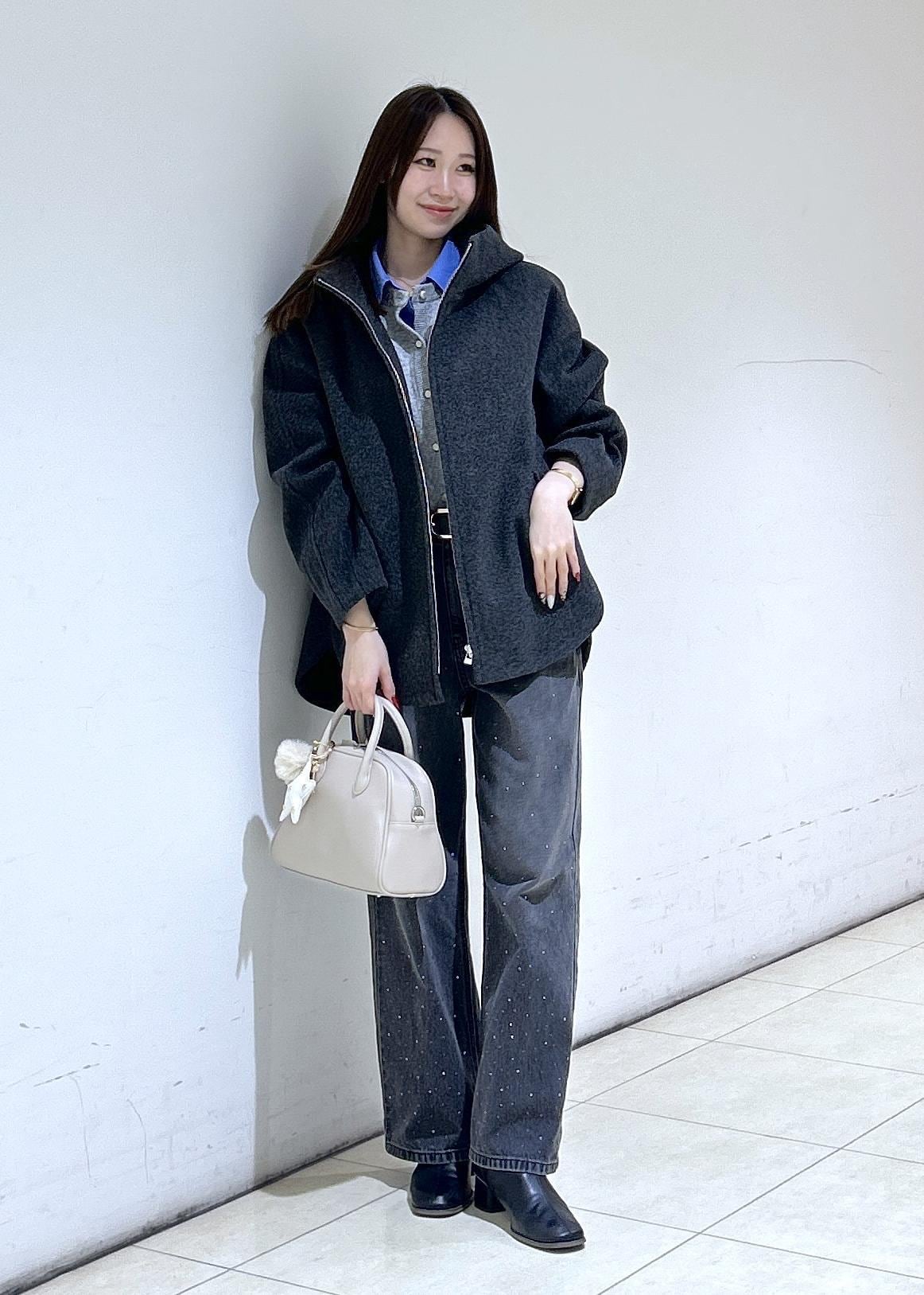 グレーのアウターにキラキラデニムで秋冬お出かけスタイリングにしました。