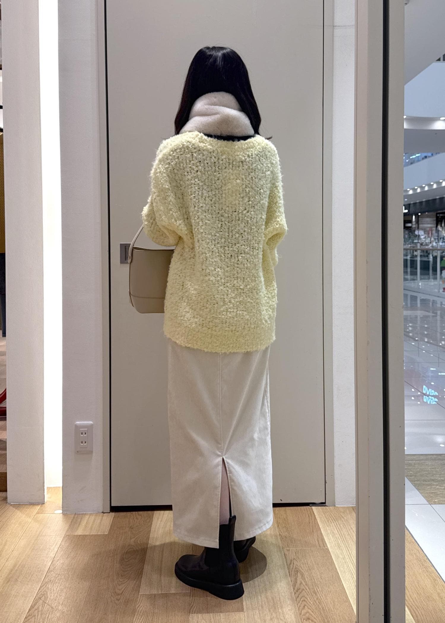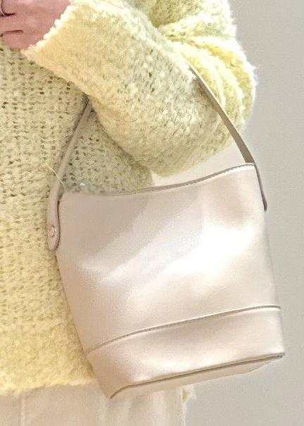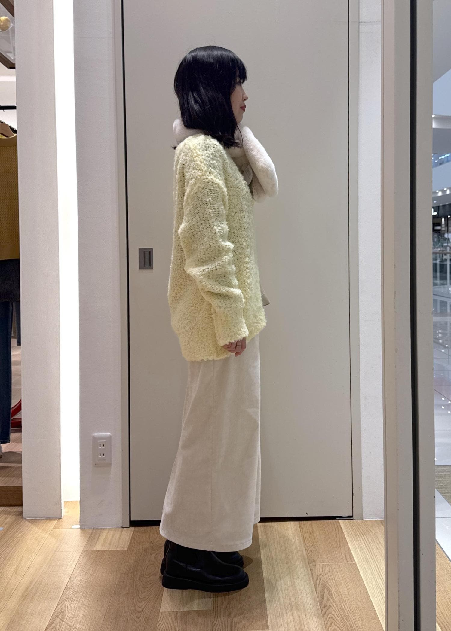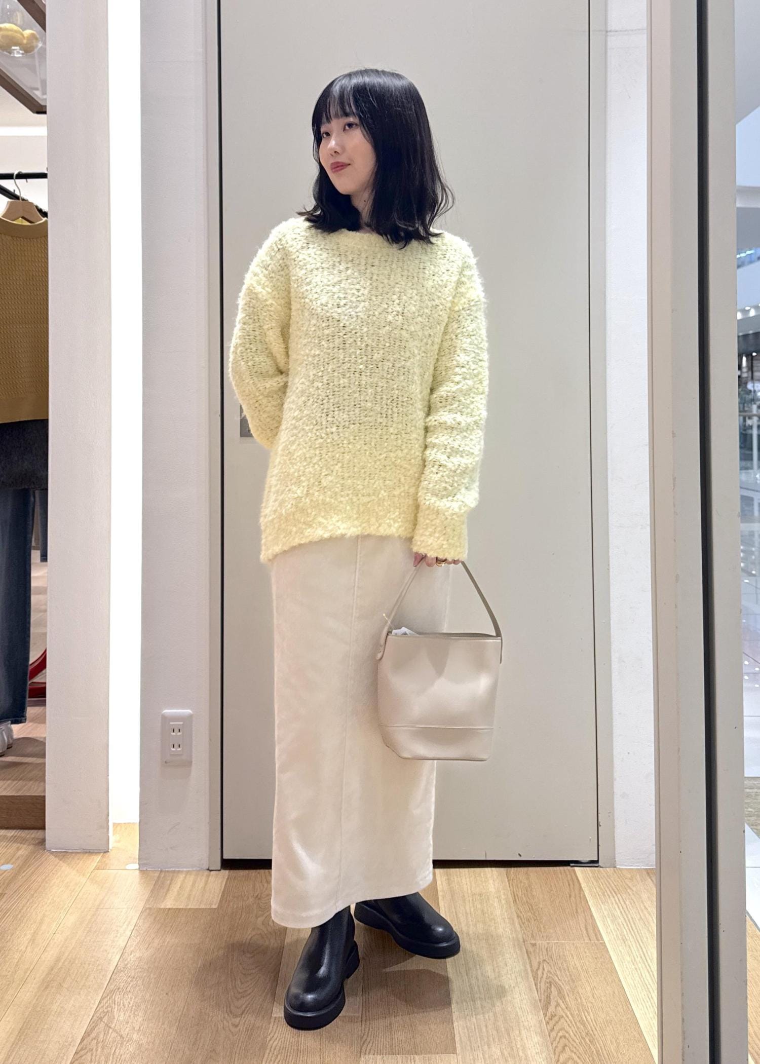 イエローが映えるぽこぽこニットに、上品なアイラインスカート合わせたフェミニンコーデです。