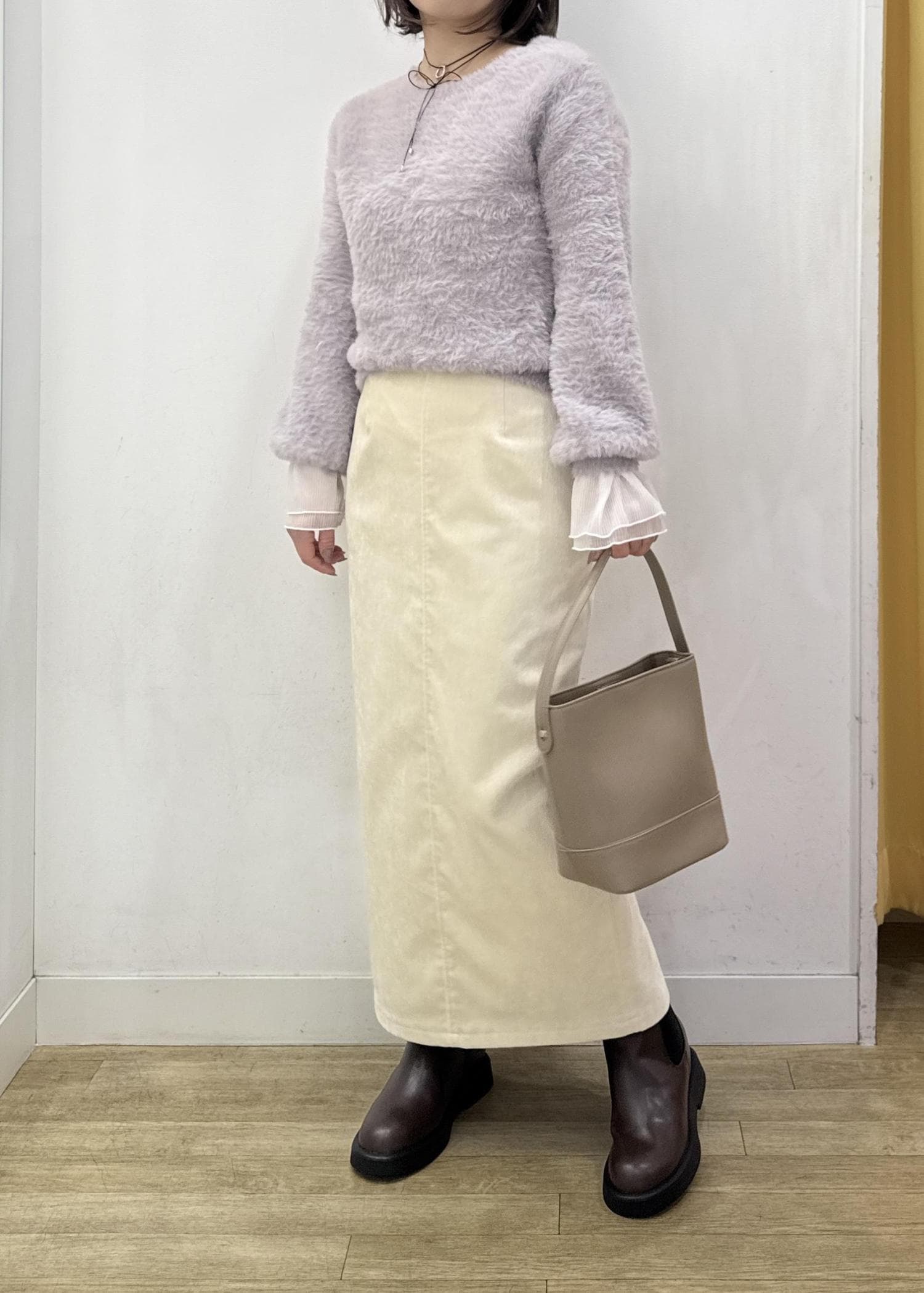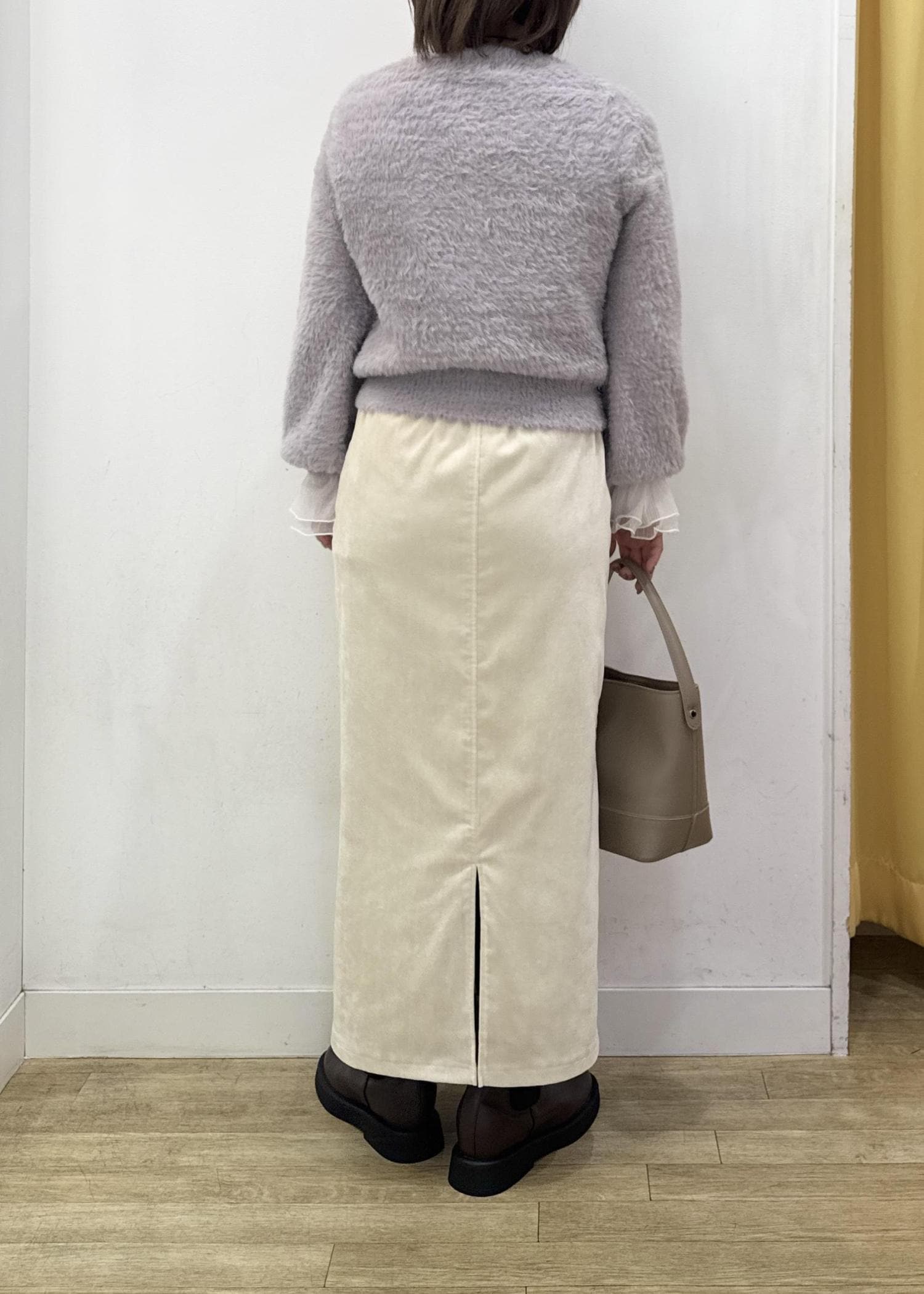 ショート丈で、もこもこニットでもスッキリとした印象で着ていただけます。 -