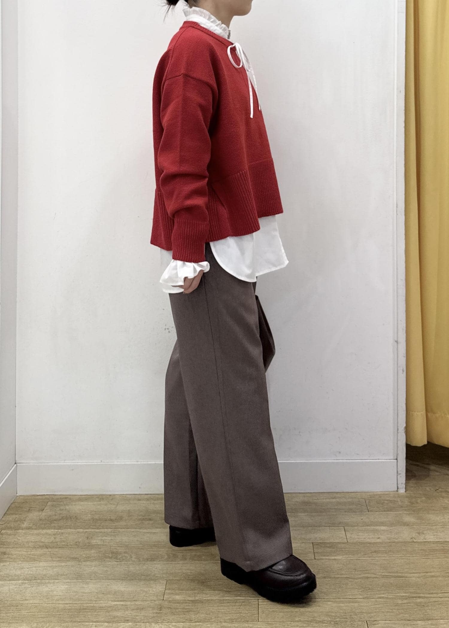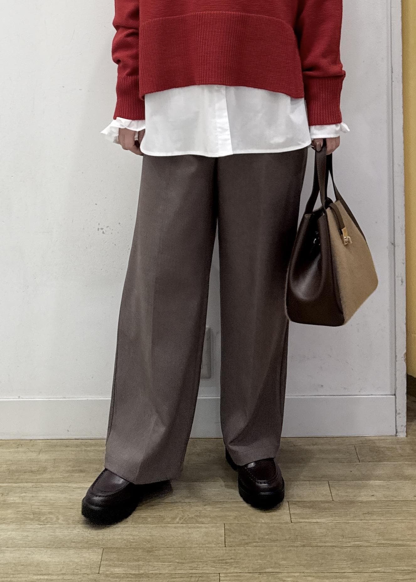 素材感は程よく厚みもあり、脚のラインを気にせずに穿けるゆったりシルエットです。 -