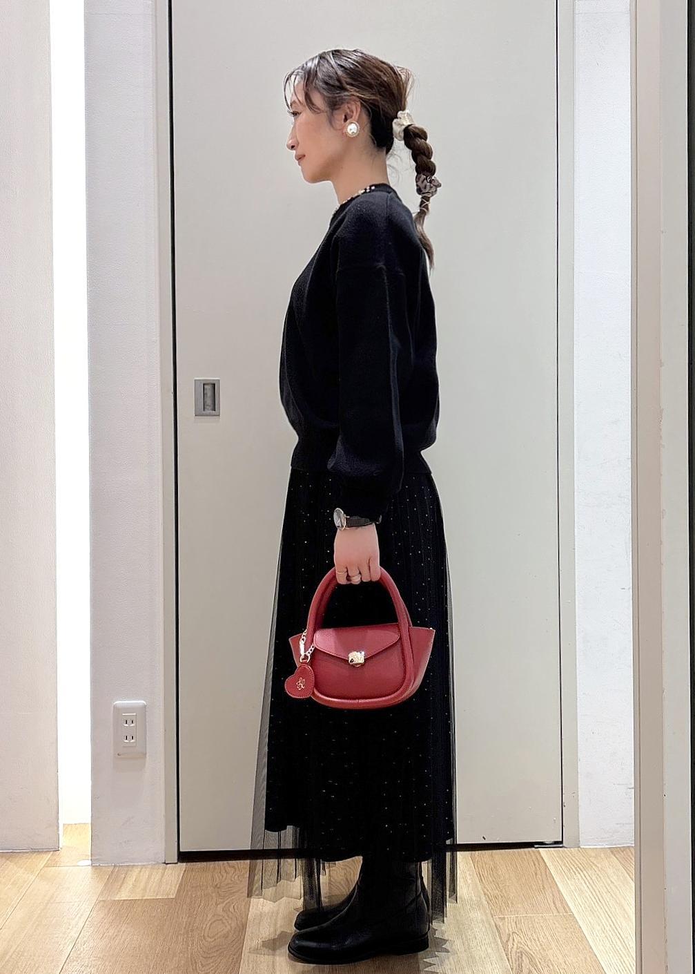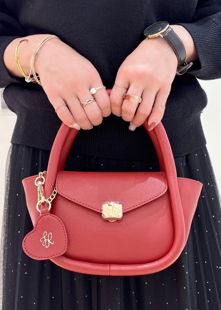 ハートチャームとビビッドな赤が可愛いミニサイズバッグは、オールブラックコーデによく映えるおすすめアイテムです。
