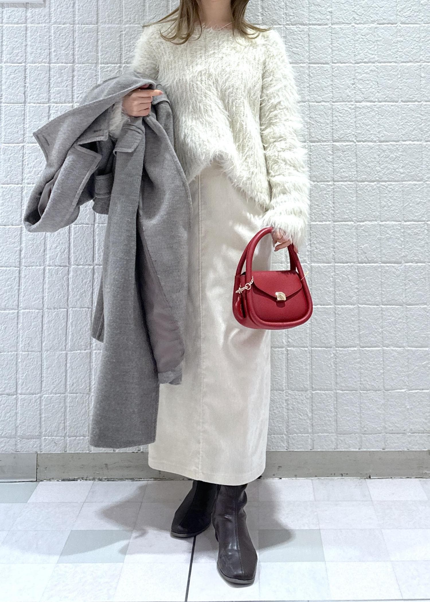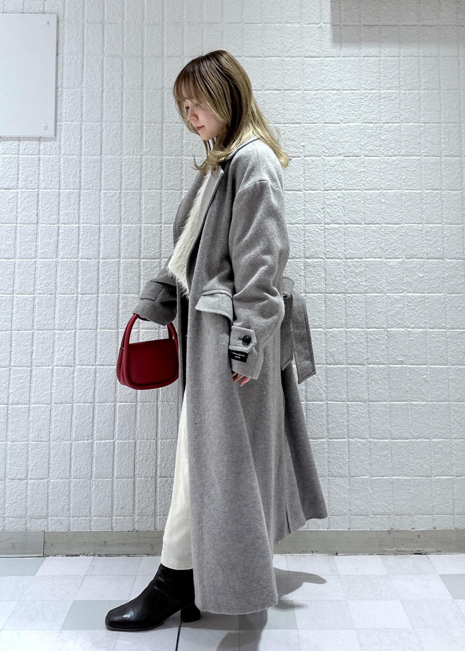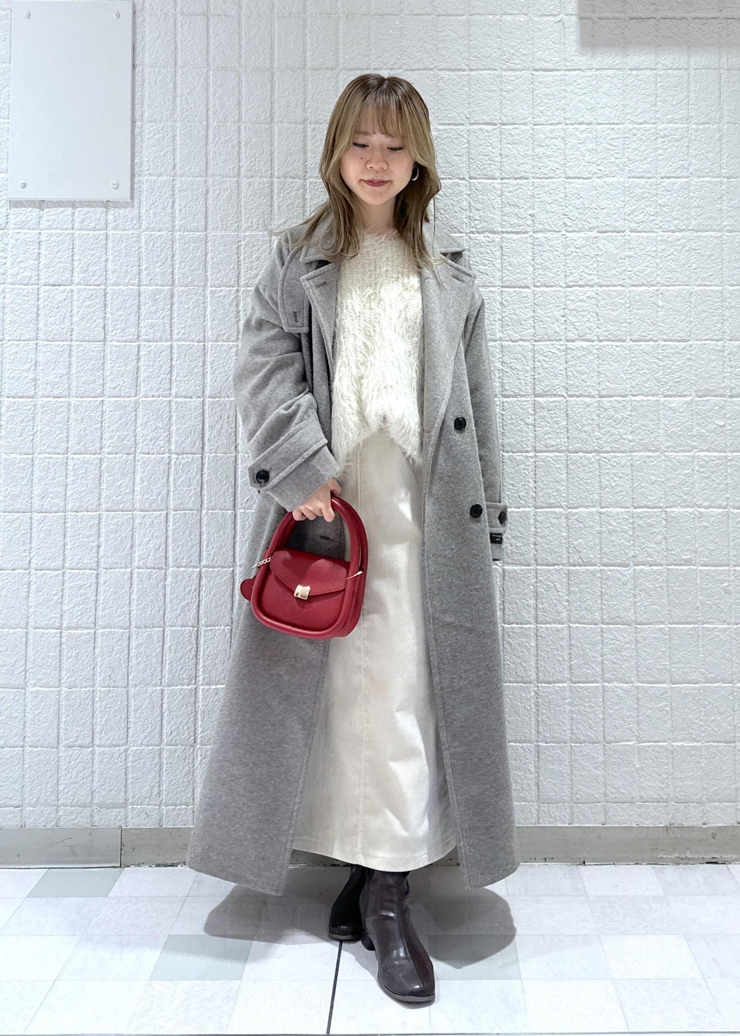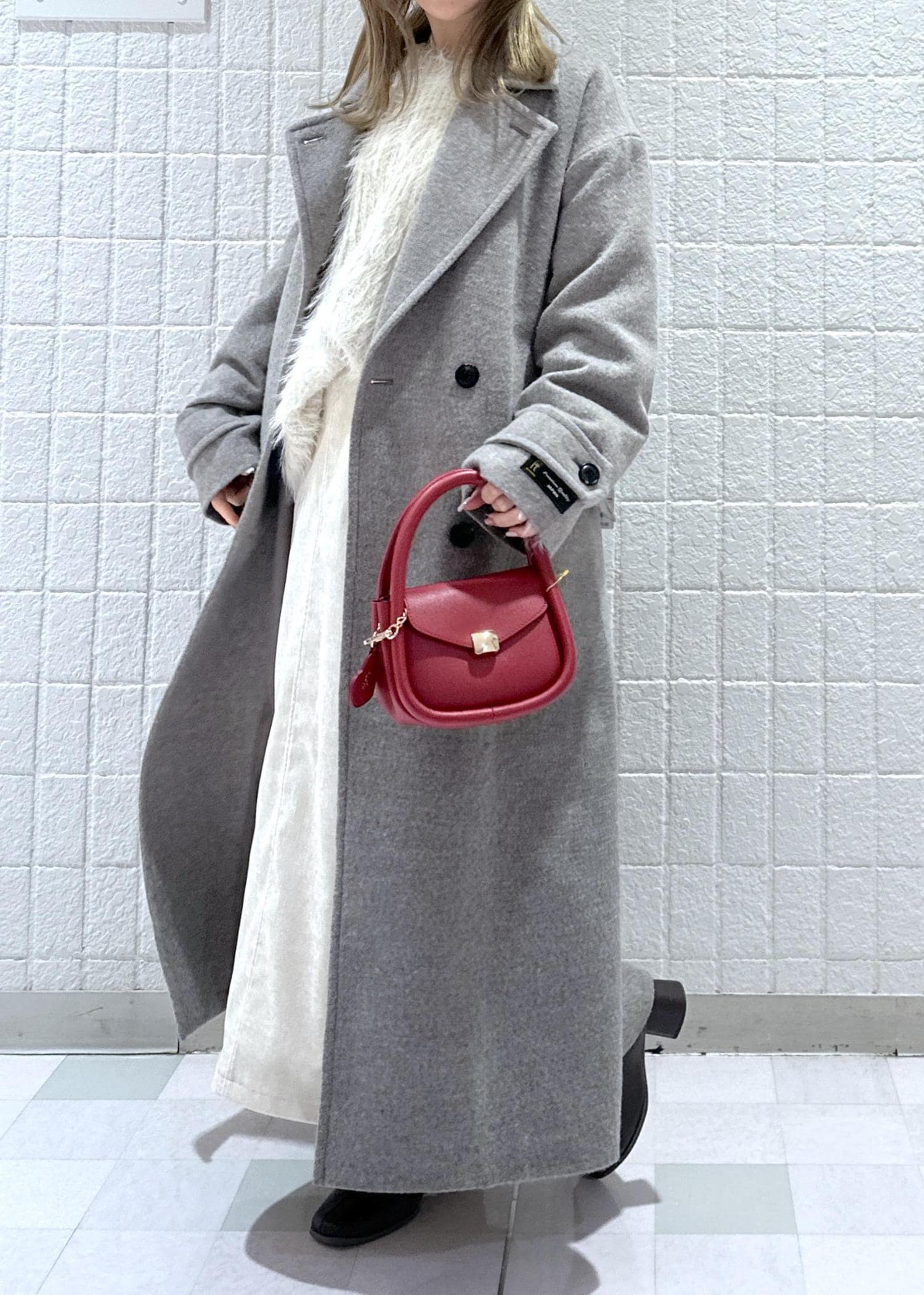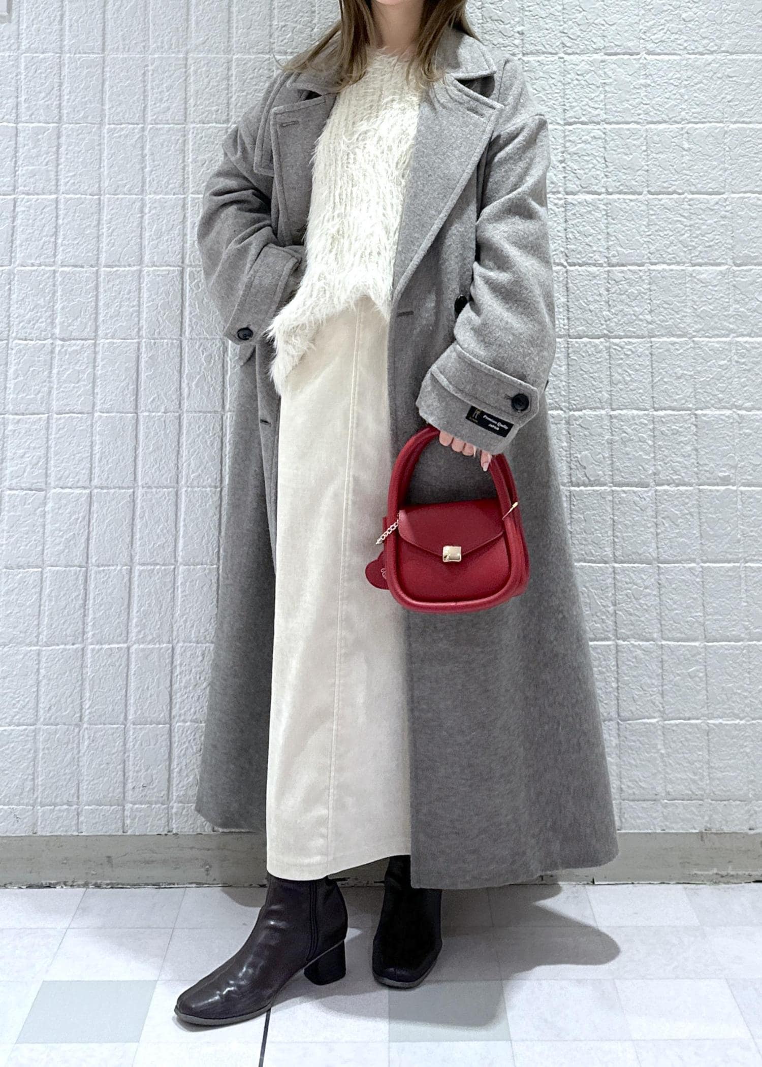 暖かみのあるロングコートで大人っぽく、シンプルなので赤のバッグを差し色に、クリスマスらしいコーディネートにまとめました。