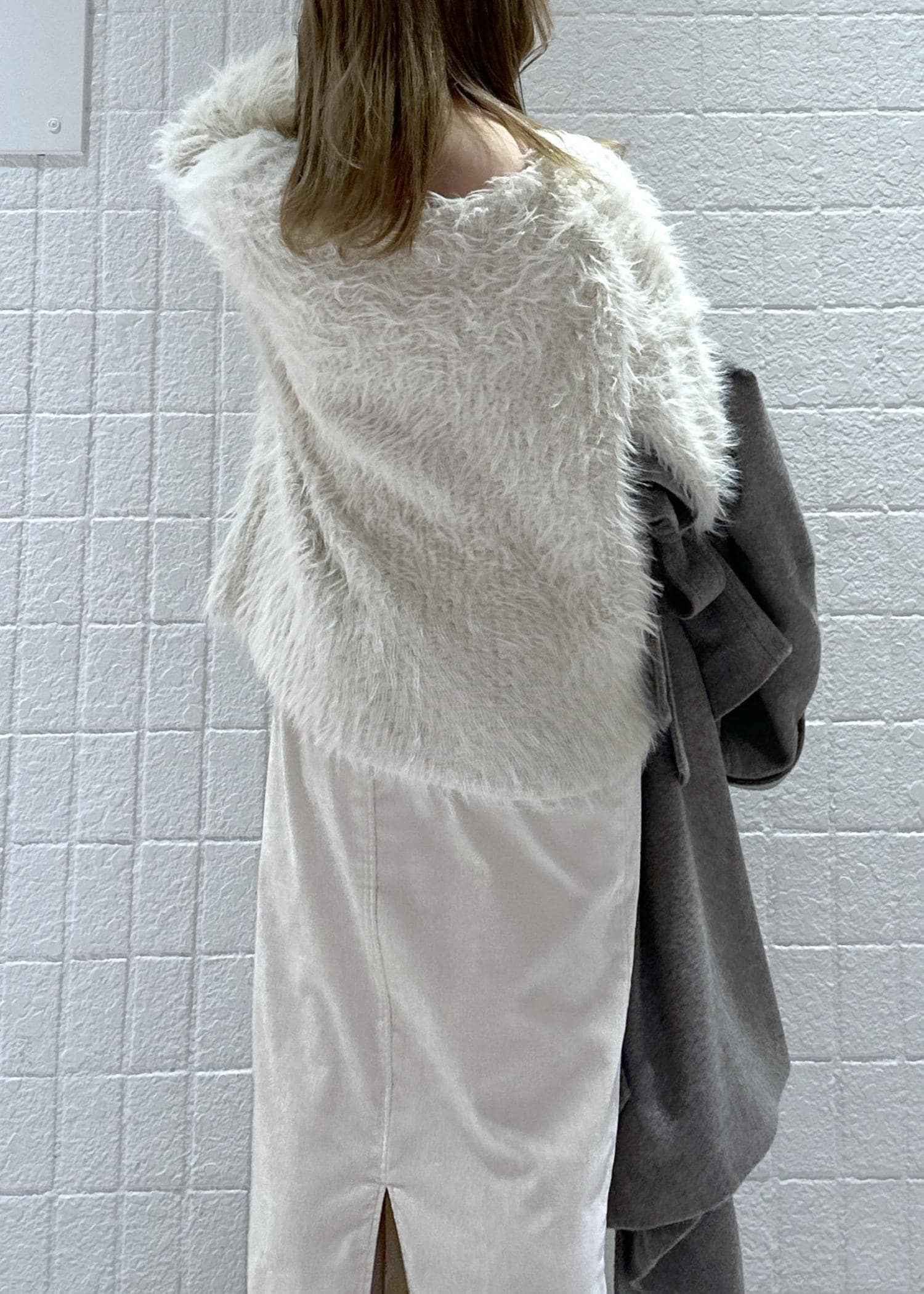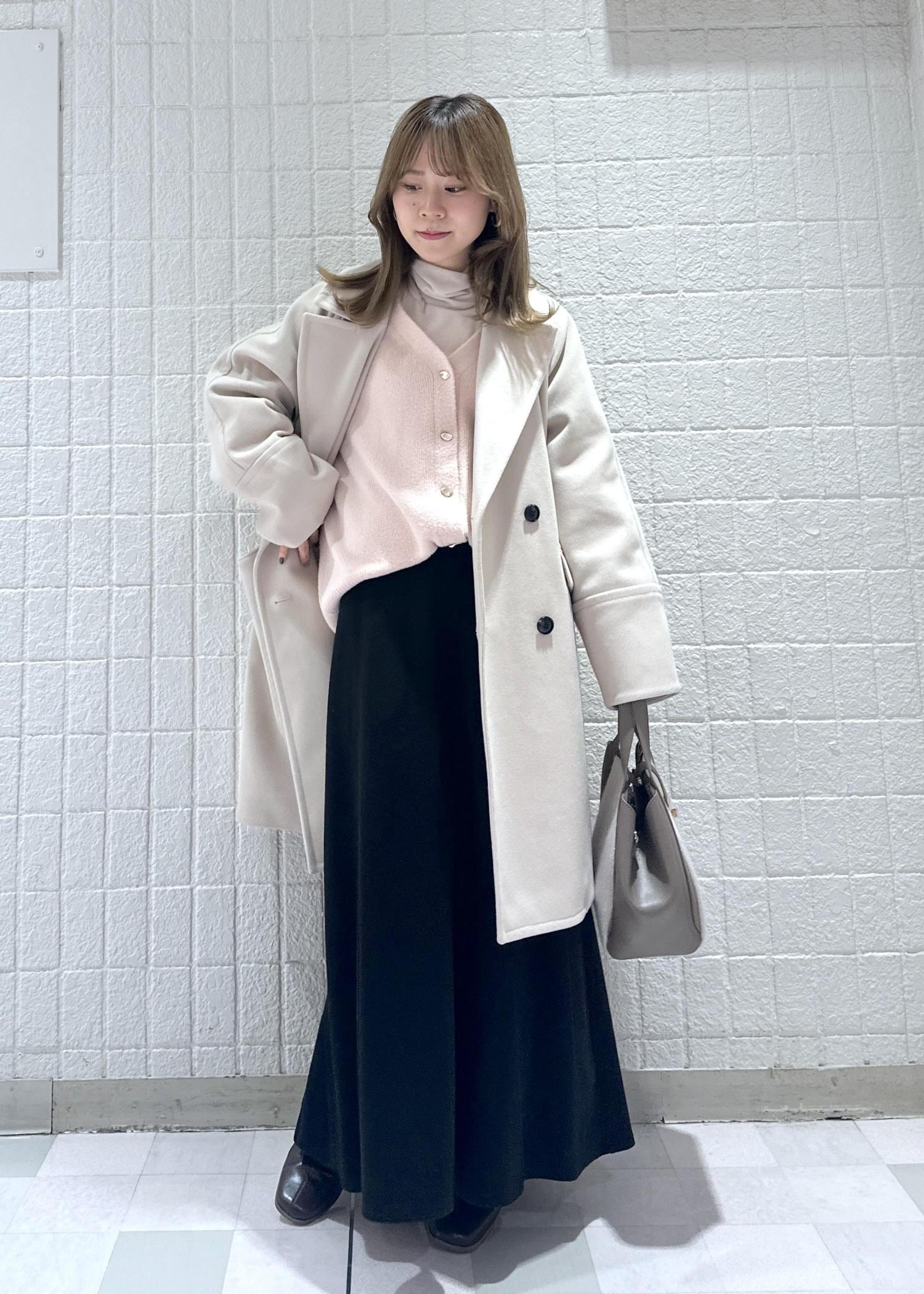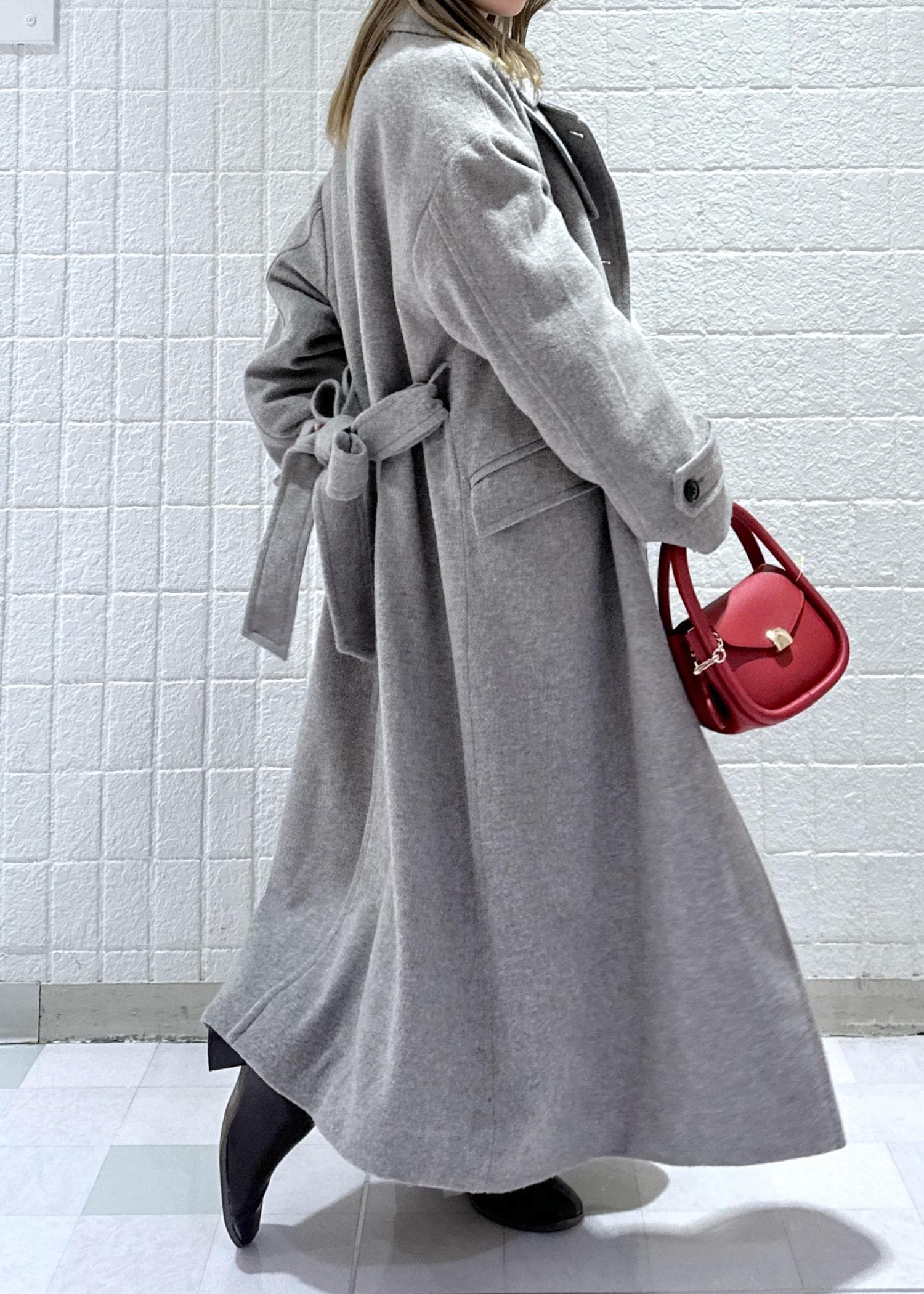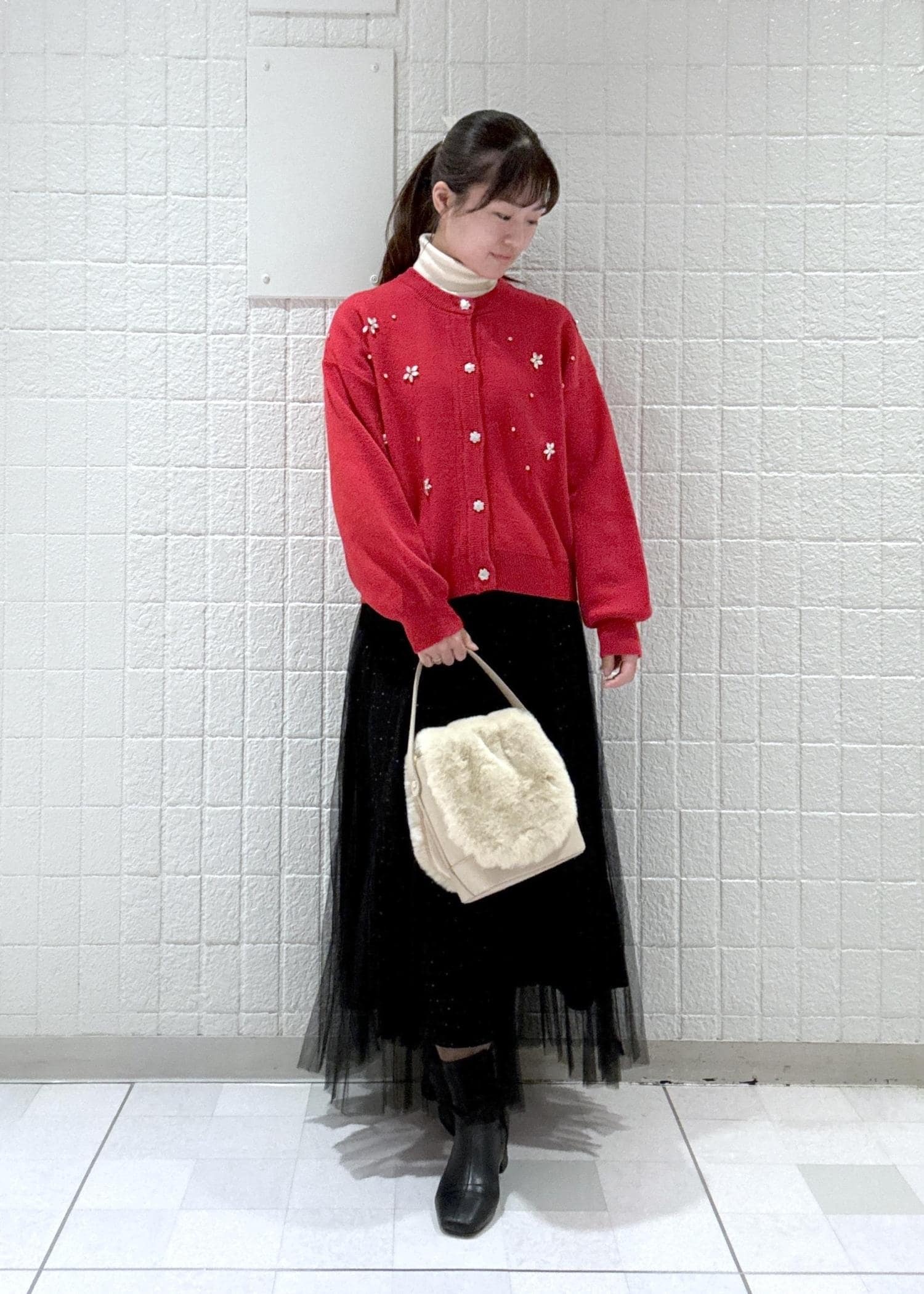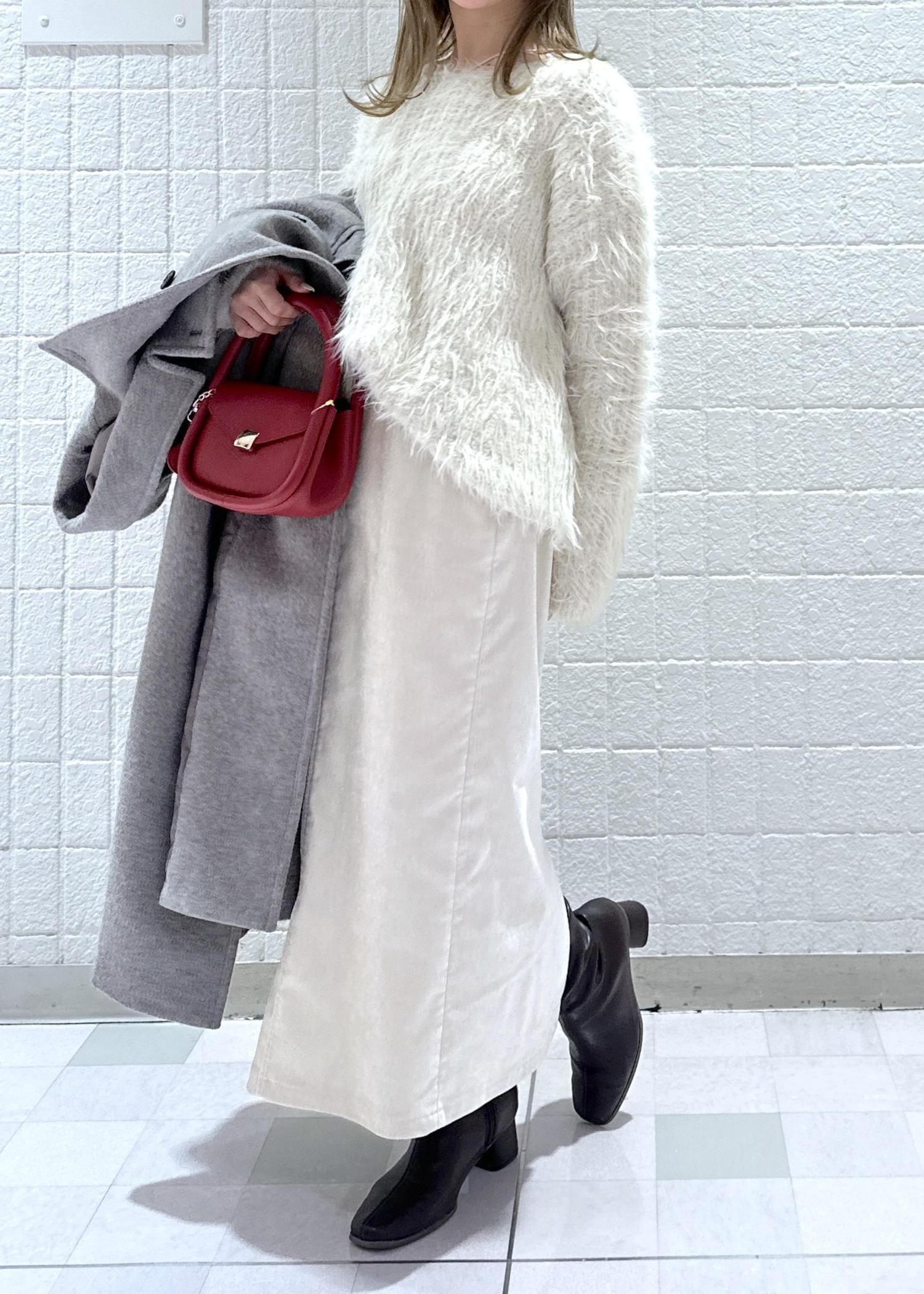 暖かみのあるロングコートで大人っぽく、シンプルなので赤のバッグを差し色に、クリスマスらしいコーディネートにまとめました。