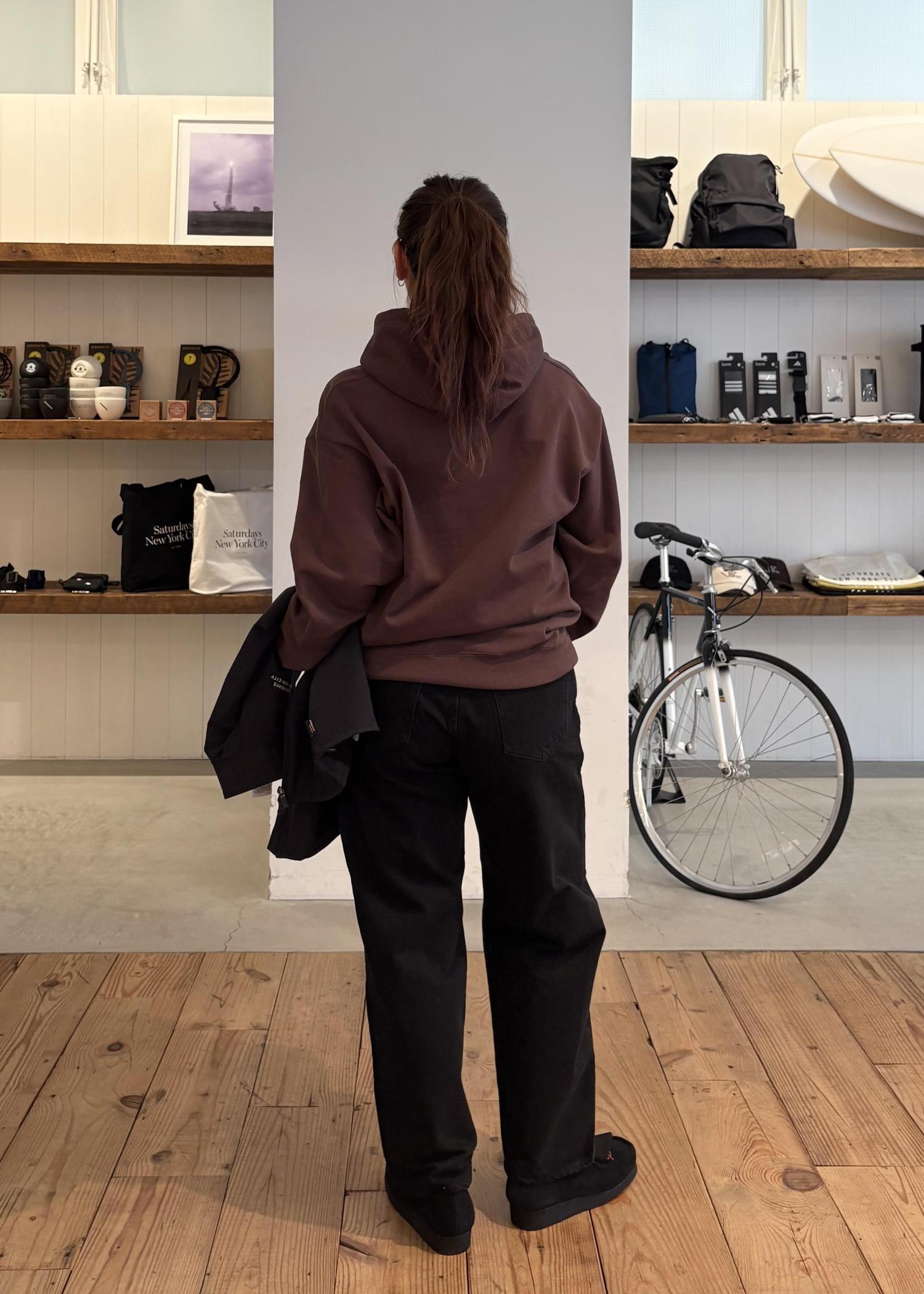 フーディのブラウンは、黒を選びがちな方へおすすめです。柔らかいさがプラスされます。