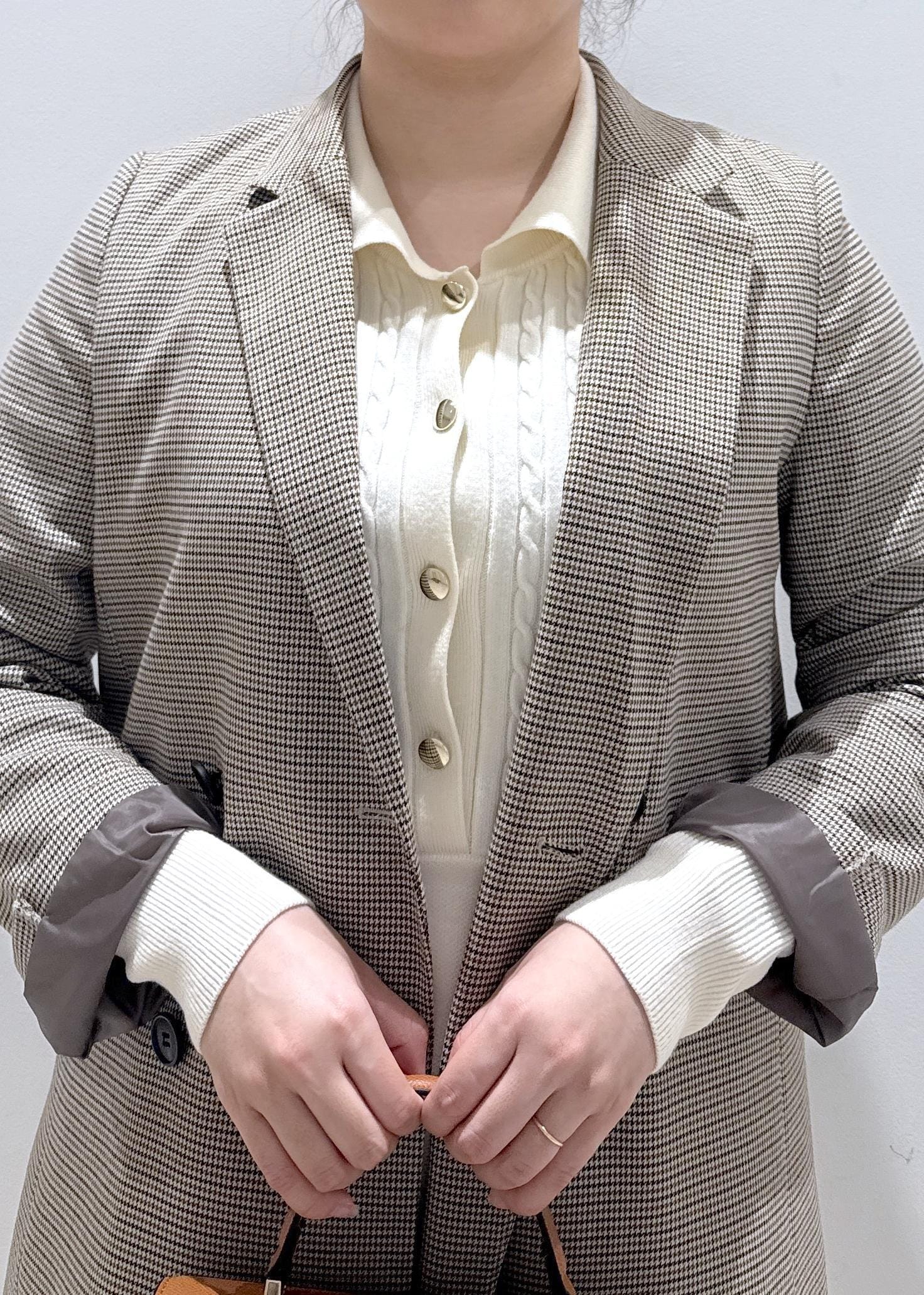 美easyシリーズのリネンライクジャケットではSサイズを着用していましたが、ウーリッシュジャケットではSだと裏地が付いているからかキツく感じ、こちらではMサイズがジャストサイズでした。ブラウスだとSでも良さそうですが、厚みのあるニット素材もこれから着たい方はMサイズをオススメします。またジャケットの素材感では生地が分厚すぎず、身長157cmでお尻が隠れるぐらいの長さで安心しました。 -