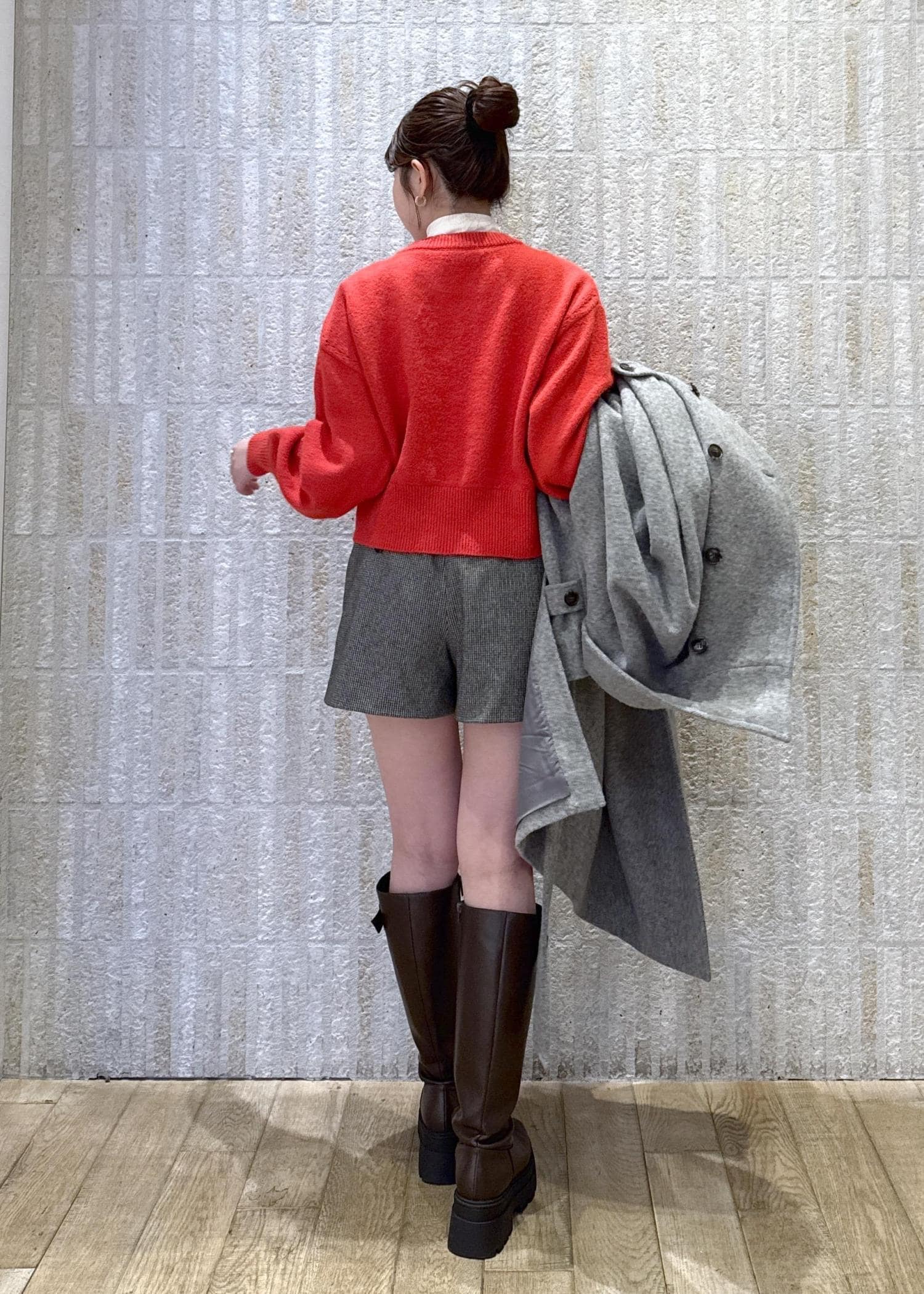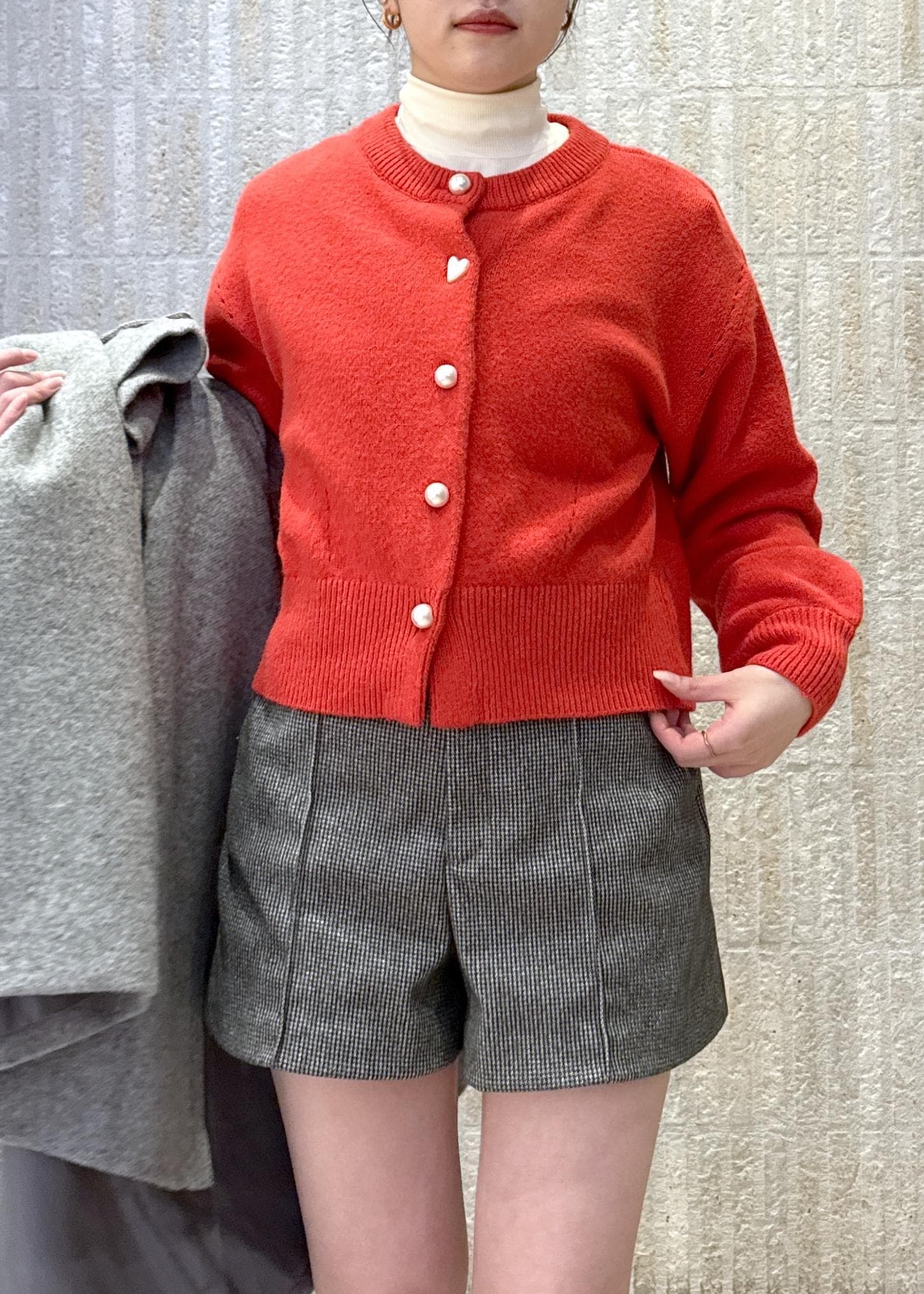 レッドのパールカーディガンが目を引くホリデーシーズンにぴったりなフェミニン×カジュアル華やかコーデ!