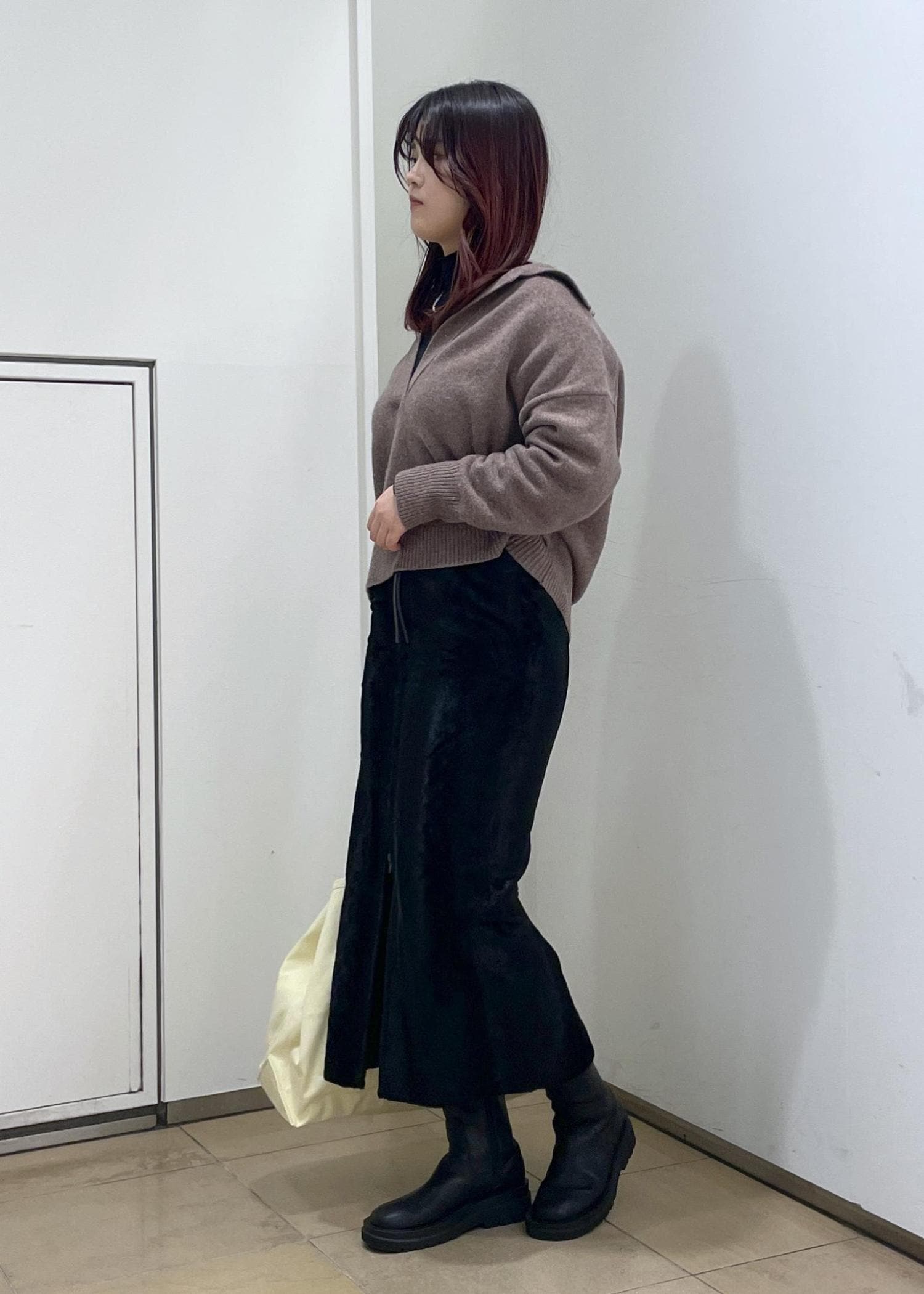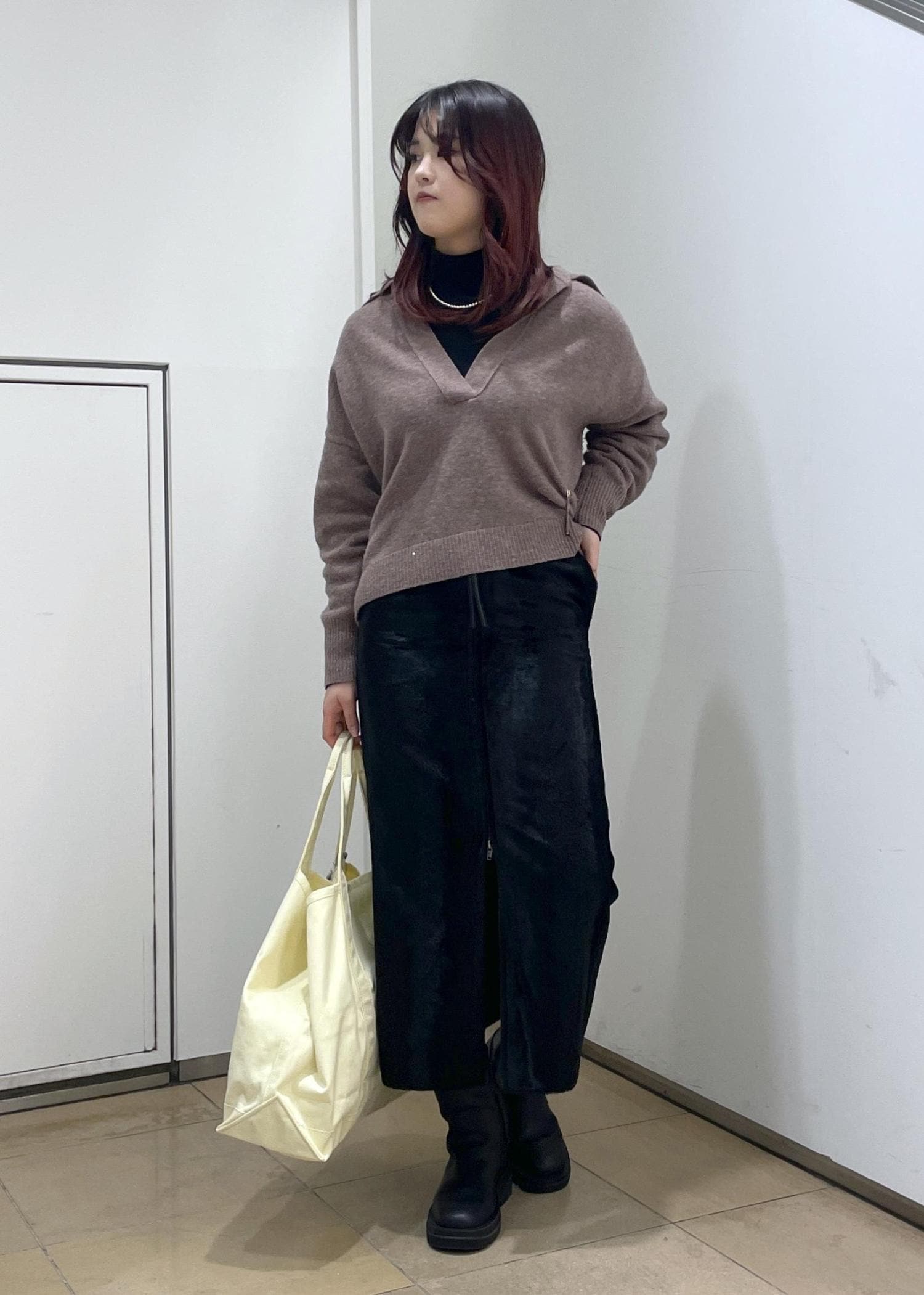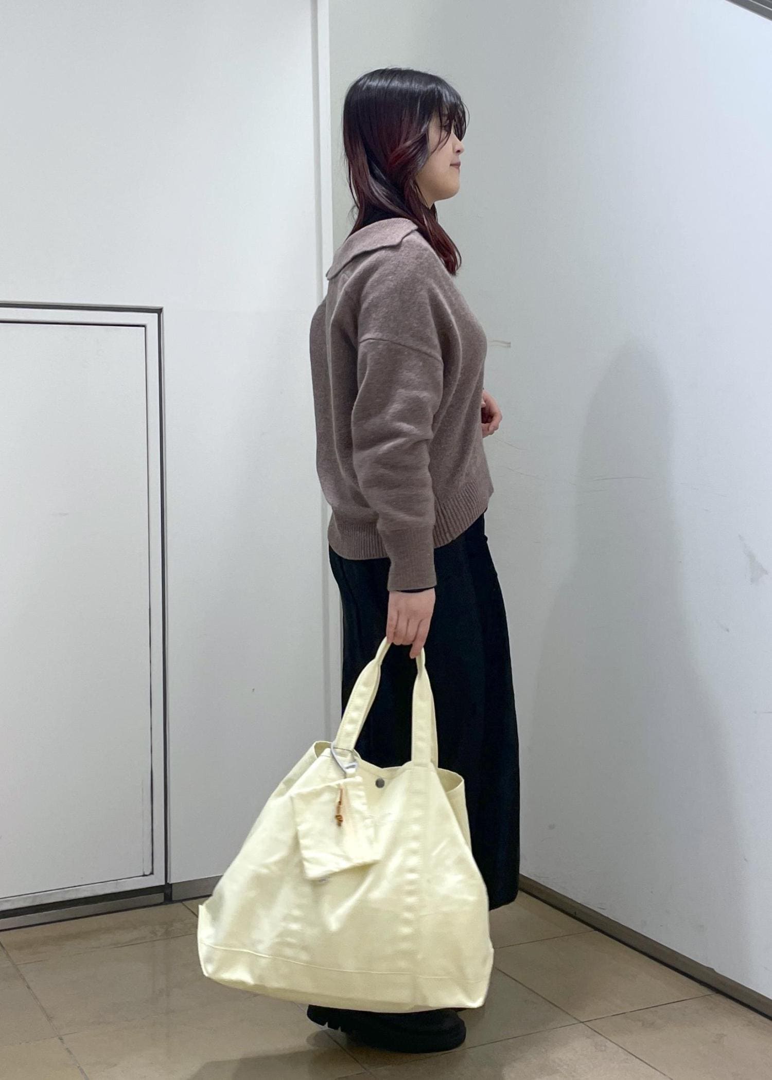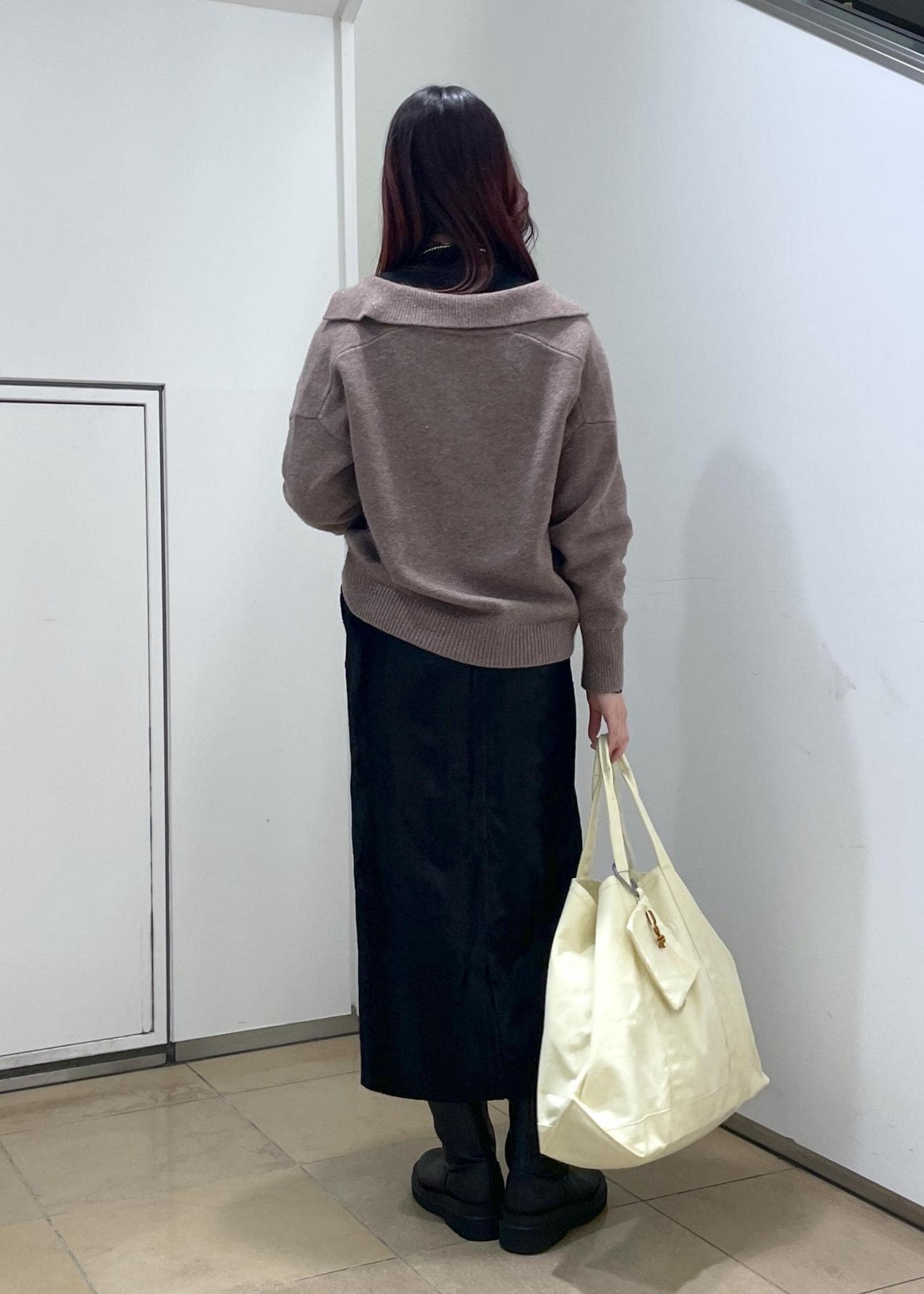 付属のピンでシルエットが変えられるので、襟元をざっくり開けたり、ジャケットの中に着たりと、着回しがきくアイテムです。