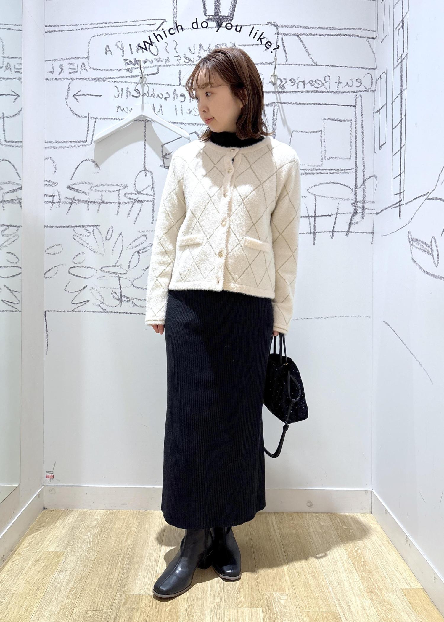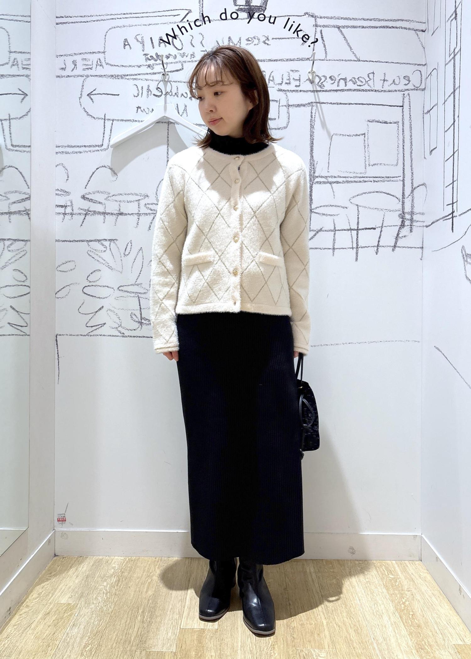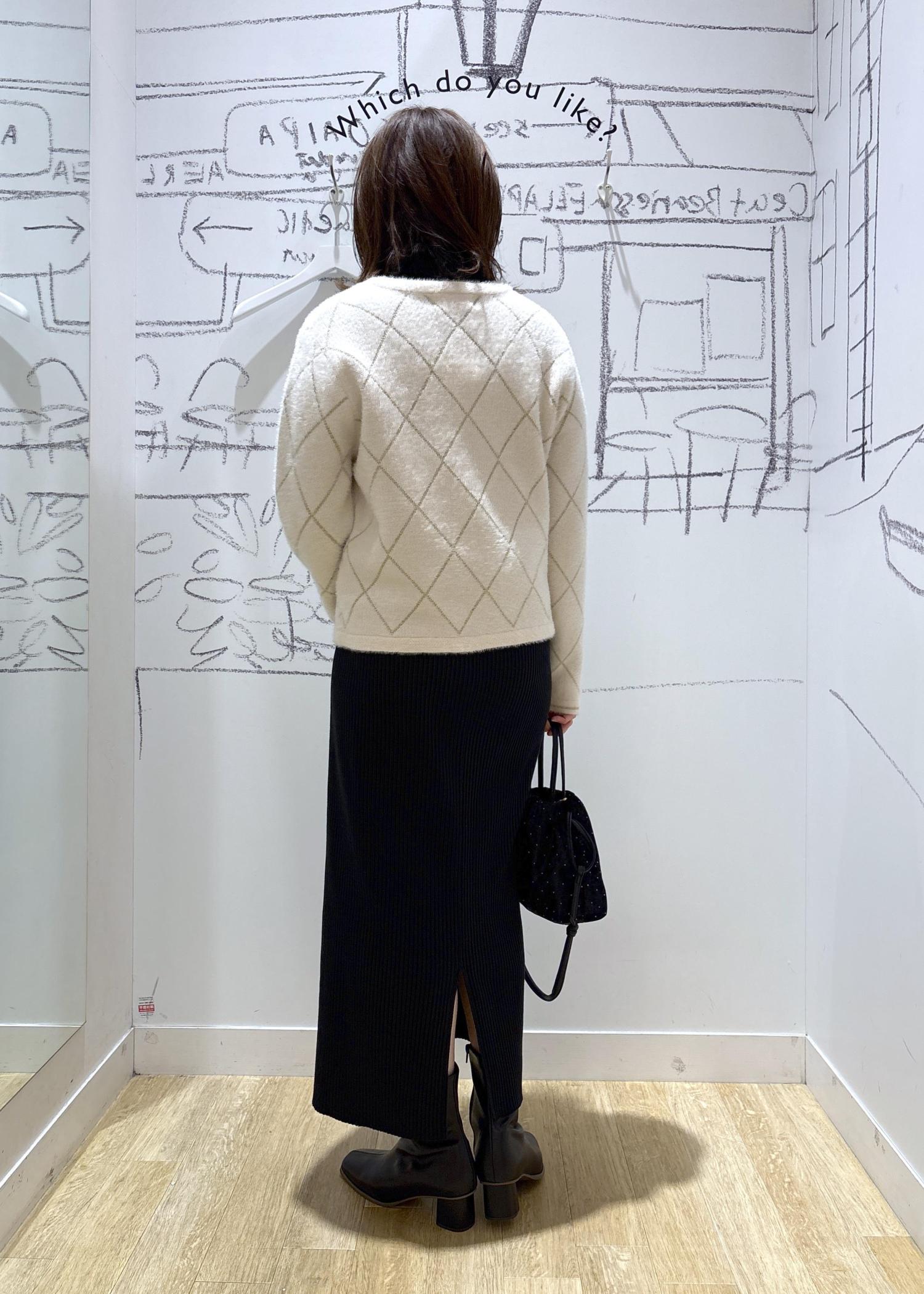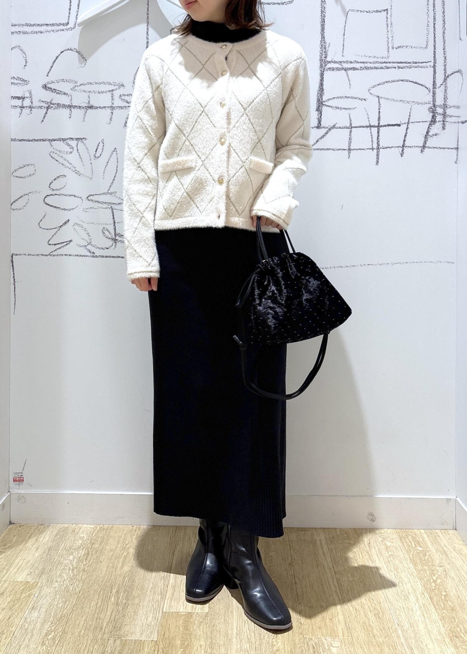品のあるラメフェザーカーディガンにタートルネックを合わせたきちんとスタイル。