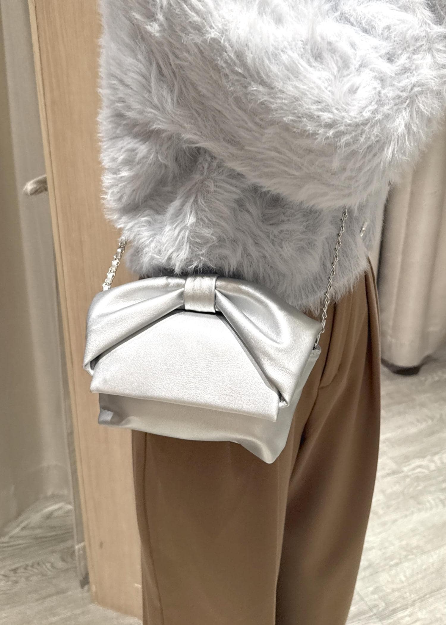 NEW!VISリボンハンドルチェーンショルダーバッグ/2WAYシルバー / F¥5,929レビューお呼ばれシーンだけでなく、普段使いもできるミニバックです。チェーンは長さを調節できるため、斜め掛け・肩掛けどちらも可能!◎