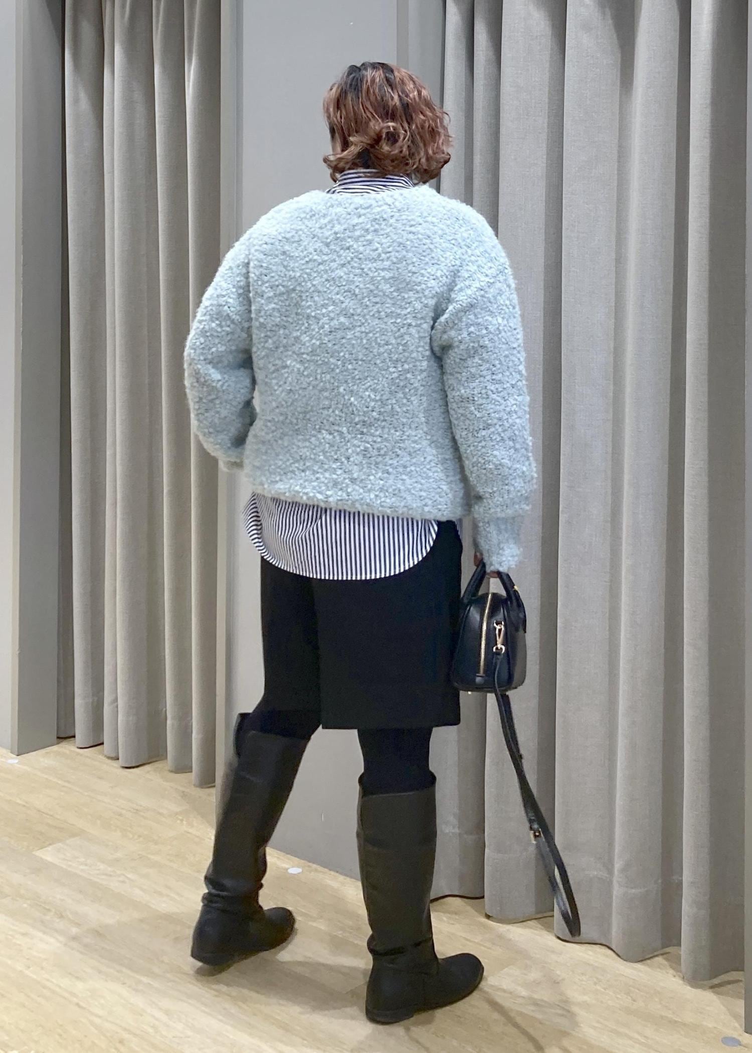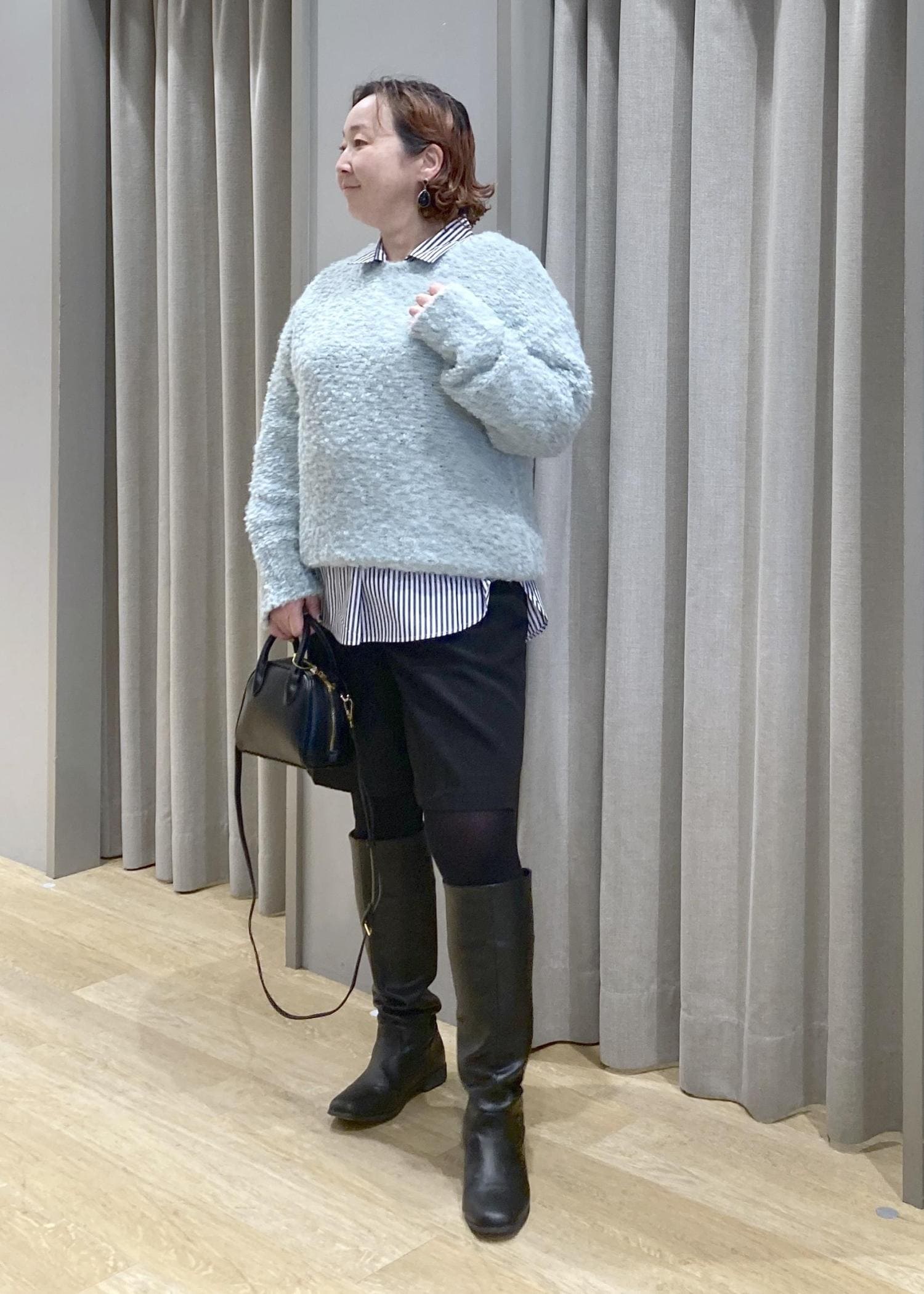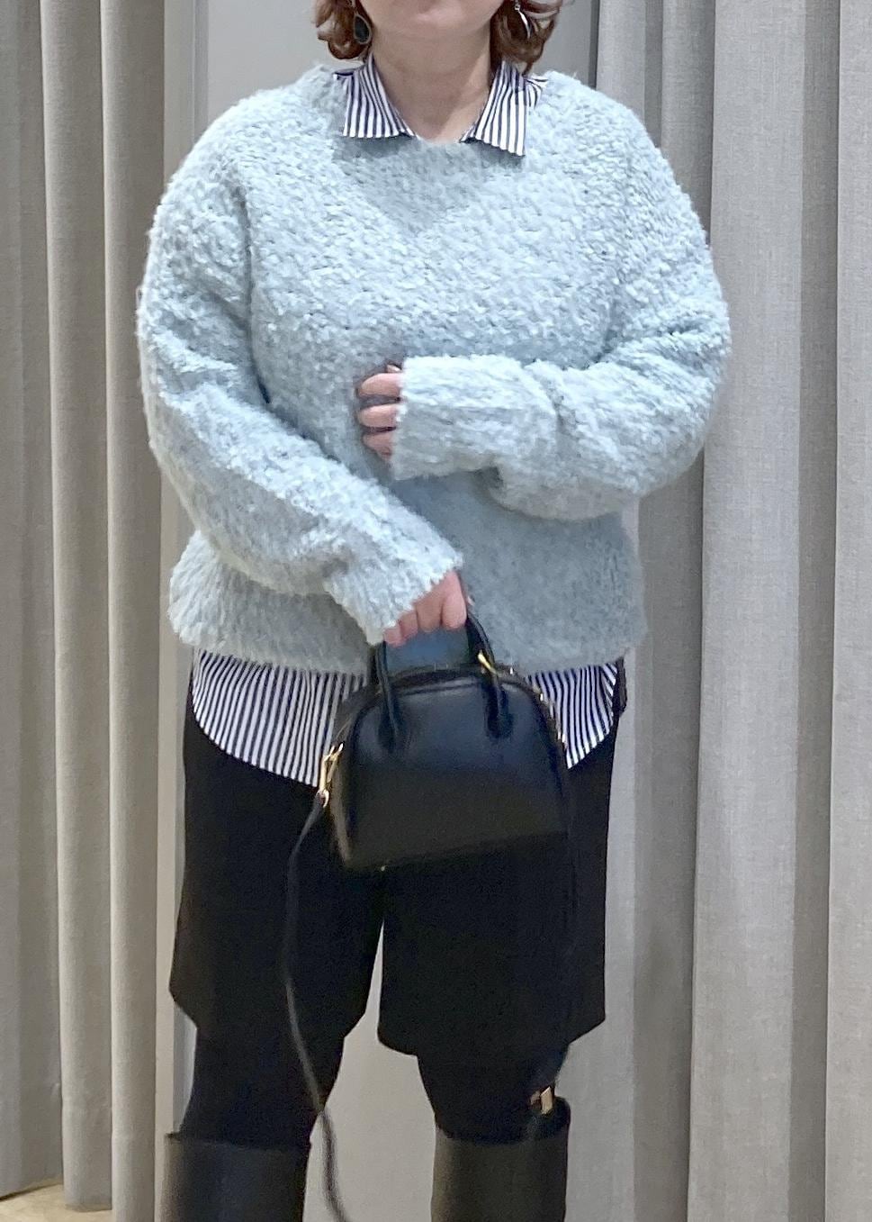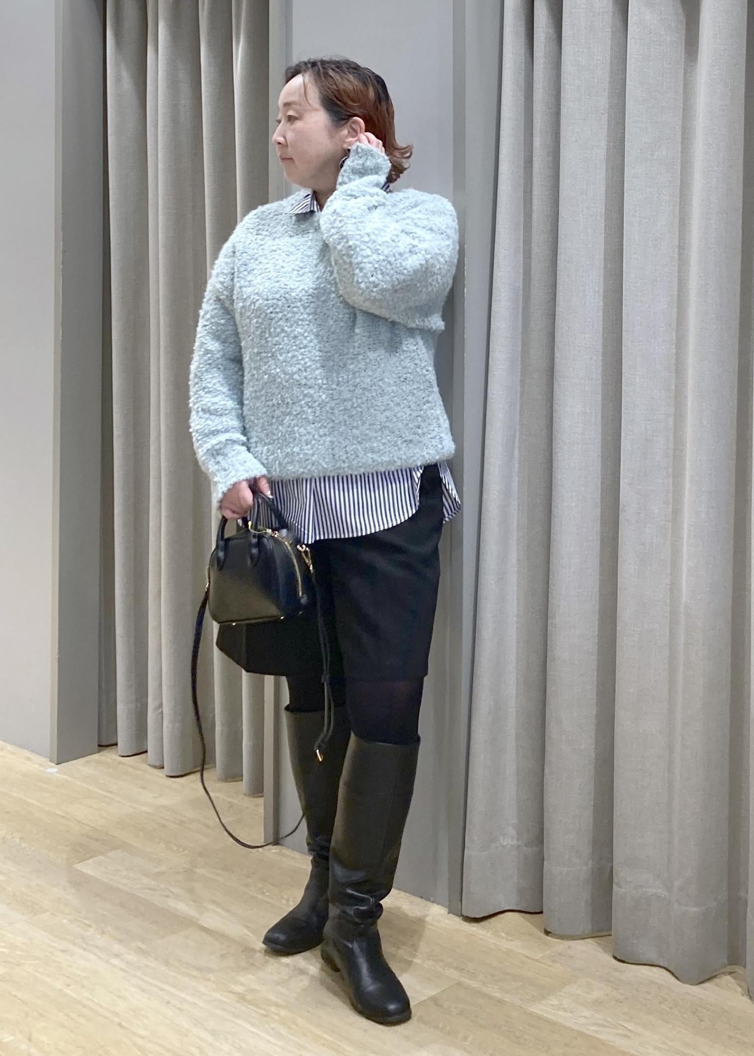 ゆったりニットにストライプシャツを仕込んで、気になる上半身をさりげなくカバーしてみました。
