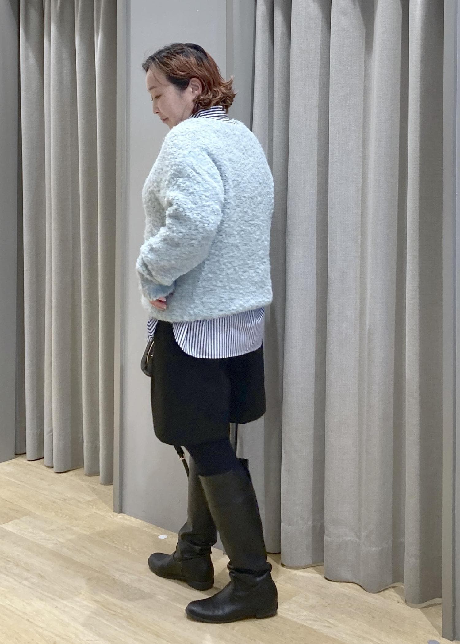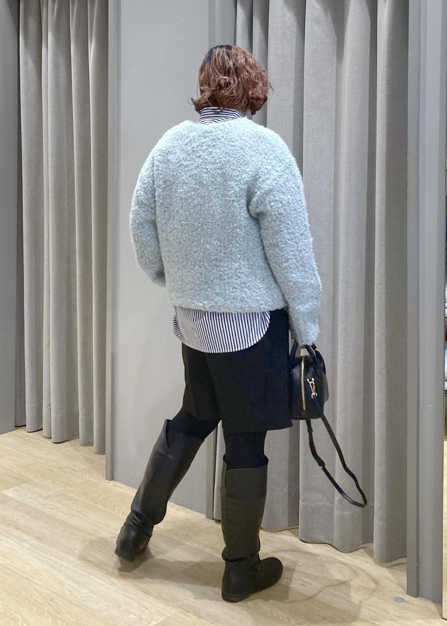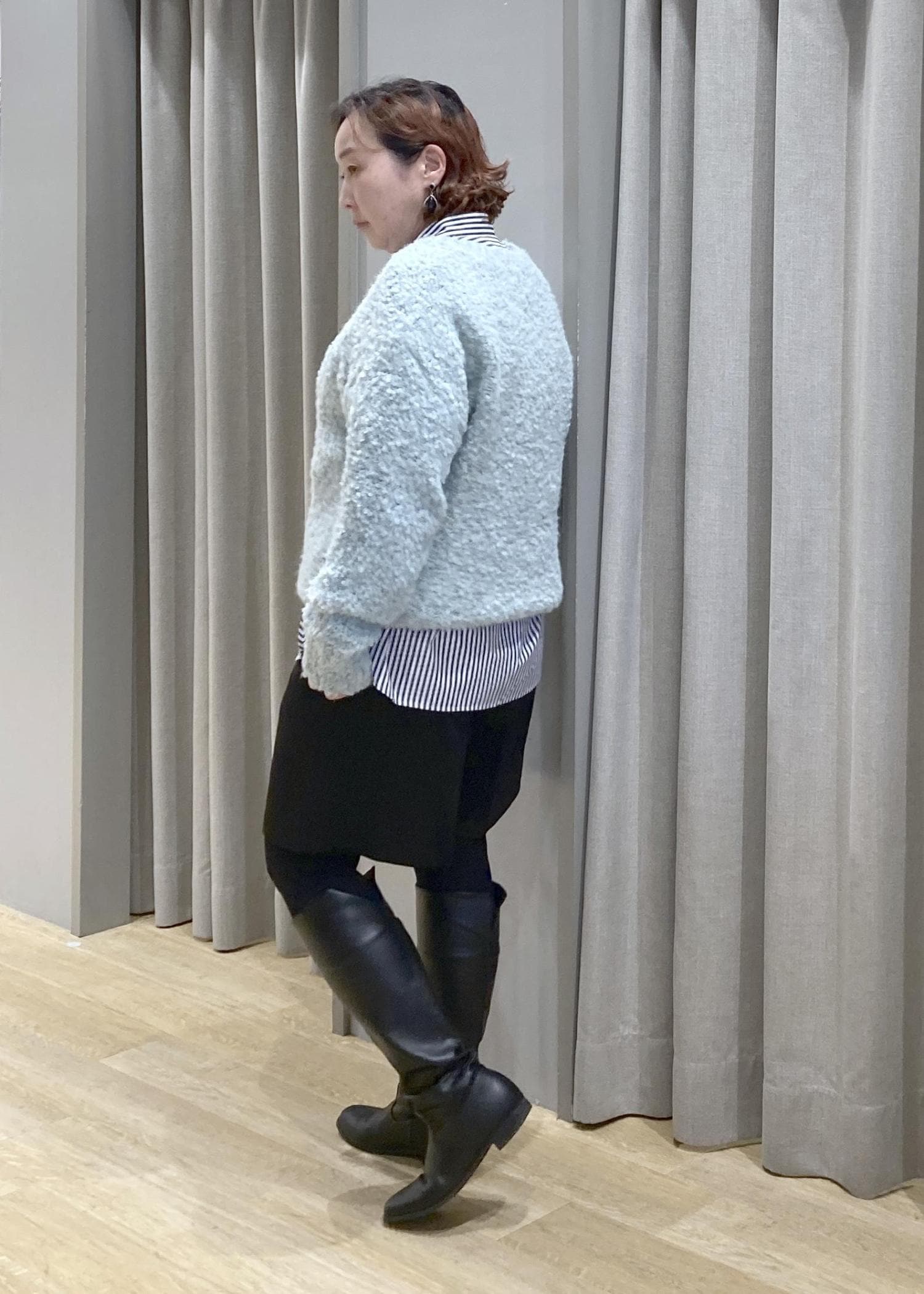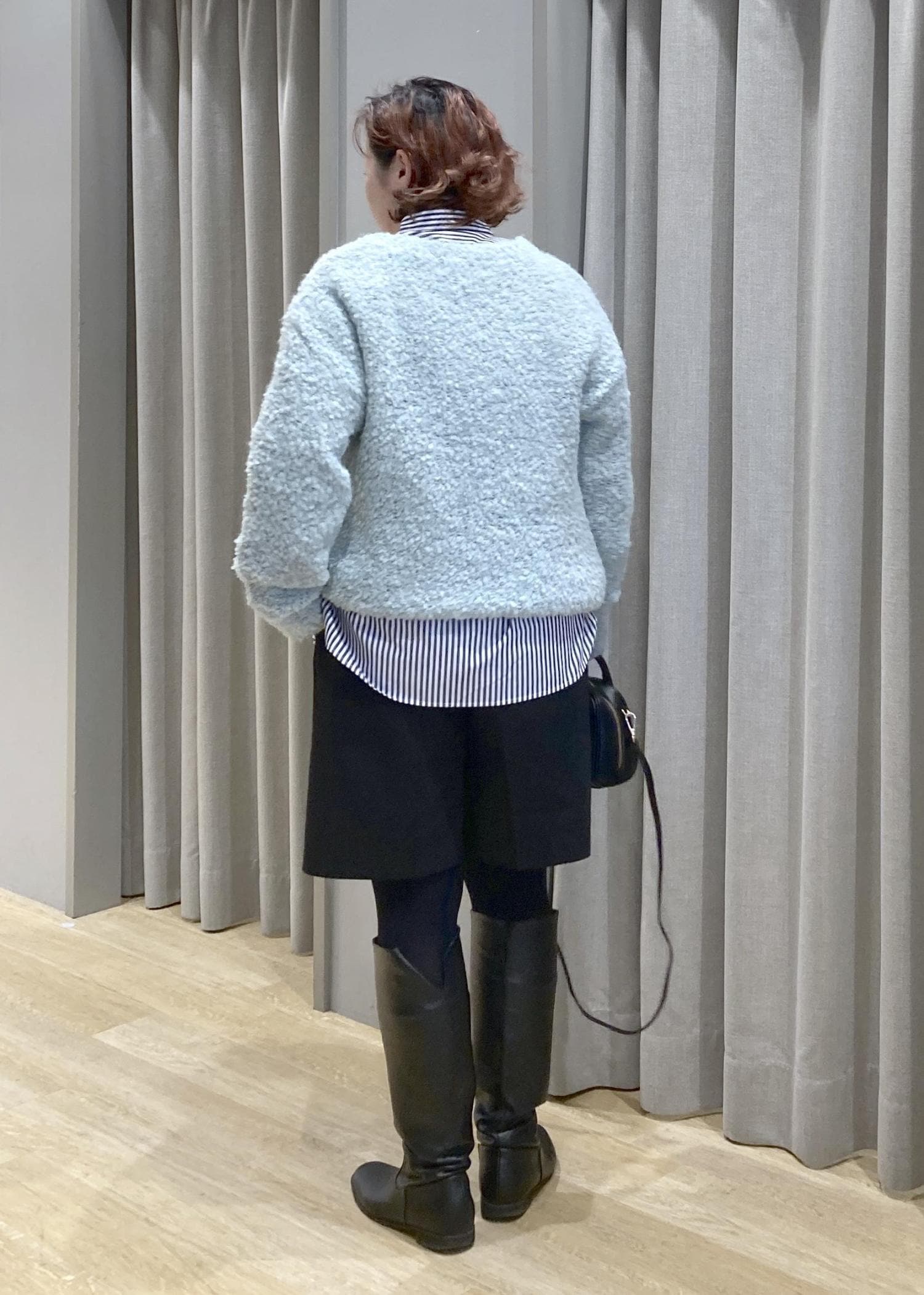 ゆったりニットにストライプシャツを仕込んで、気になる上半身をさりげなくカバーしてみました。