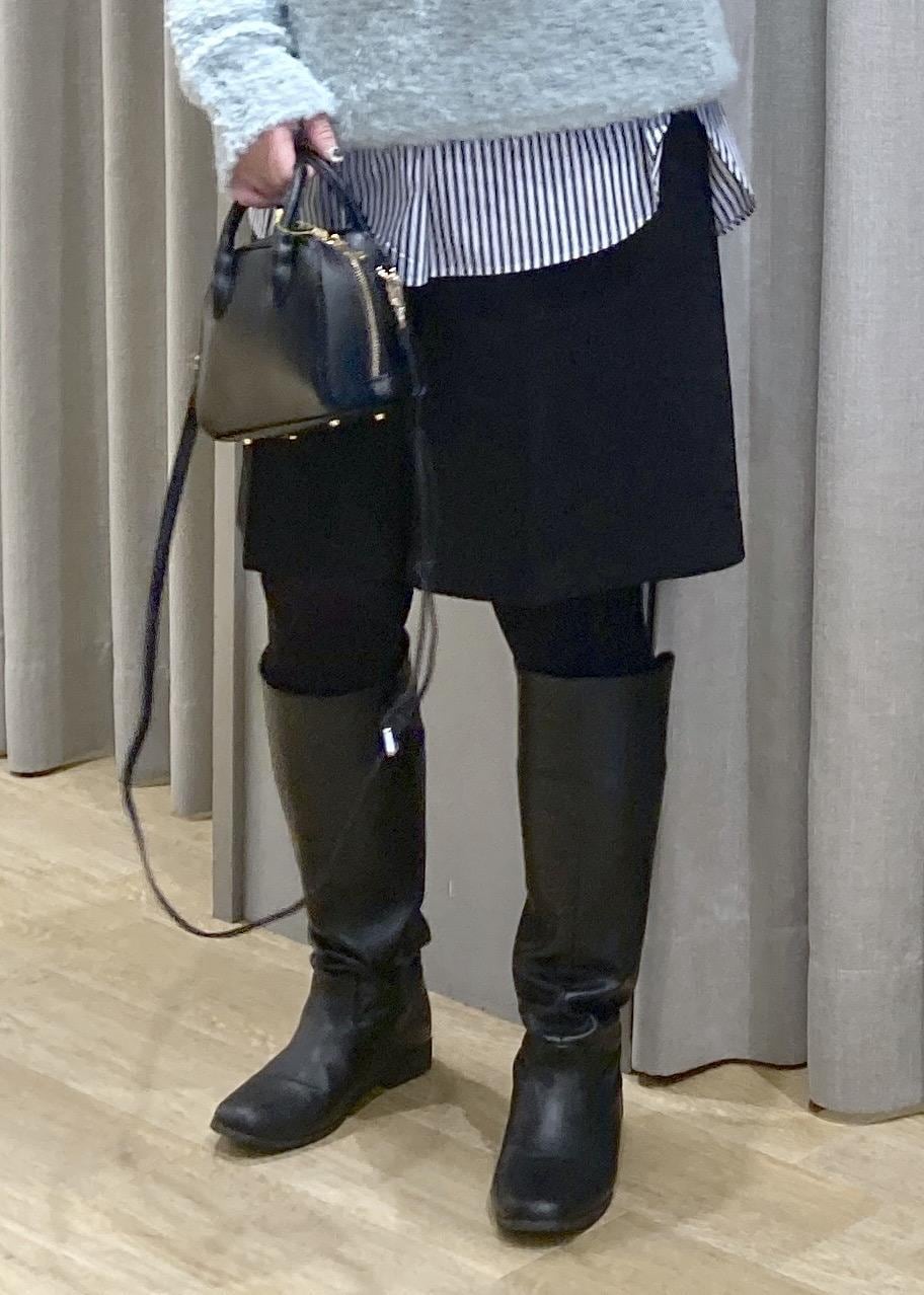 下はスッキリ見えのブラックで引き締めて、ロングブーツで大人っぽさもキープです。