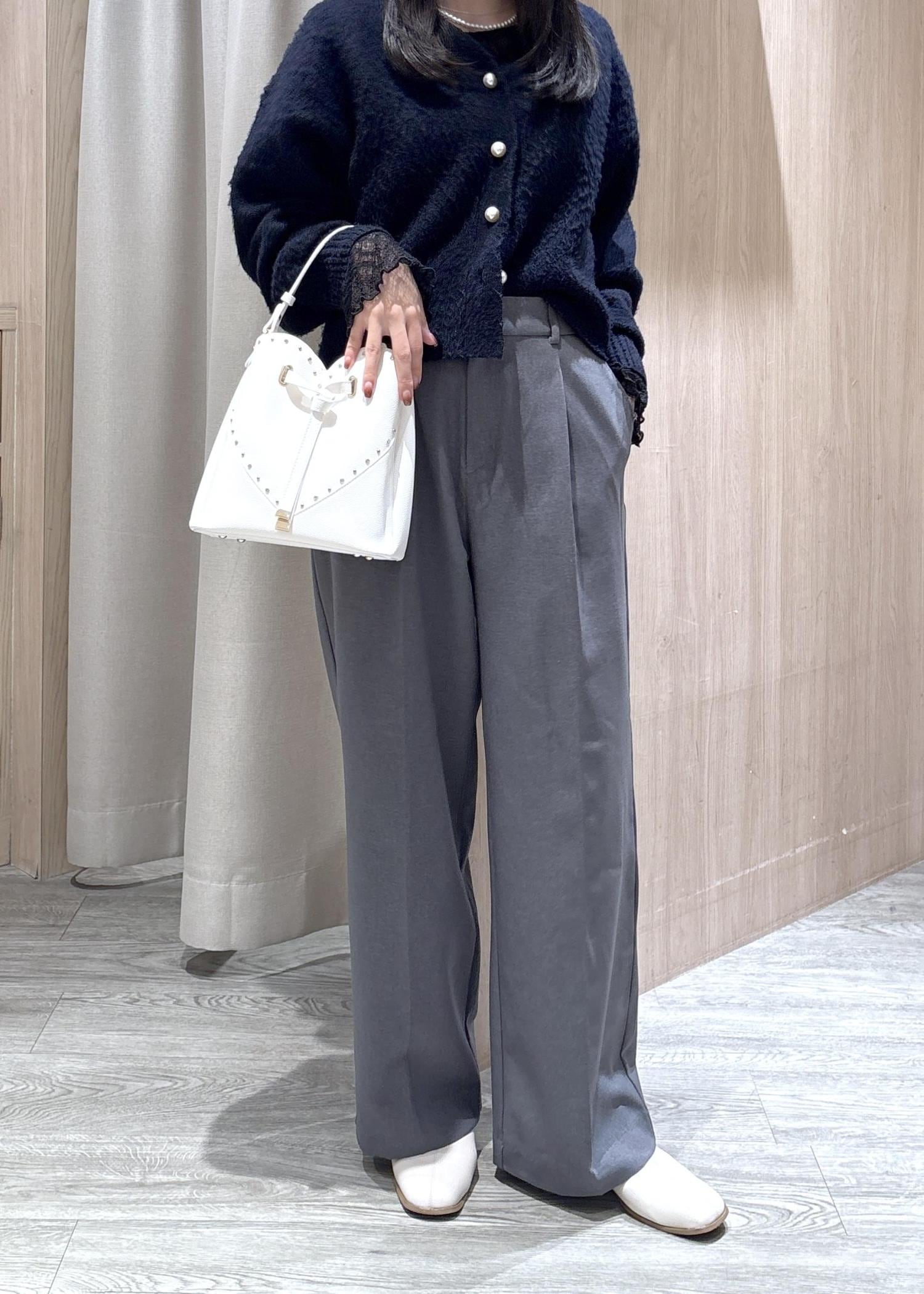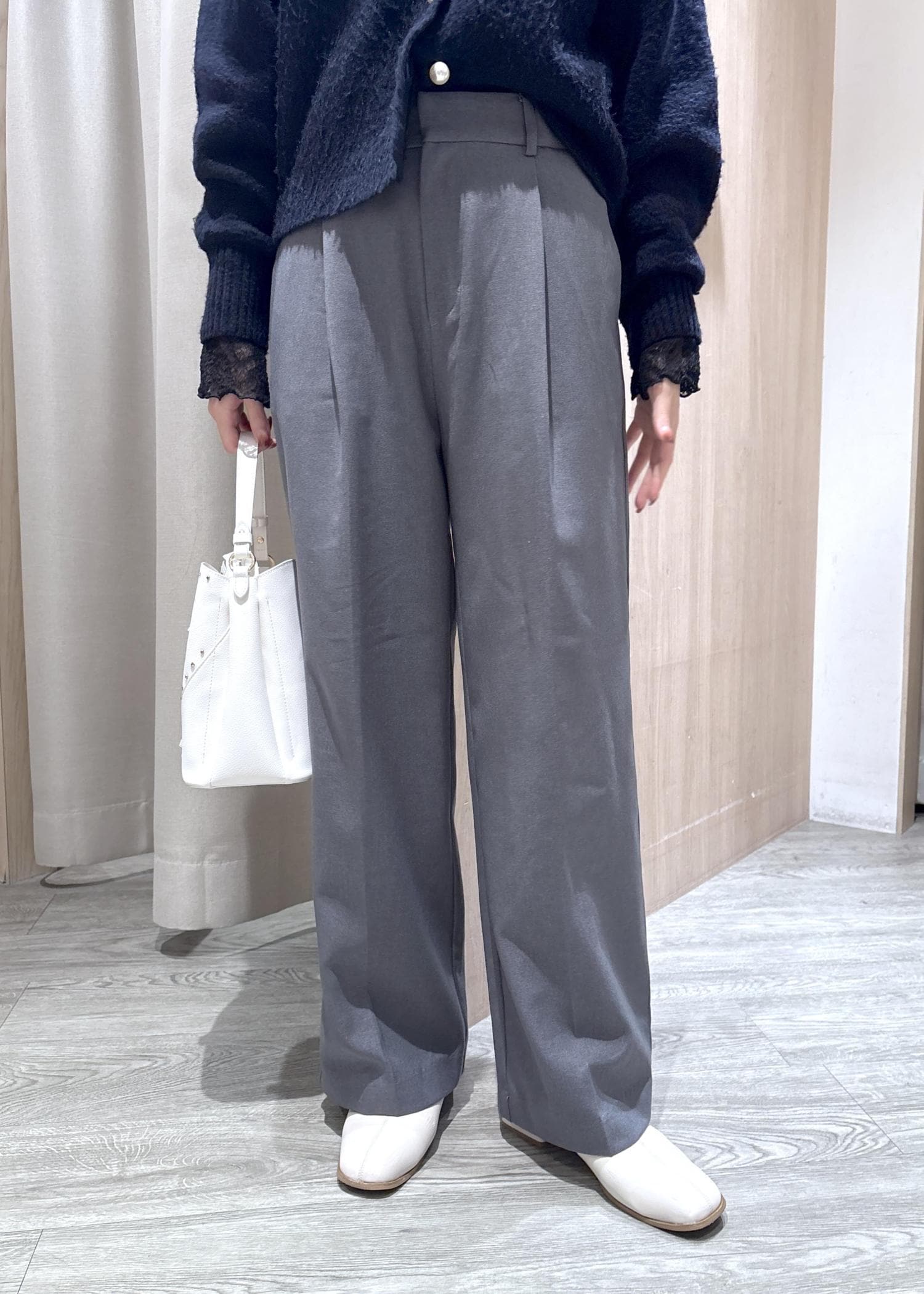 グレーのパンツを合わせることで落ち着いた印象に◎