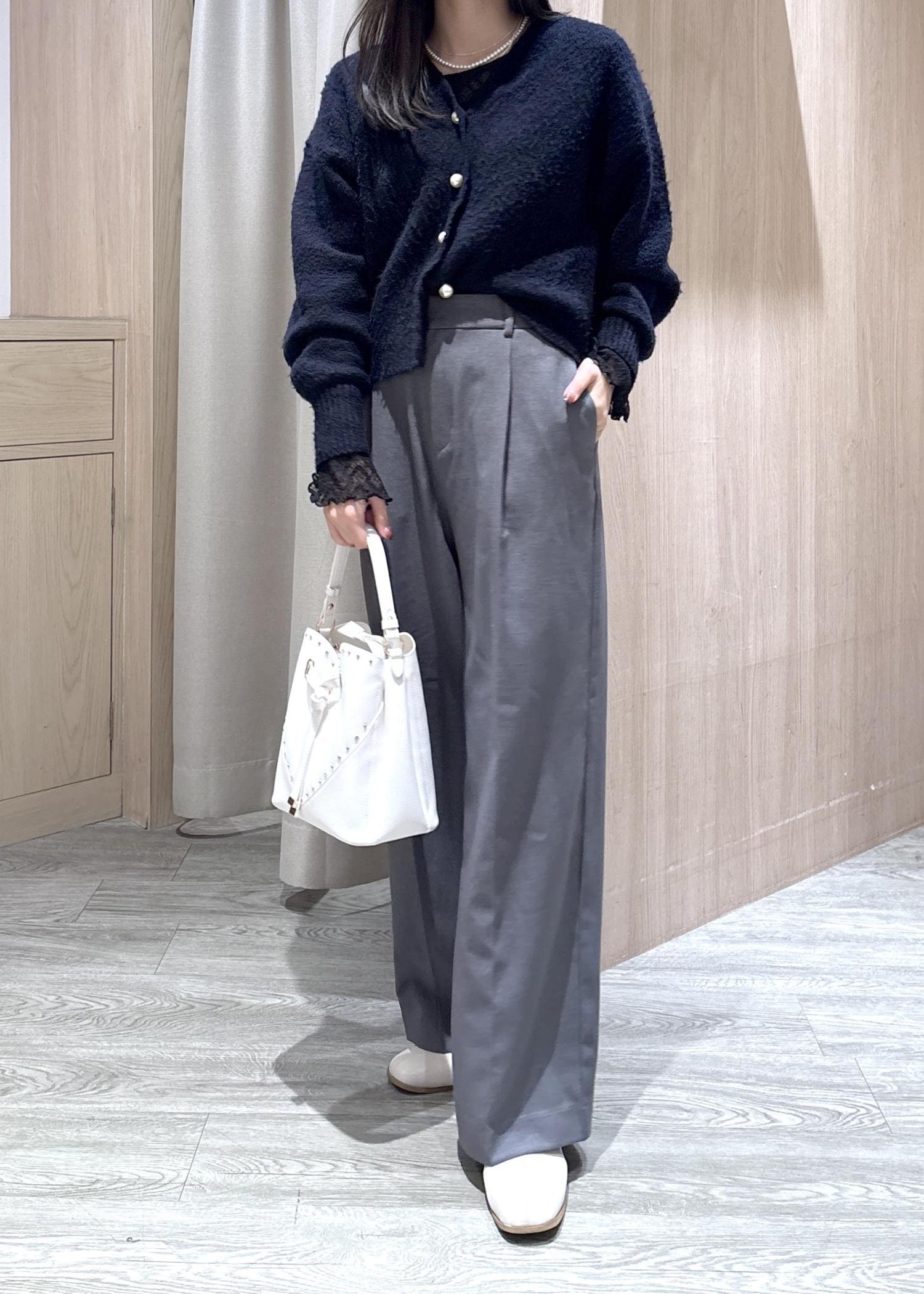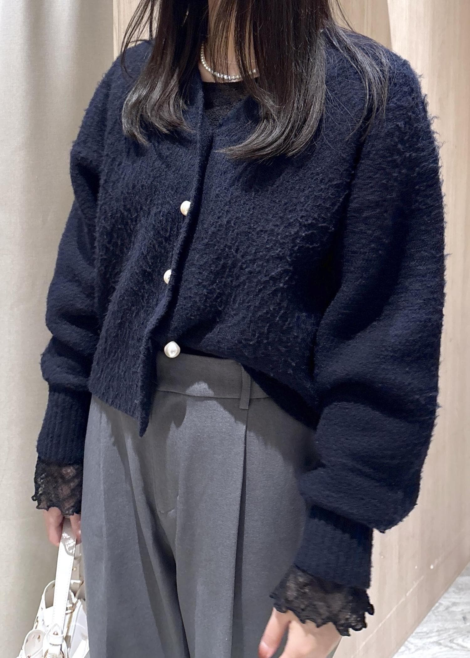 パールボタンが女性らしいカーディガンはレースをレイヤードすることで袖元にボリューム感をプラスしました。