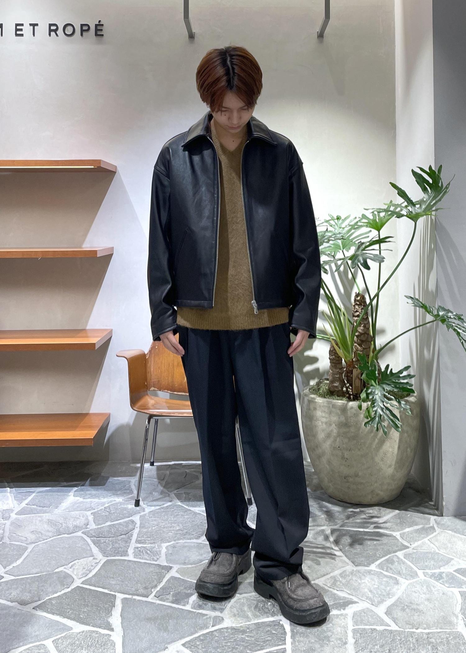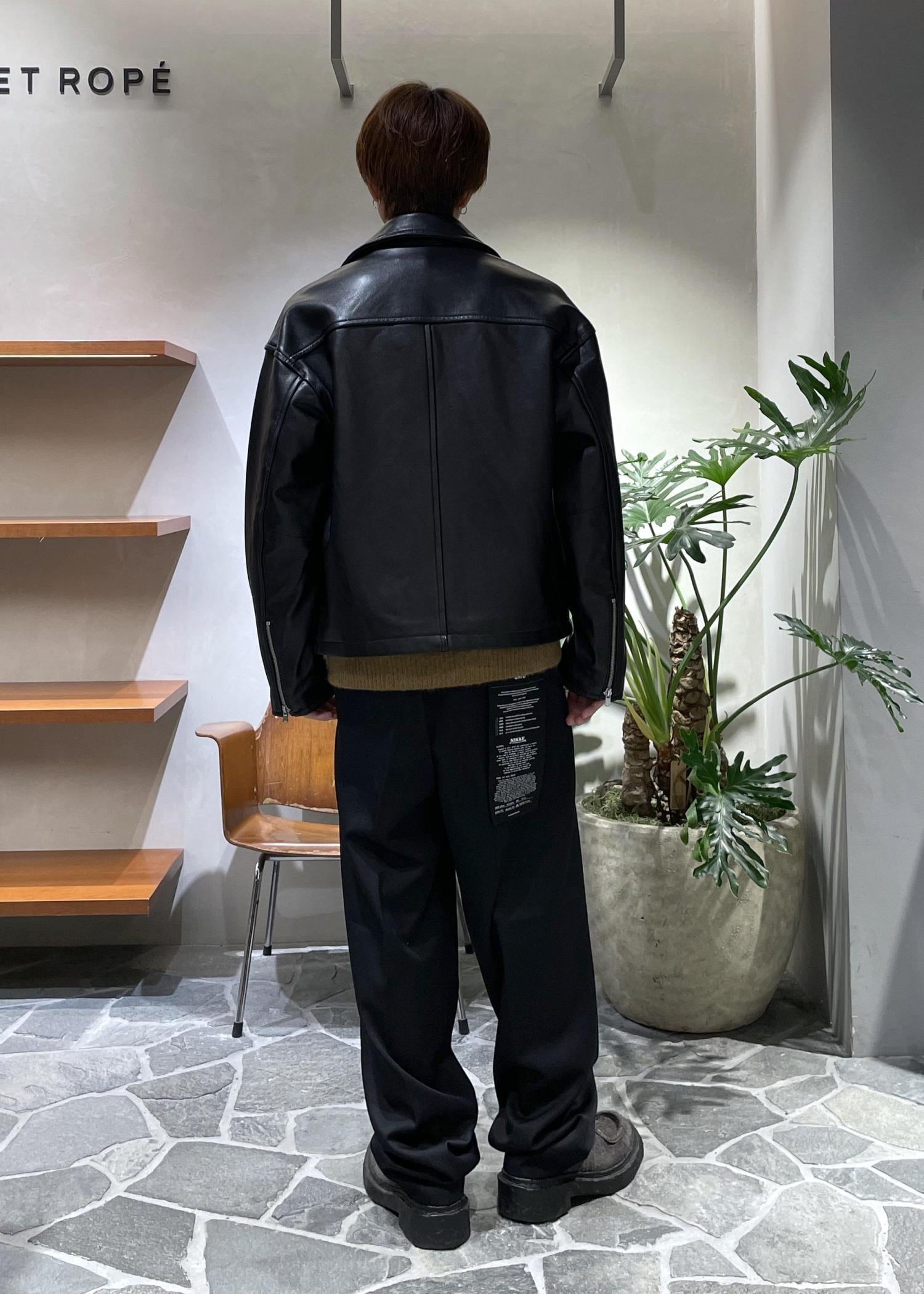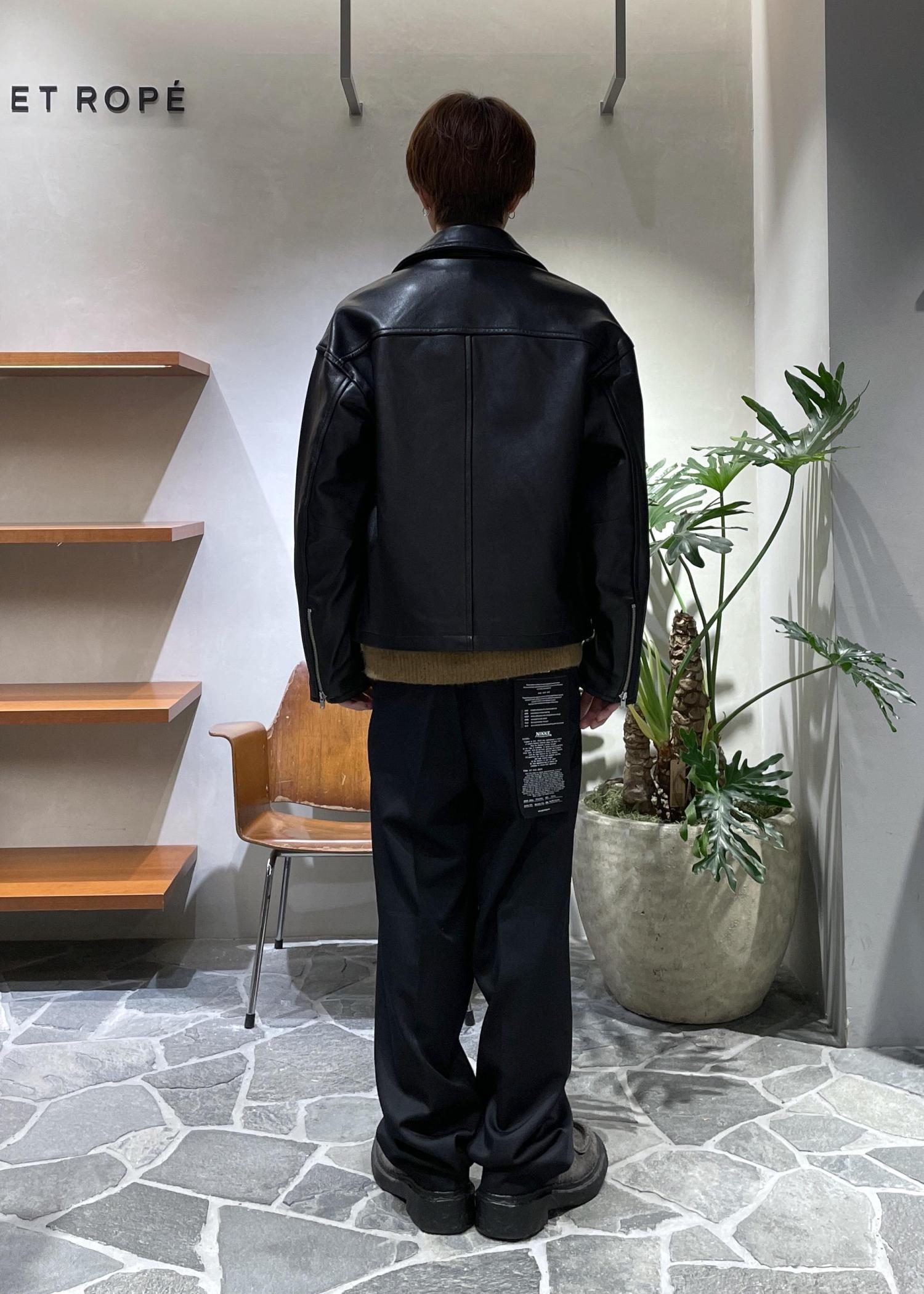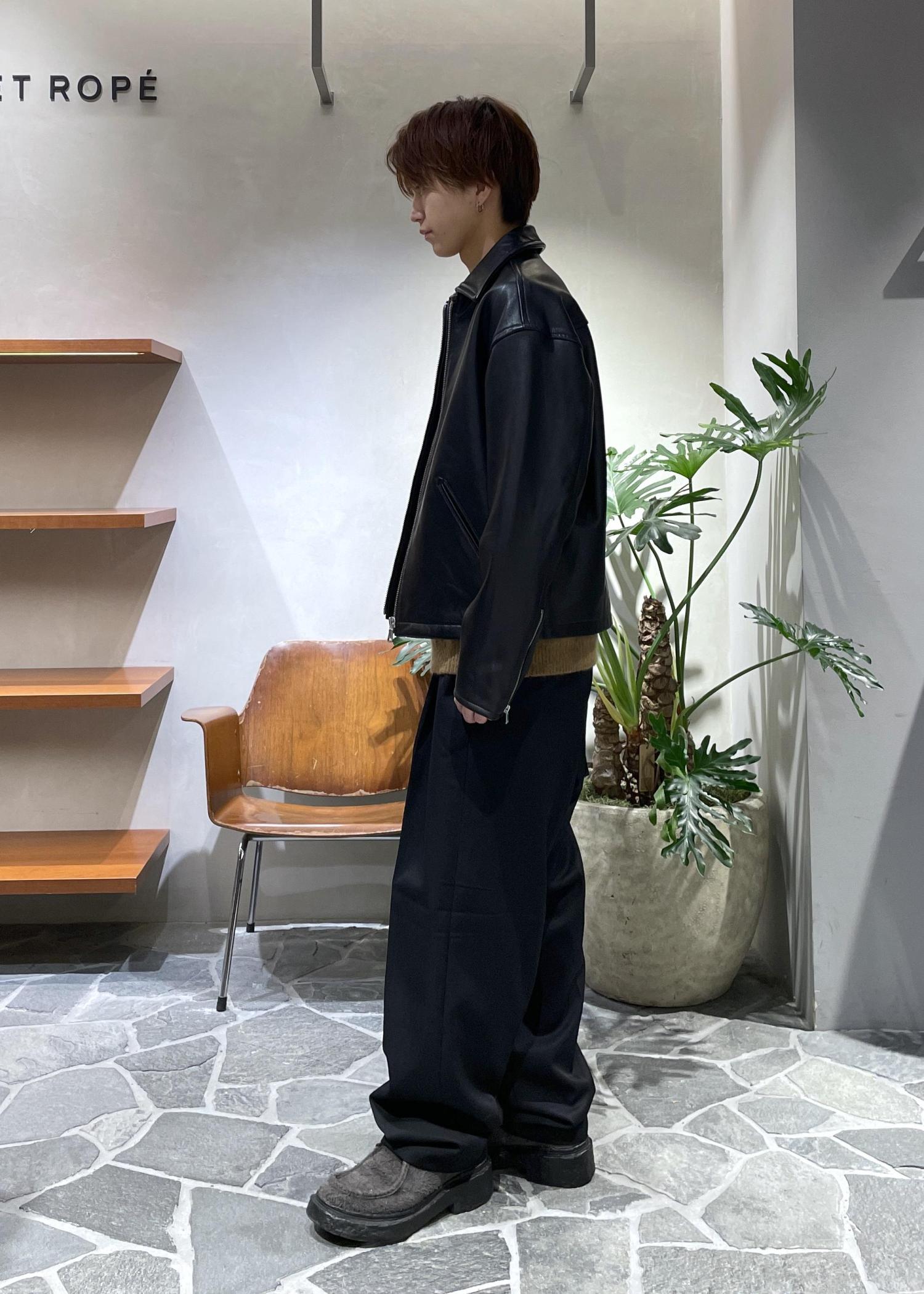 ジャケットはラムレザーを使用しており、ワイルドさの中に上品さ、大人の余裕を感じさせます。パンツはシンプルに黒のスラックス、カジュアルに振りきったフェード加工の入ったデニムとも良い相性だと思います◎