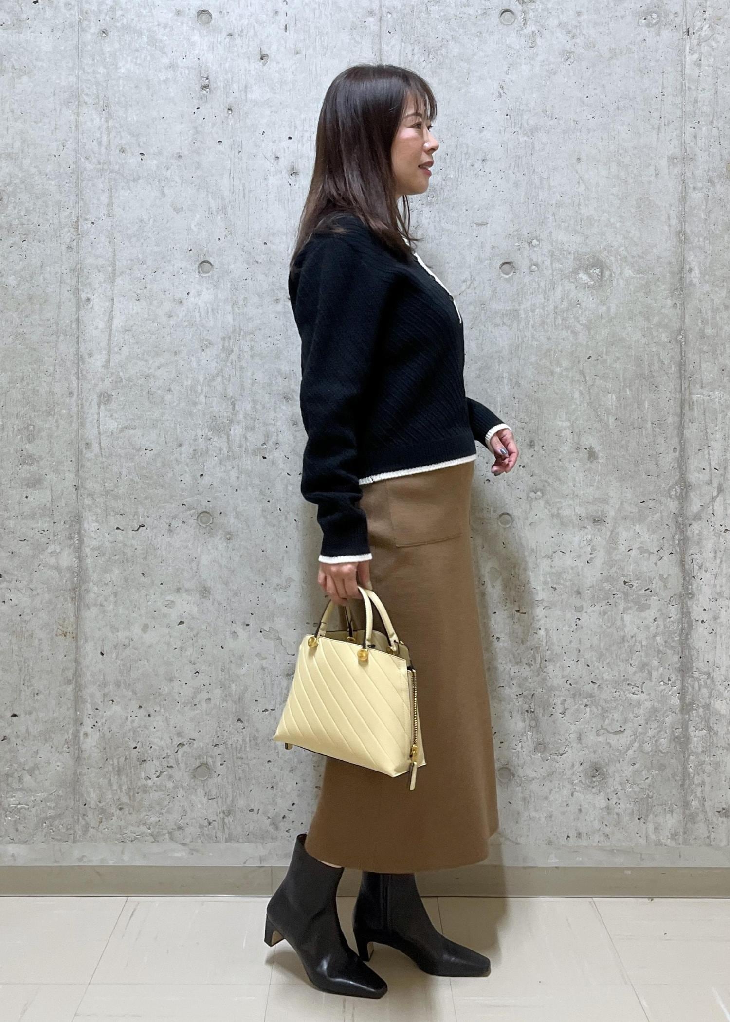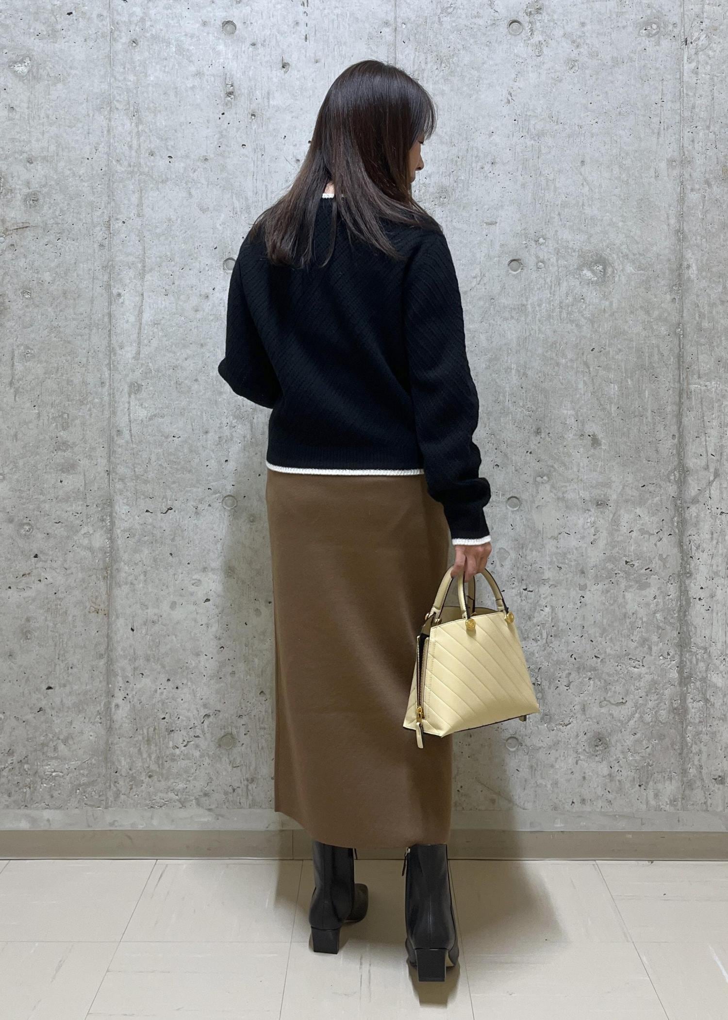 上下ニット素材で合わせたスタイルで、タイトスカートなのでキッチリ見えしますが、リラックス感のあるスタイルです。