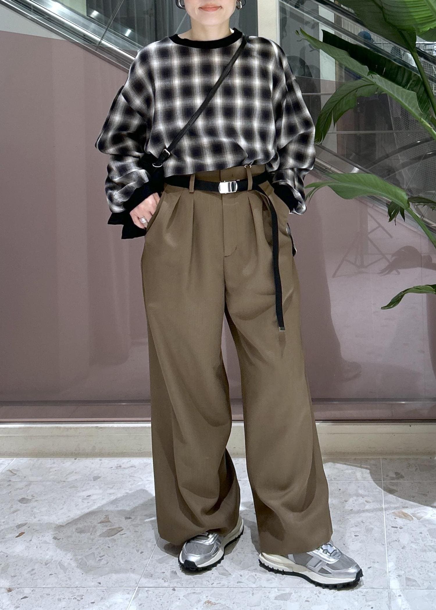 つるんとした生地感で綺麗め見えもしやすいアイテム。程よくゆるっとしたサイズ感ですが、ニットの中にレイヤードなどもしやすいサイズ感です。