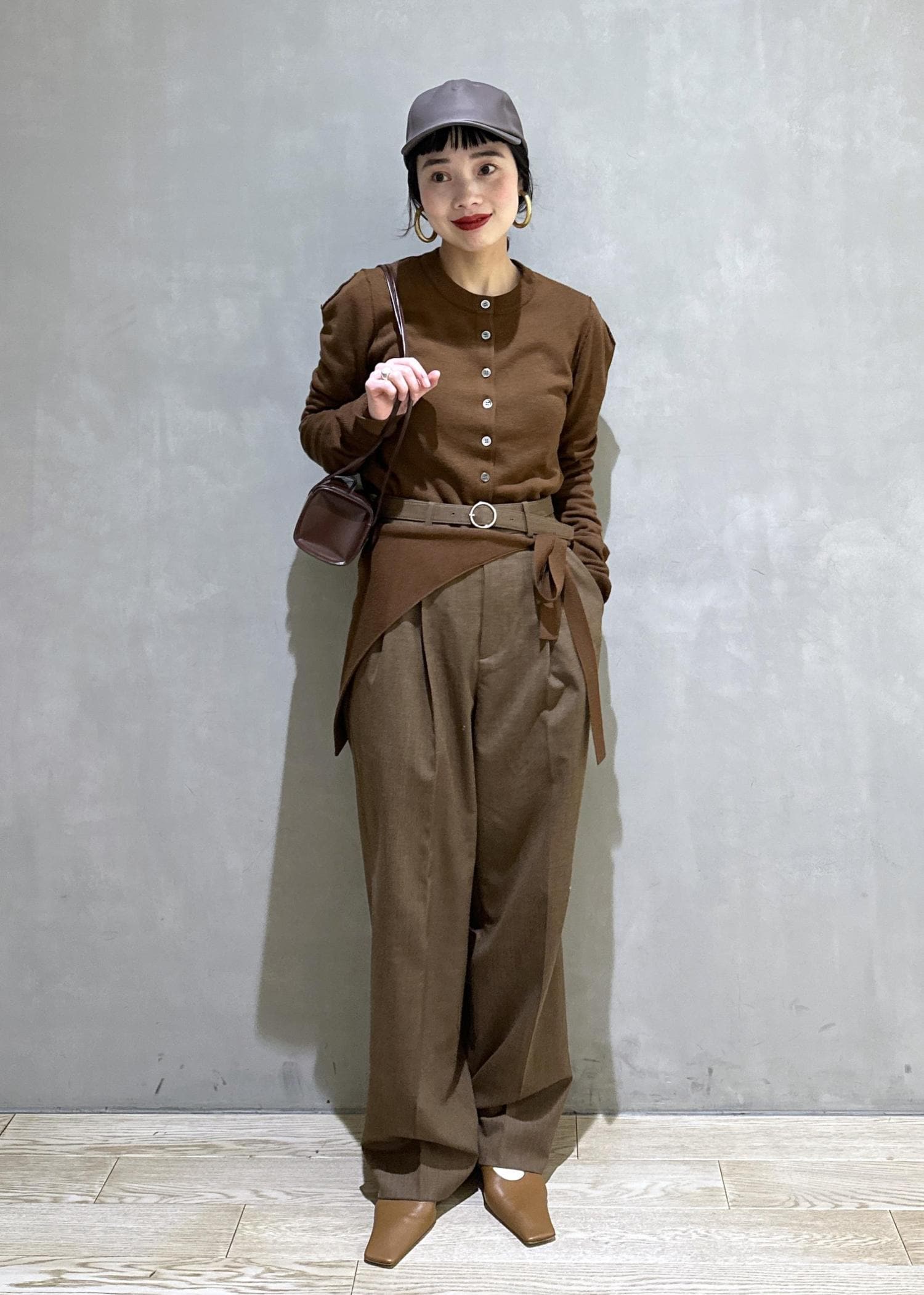 シンプルなポロシャツデザインを大人のミニマルスタイルで合わせてみました。トップスにパンツだけだと少しベーシックになりすぎなので、ストールをベルト代わりにアクセントに。