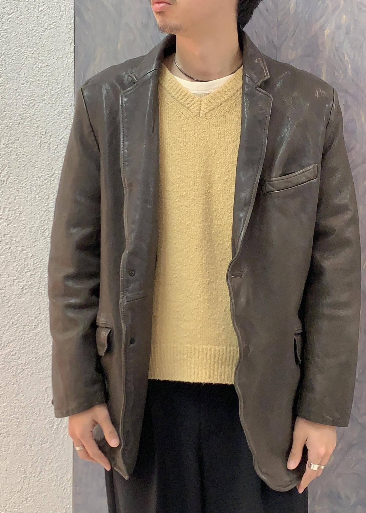 レザージャケットできっちりした印象はありながら、ビンテージのような加工感で程よい決まり方が心地よいです。