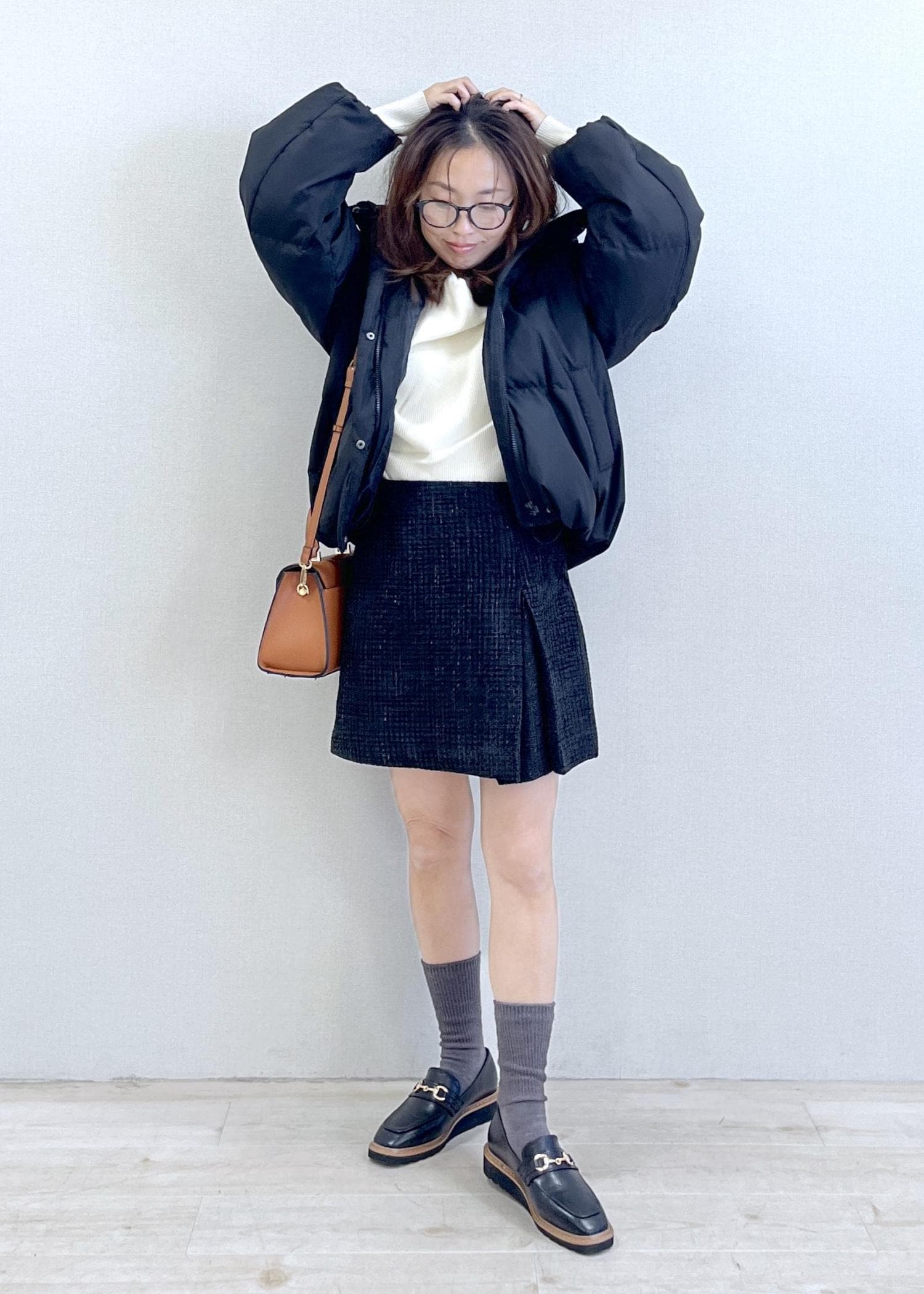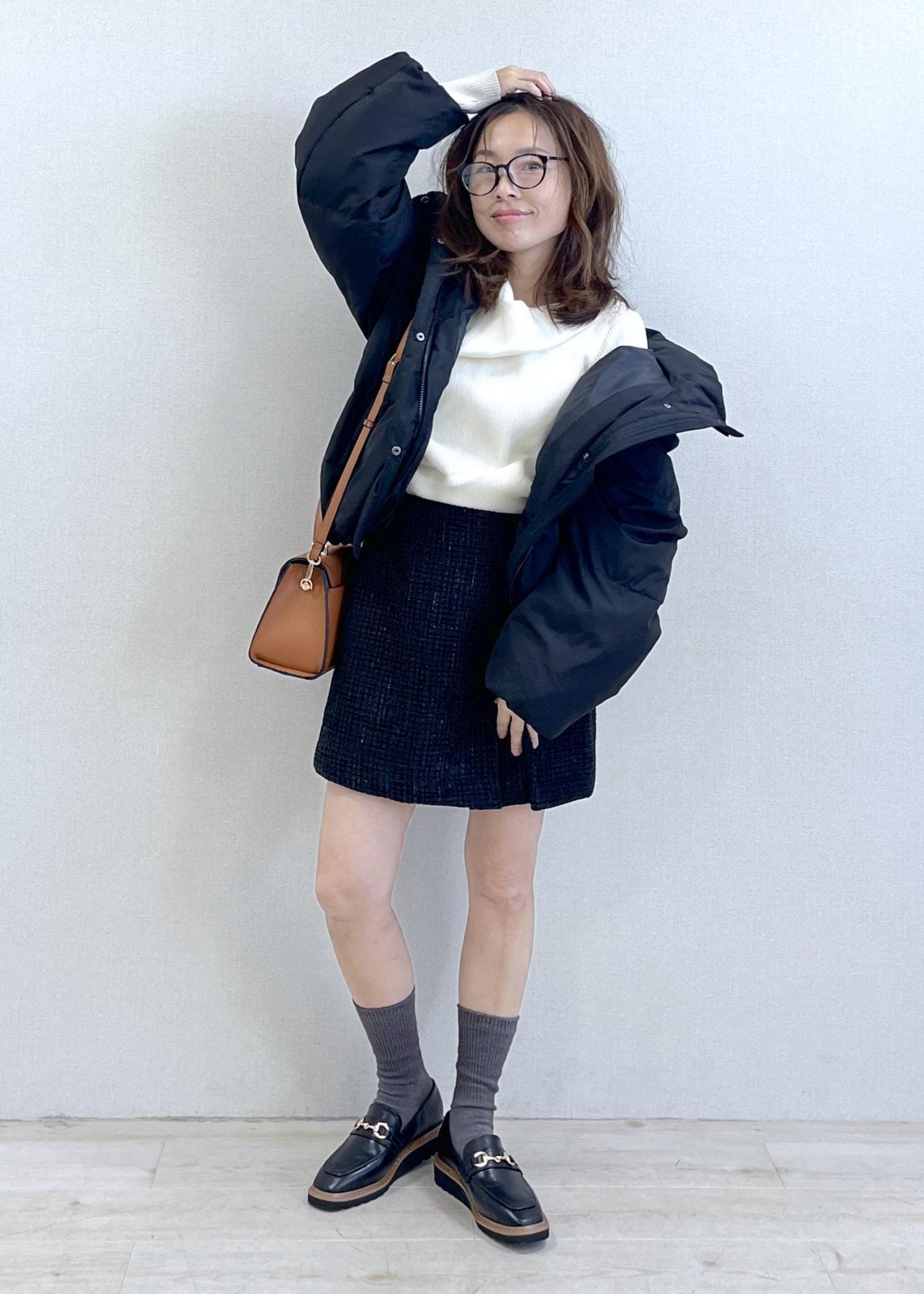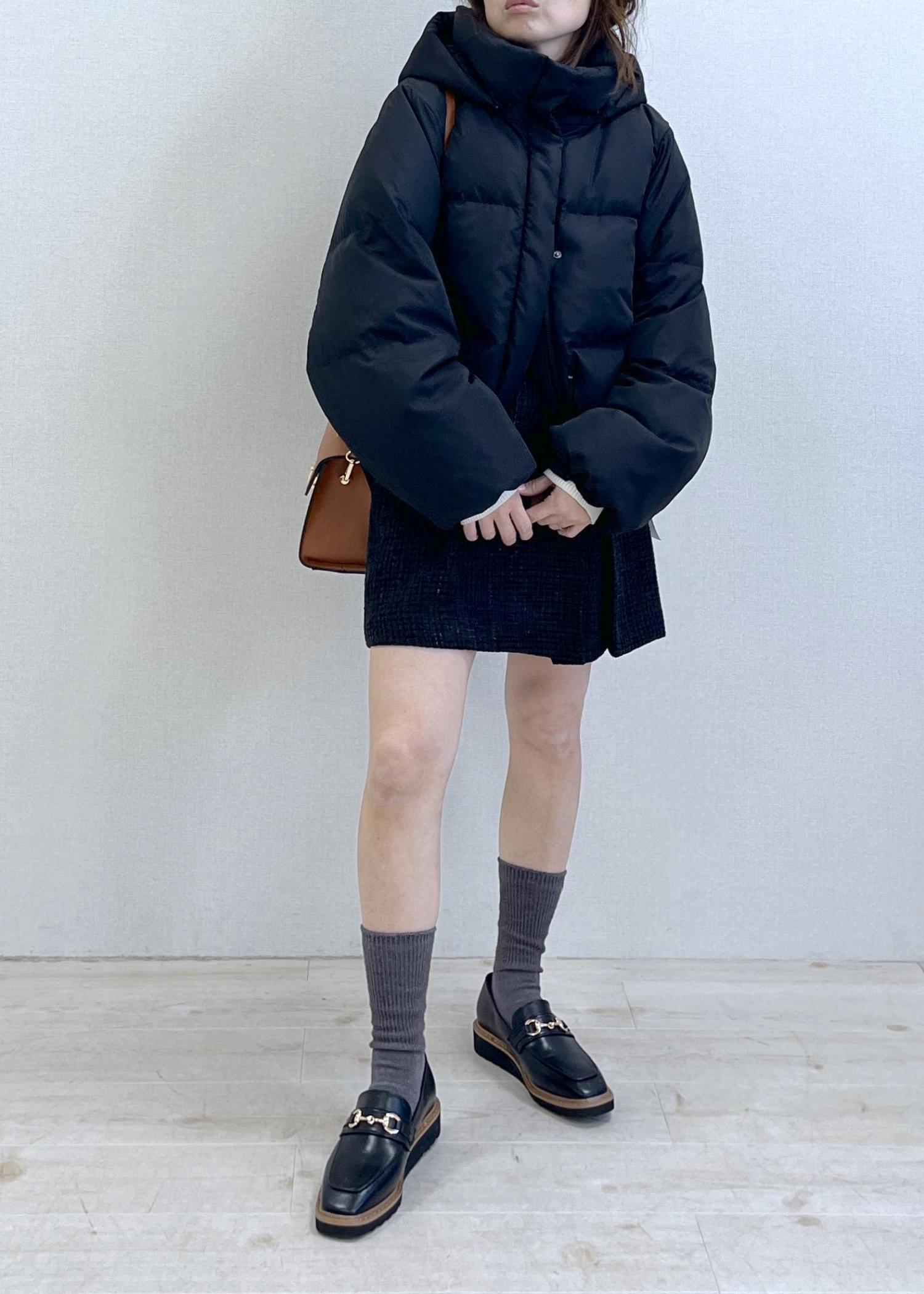 ミニ丈でも、黒ダウンとローファー合わせなら落ち着いた印象に。肌見せを抑えて、全体をダークトーンでまとめることで大人が着やすいバランスにしています。