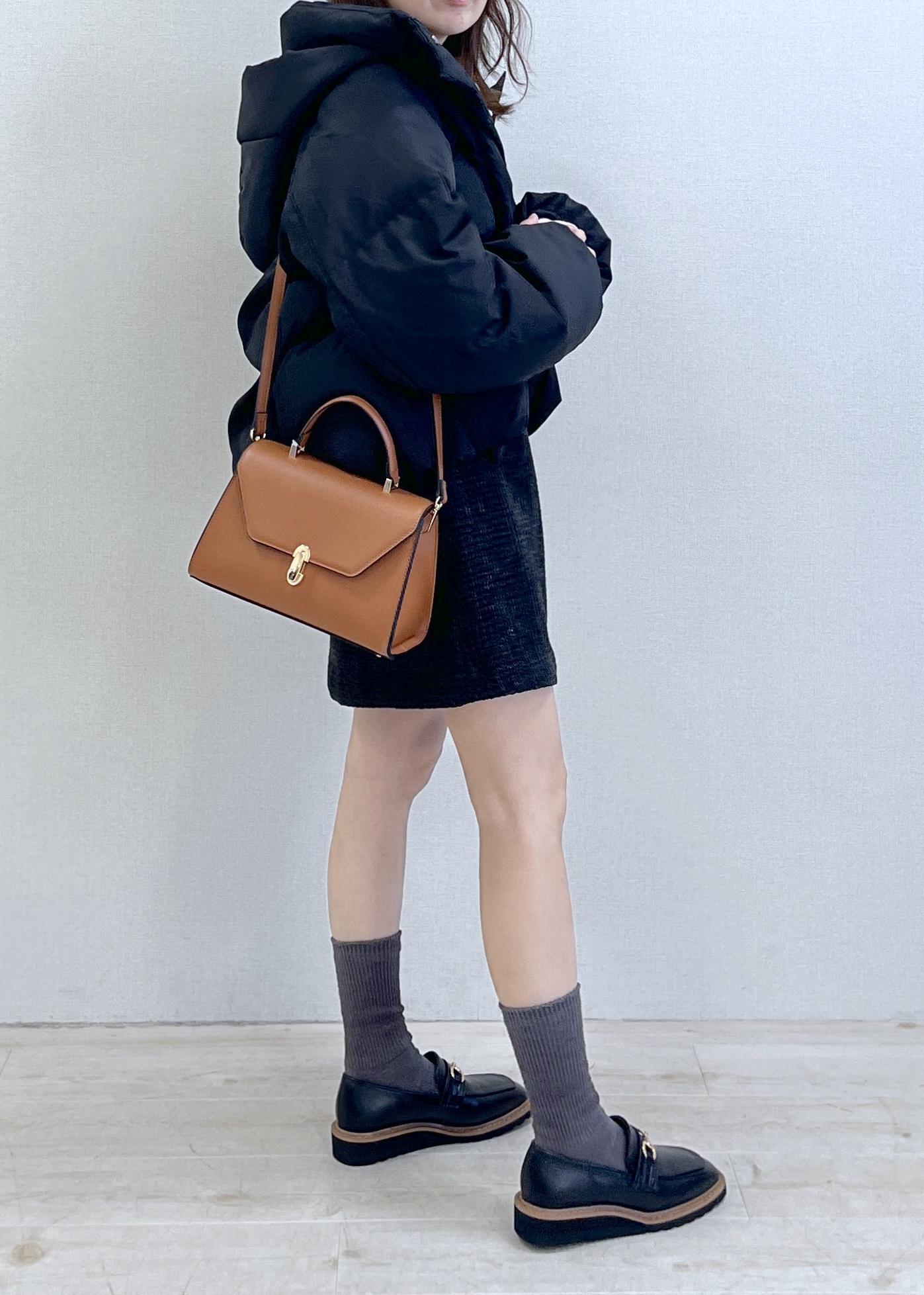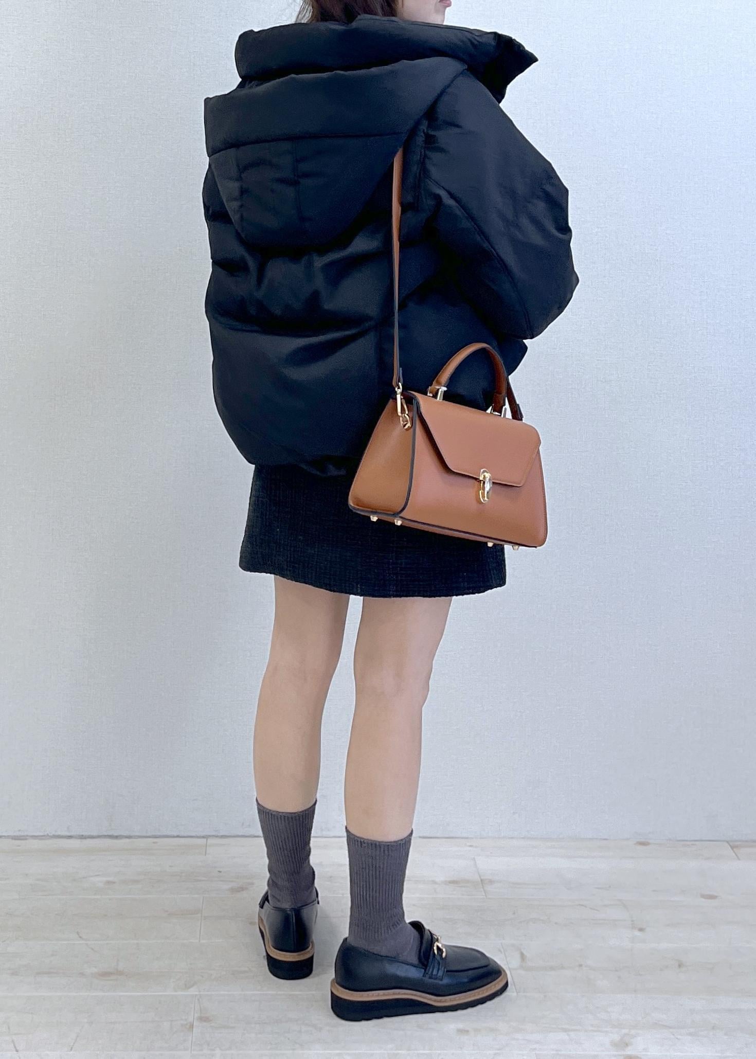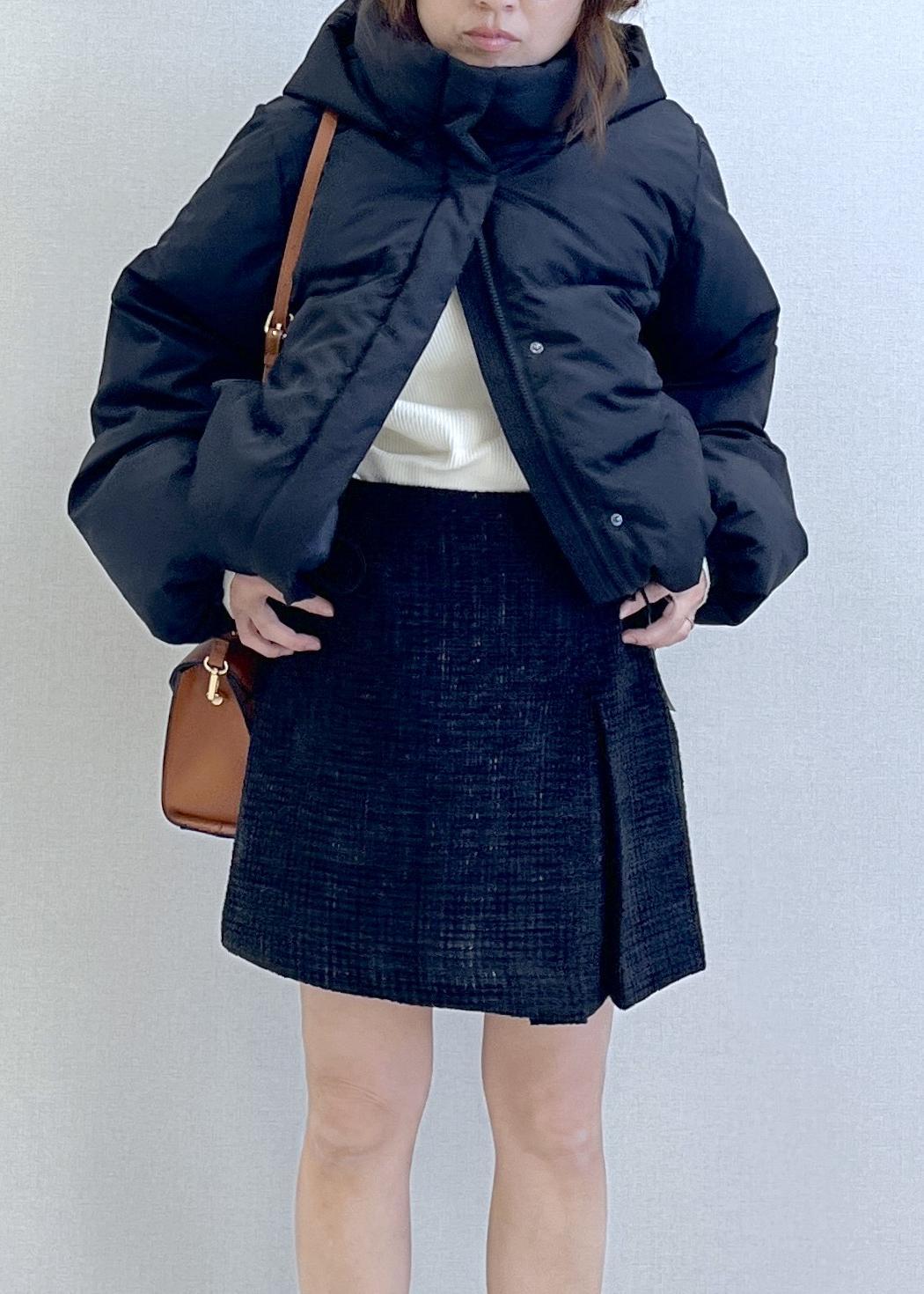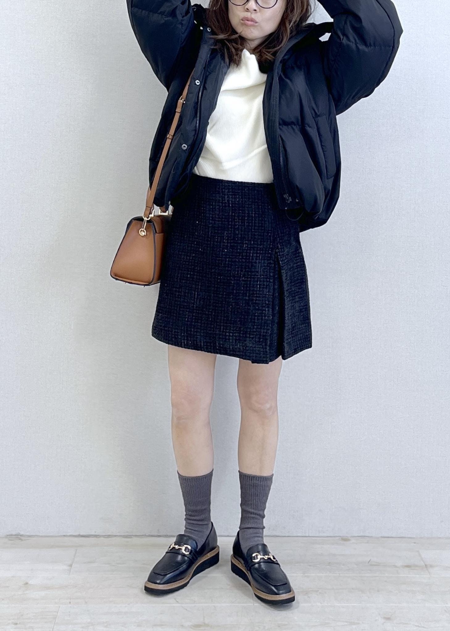 ミニ丈でも、黒ダウンとローファー合わせなら落ち着いた印象に。肌見せを抑えて、全体をダークトーンでまとめることで大人が着やすいバランスにしています。
