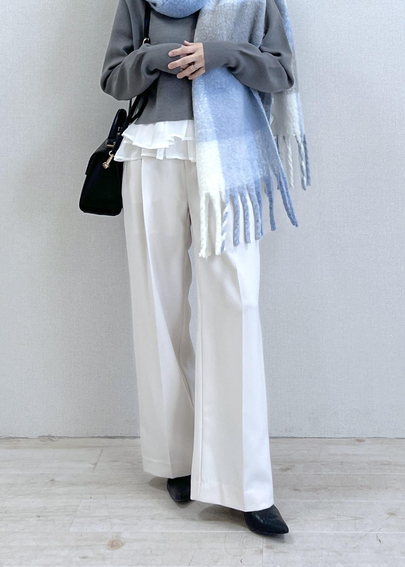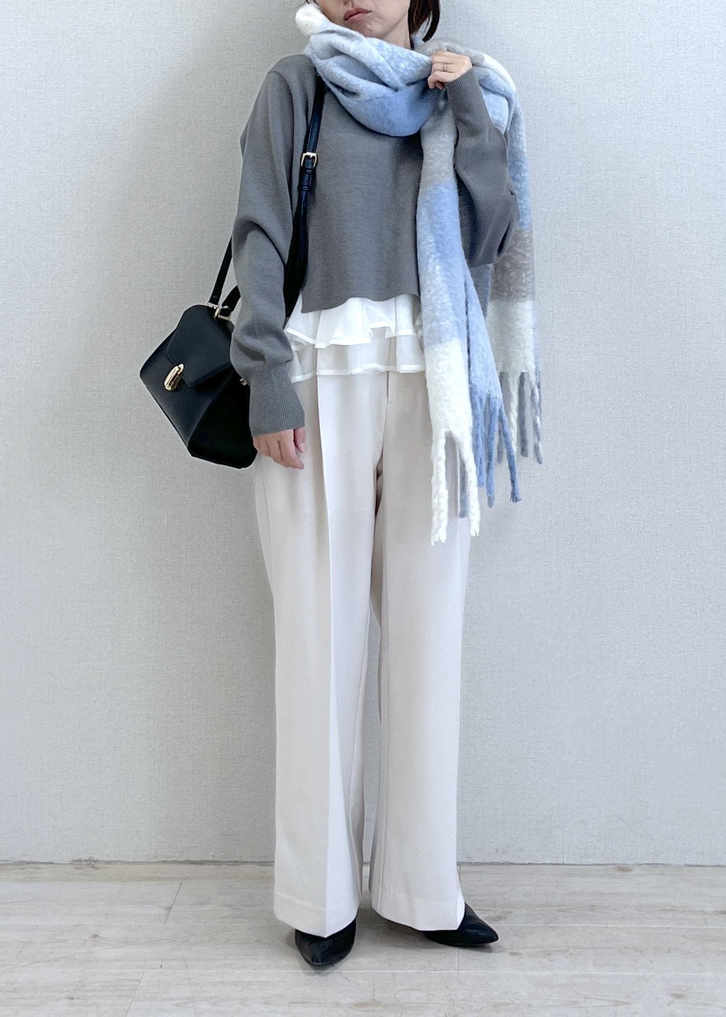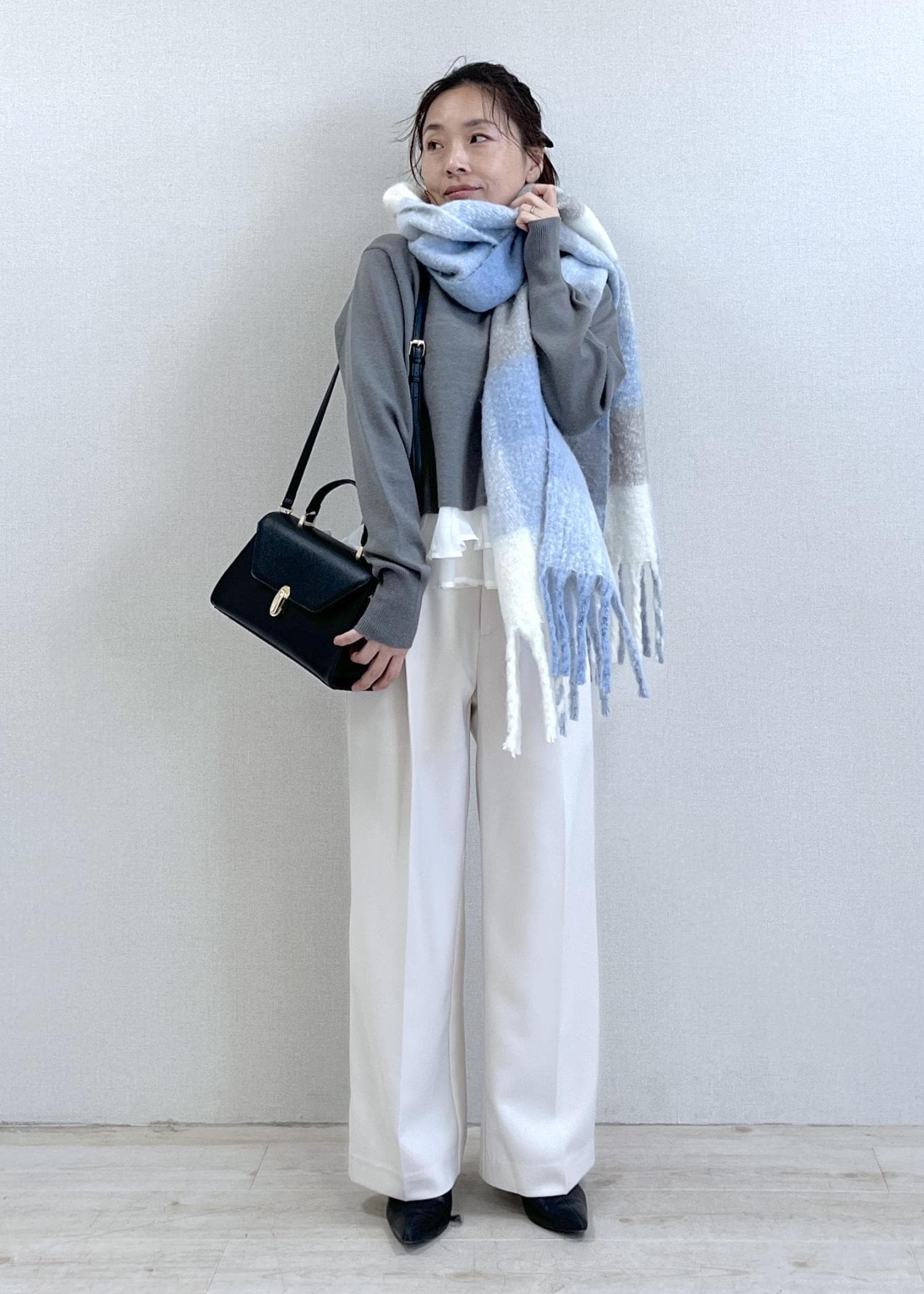 グレー×ホワイトの淡色合わせで、全体はすっきりきれいめに。ゆるっとしたトップスにワイドパンツを合わせて、力の抜けた大人バランスにしました。