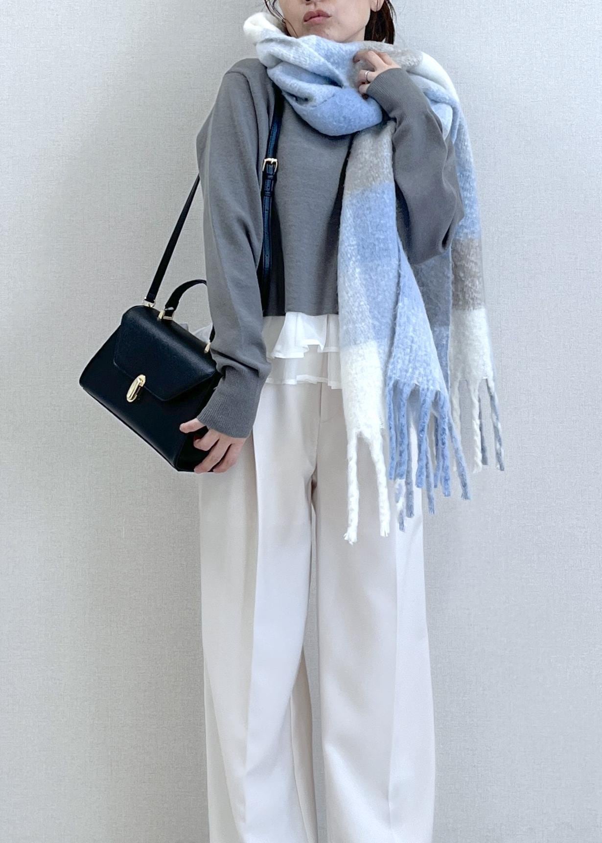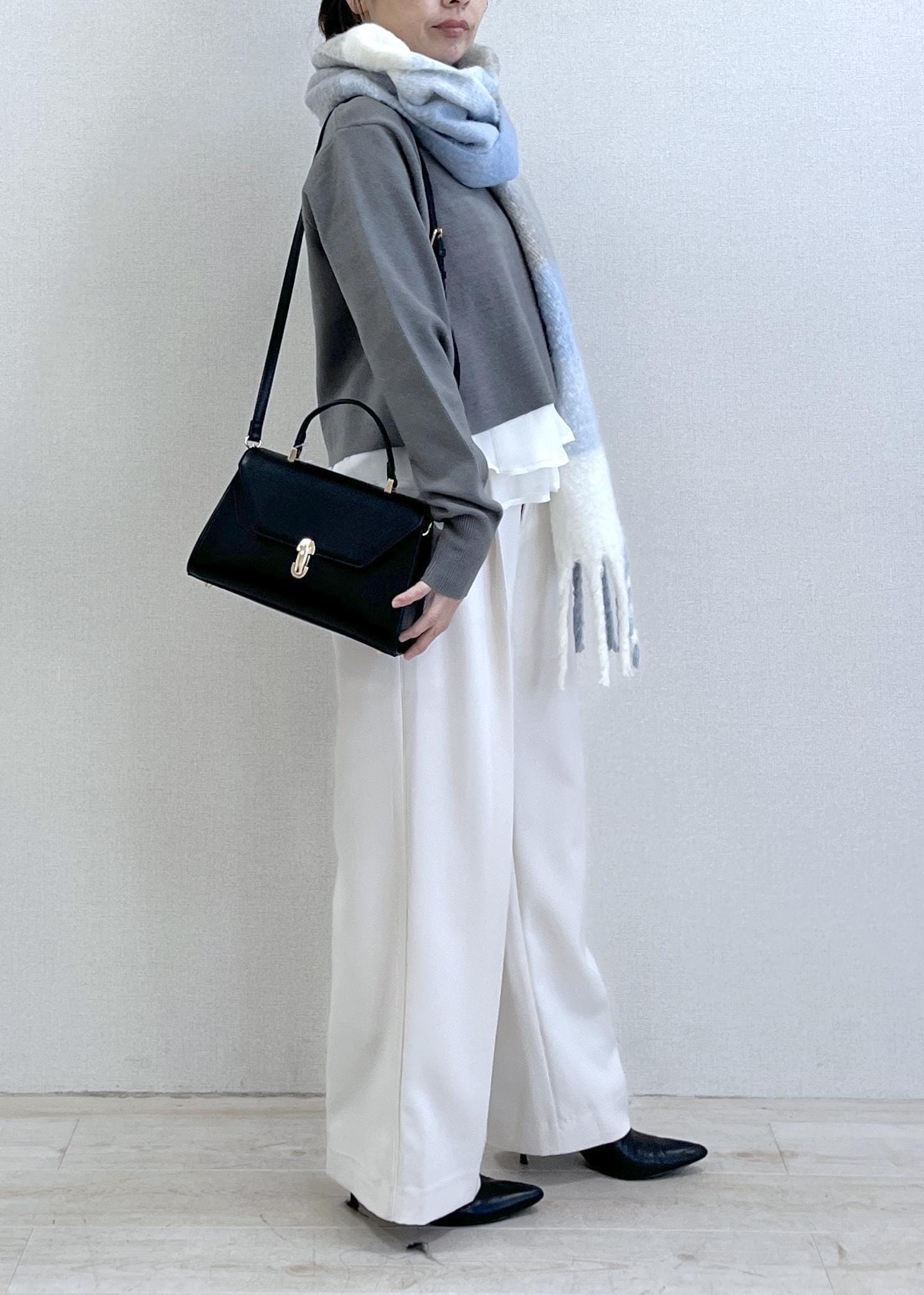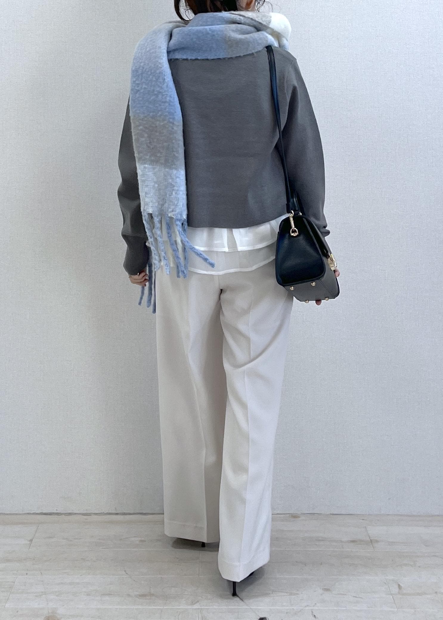 グレー×ホワイトの淡色合わせで、全体はすっきりきれいめに。ゆるっとしたトップスにワイドパンツを合わせて、力の抜けた大人バランスにしました。