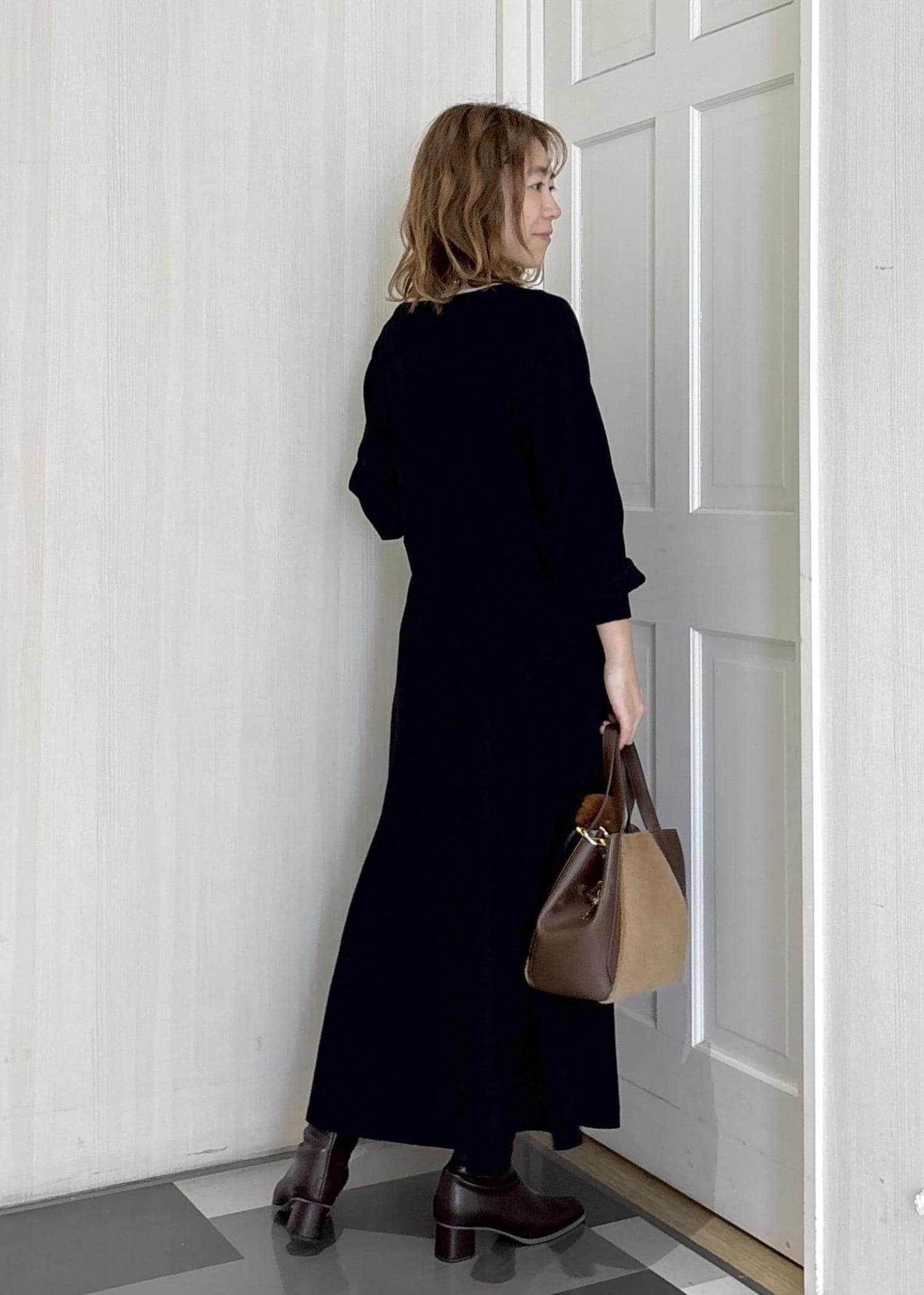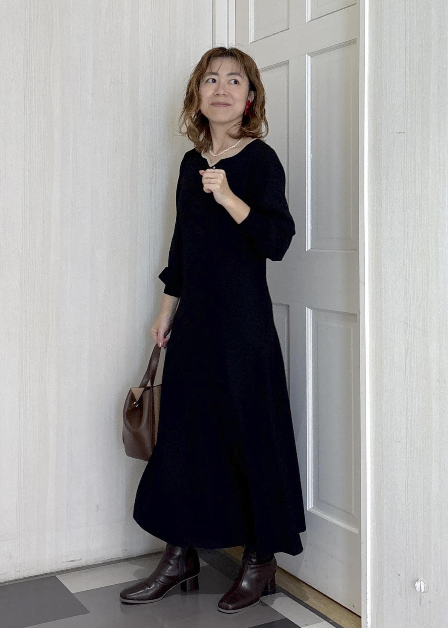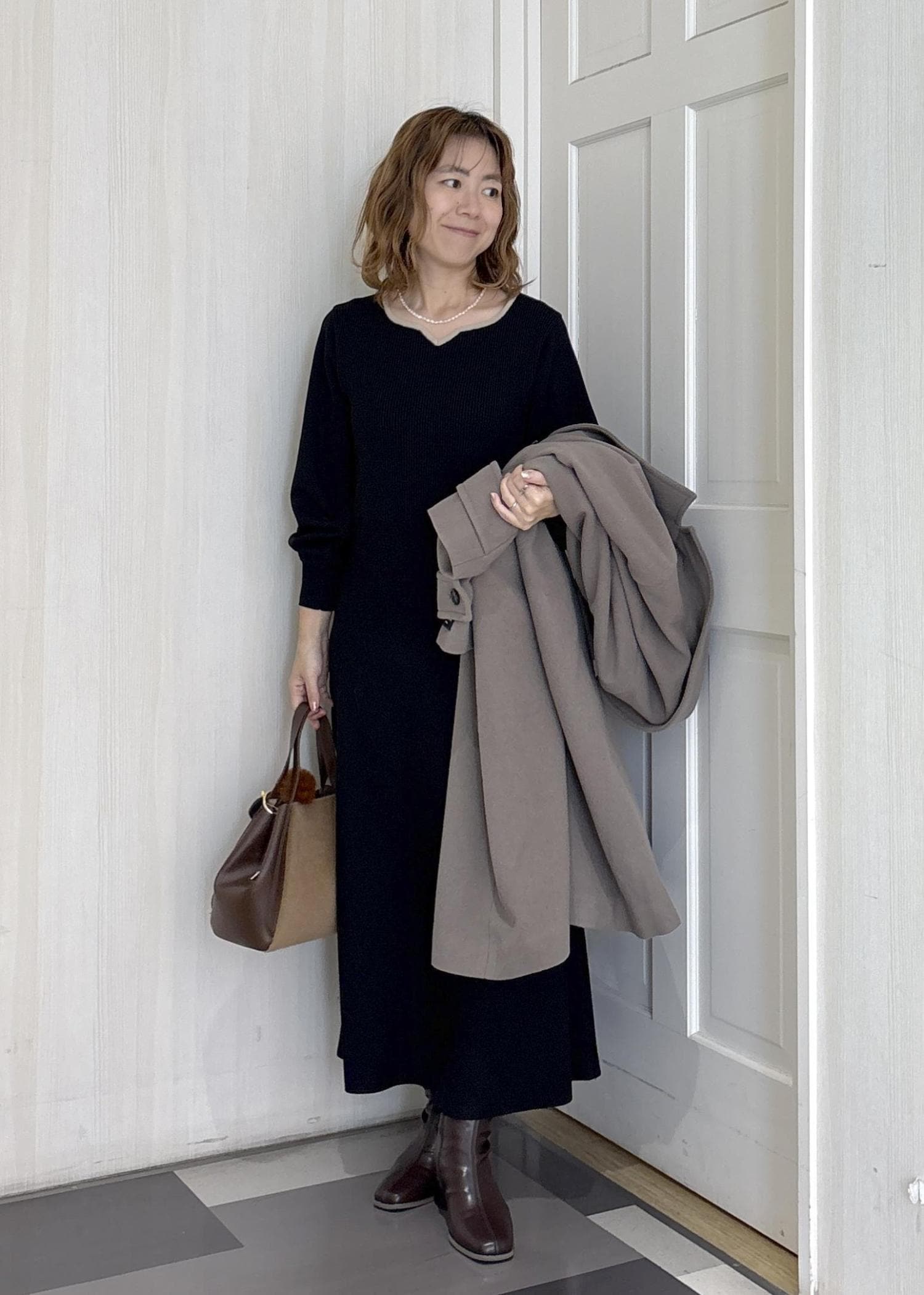 お出かけニットワンピに、女子会やクリスマス、忘年会で話題に出来そうなアイテムをコーディネートしたスタイリングです◎