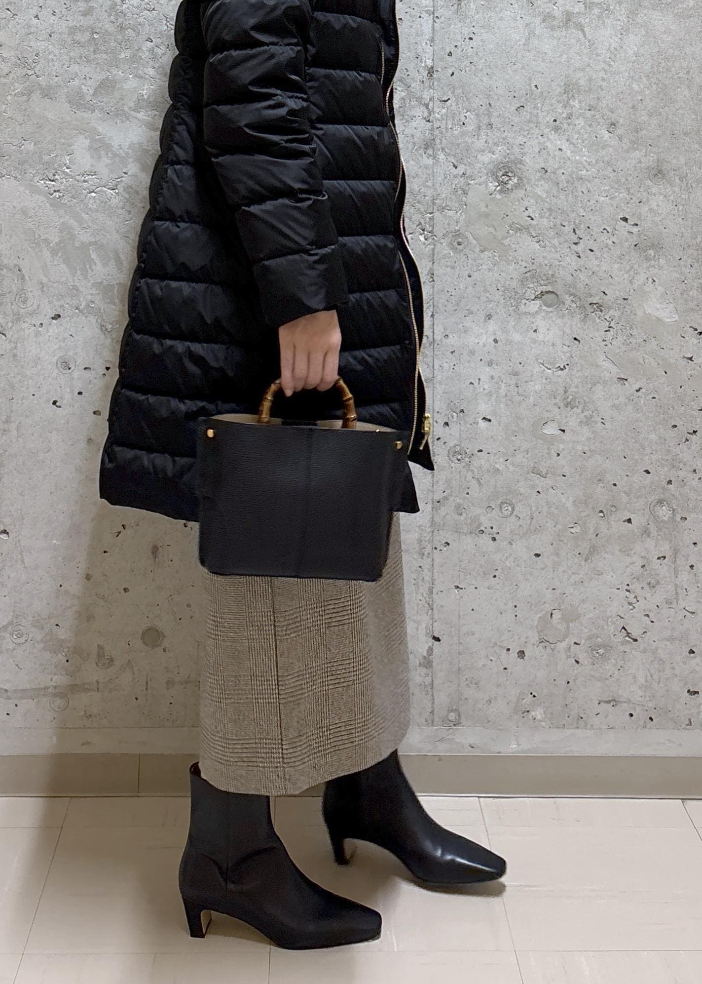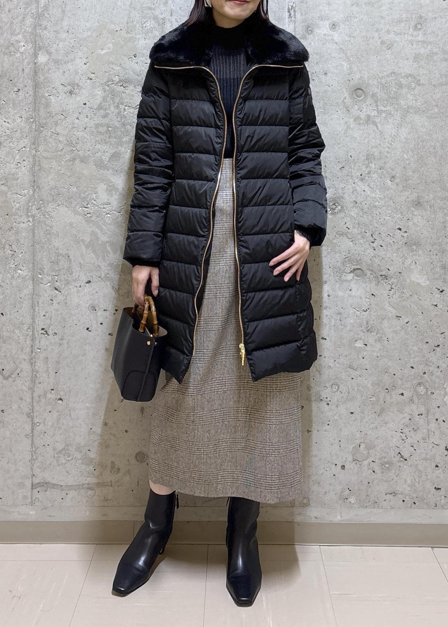 ダウンを主役にチェック柄のスカートを合わせたお出かけコーデ。