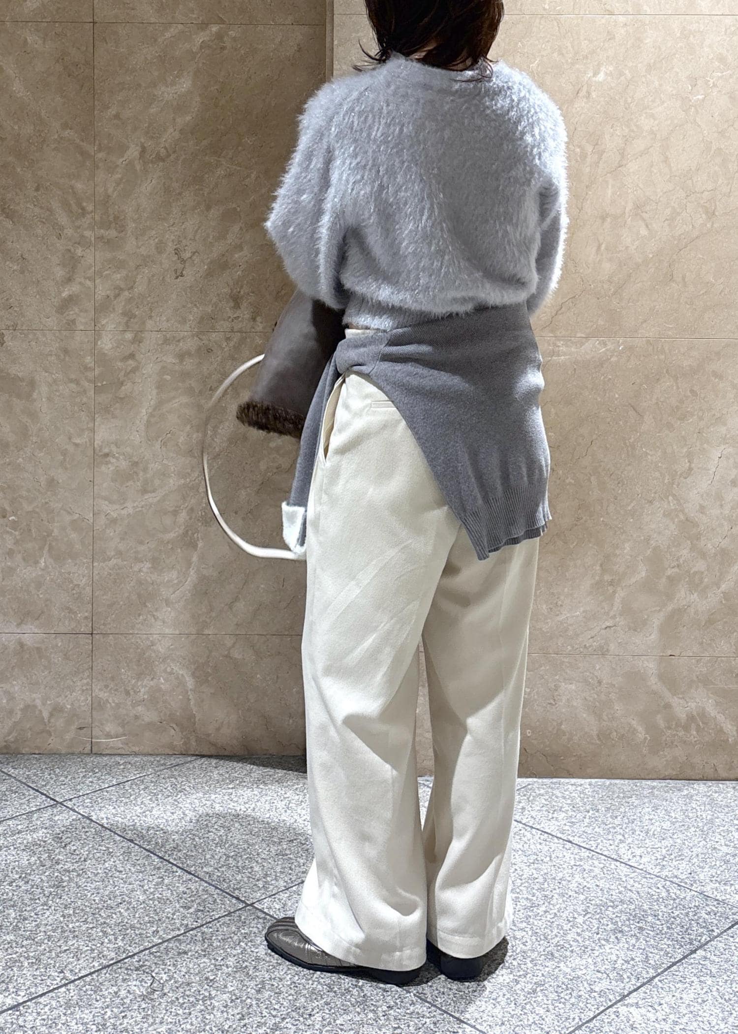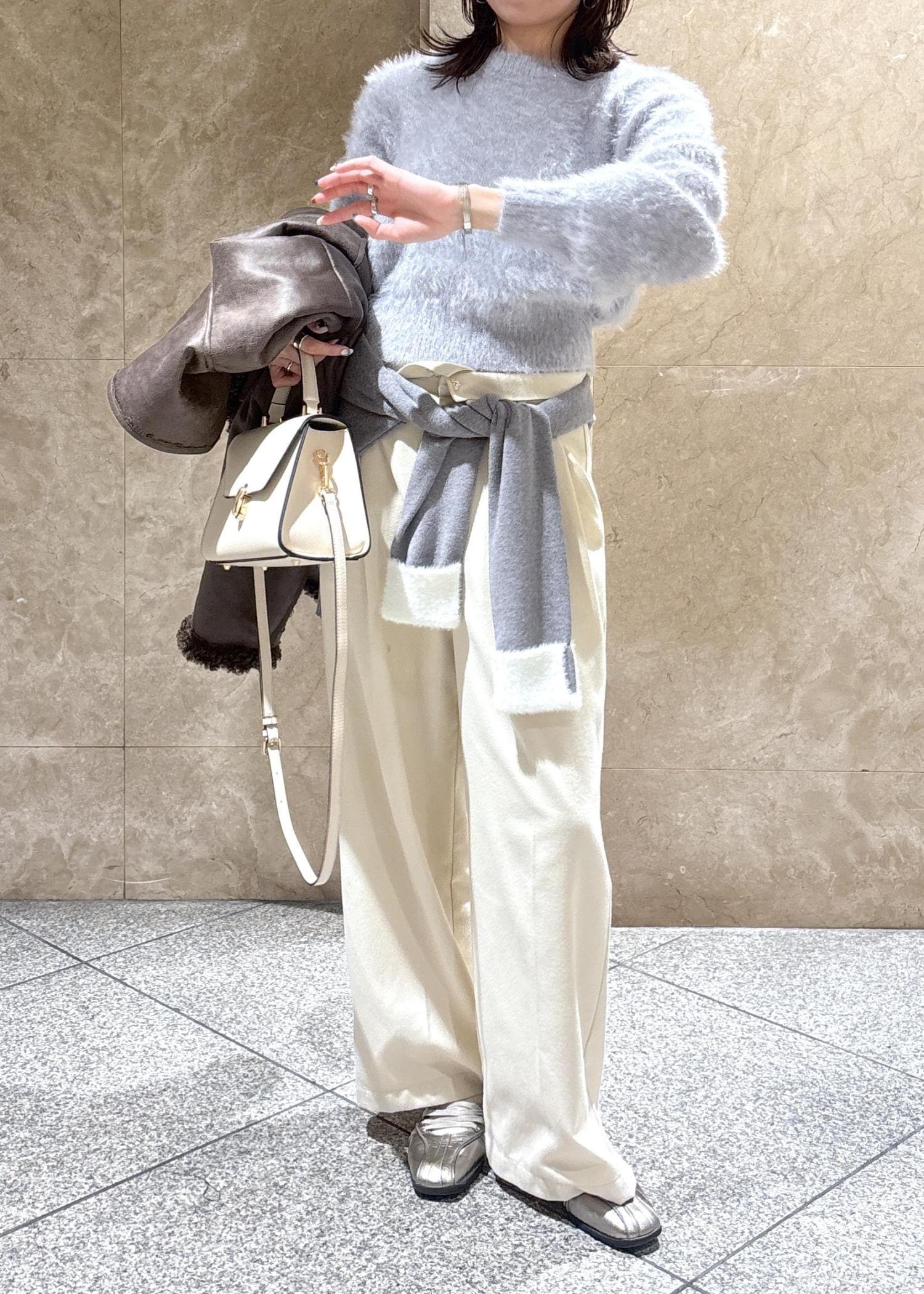 ベルトをおへその位置でしっかりハイウエストで履くと足首が出る丈ですが、へそ下で履いてもシルエットが崩れなかったので、敢えて腰で落として着丈長めに着用しています。