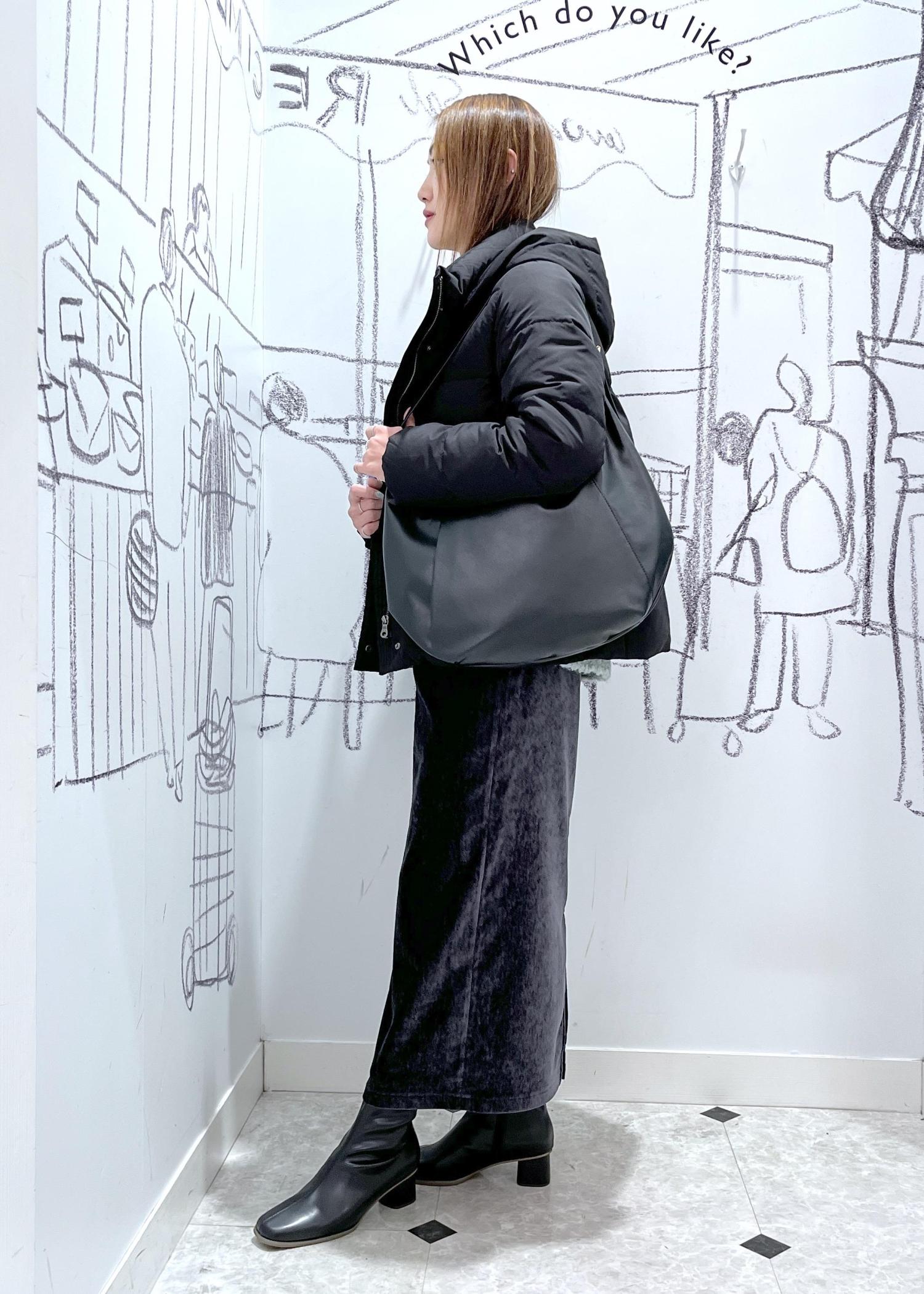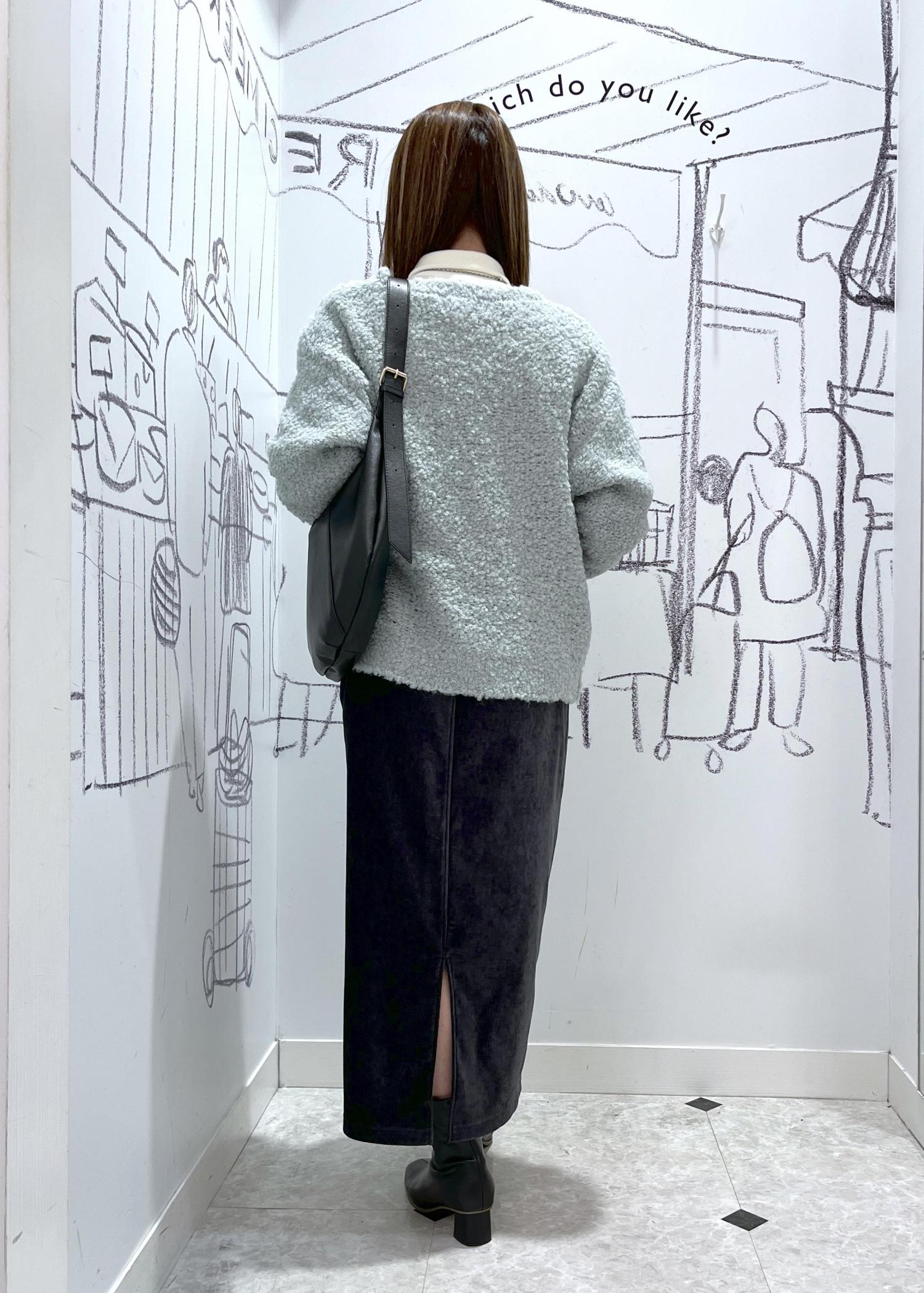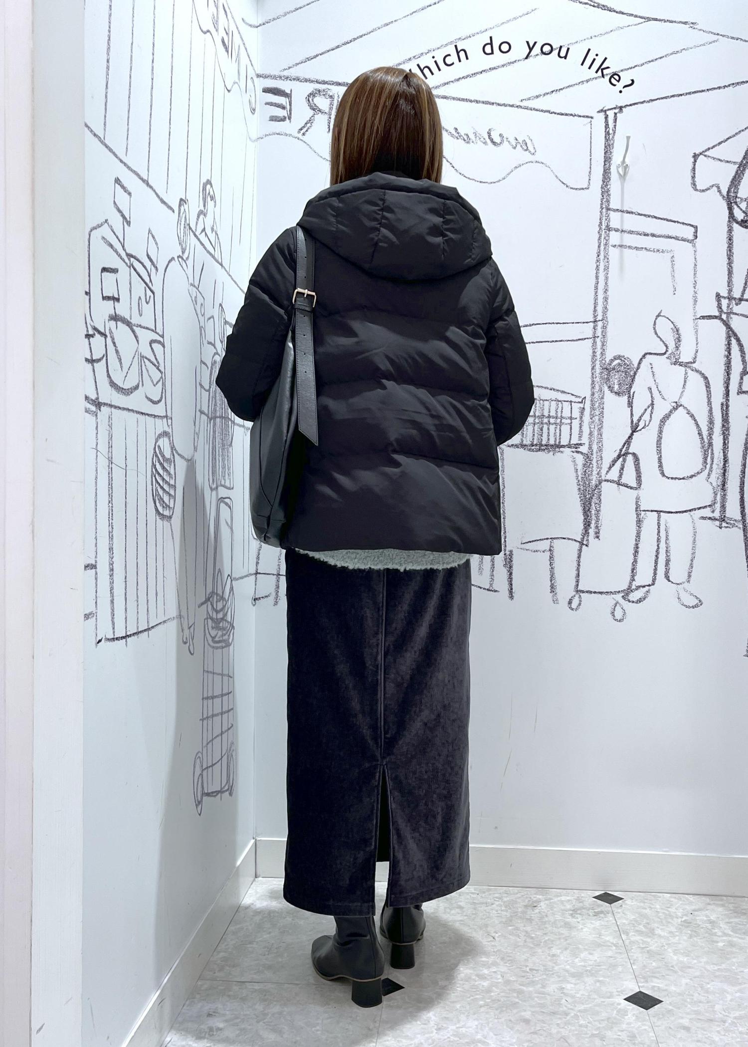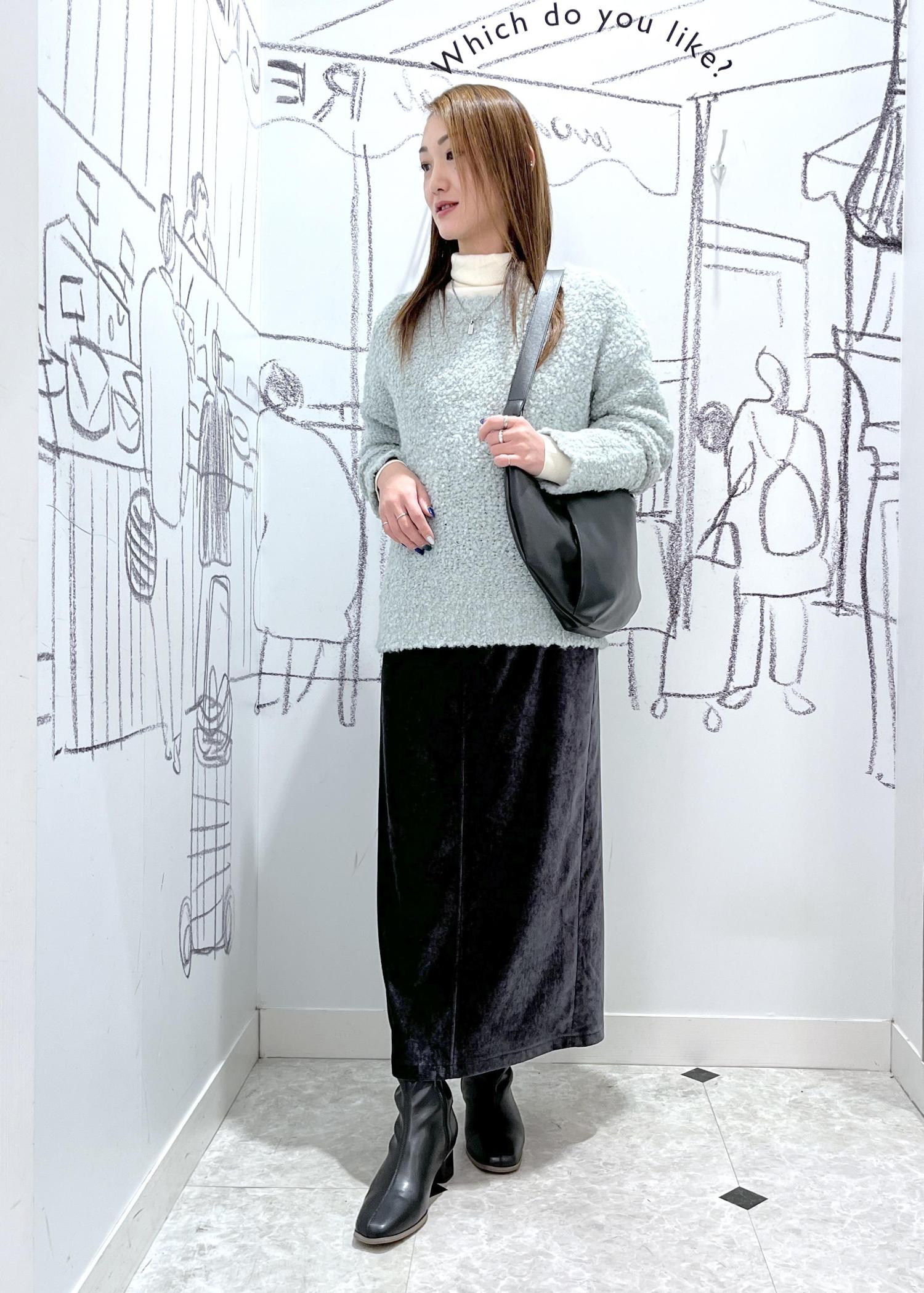 あったかくて軽いアウターにぴったりのコーデ。もこもこが可愛くて着丈が長めのニットにIラインの冬らしい素材のスカートを合わせると体型が気になる方も着やすいスタイリングに。首が高いと気になる方はタートル2回おると余裕が出来て着心地良いです。