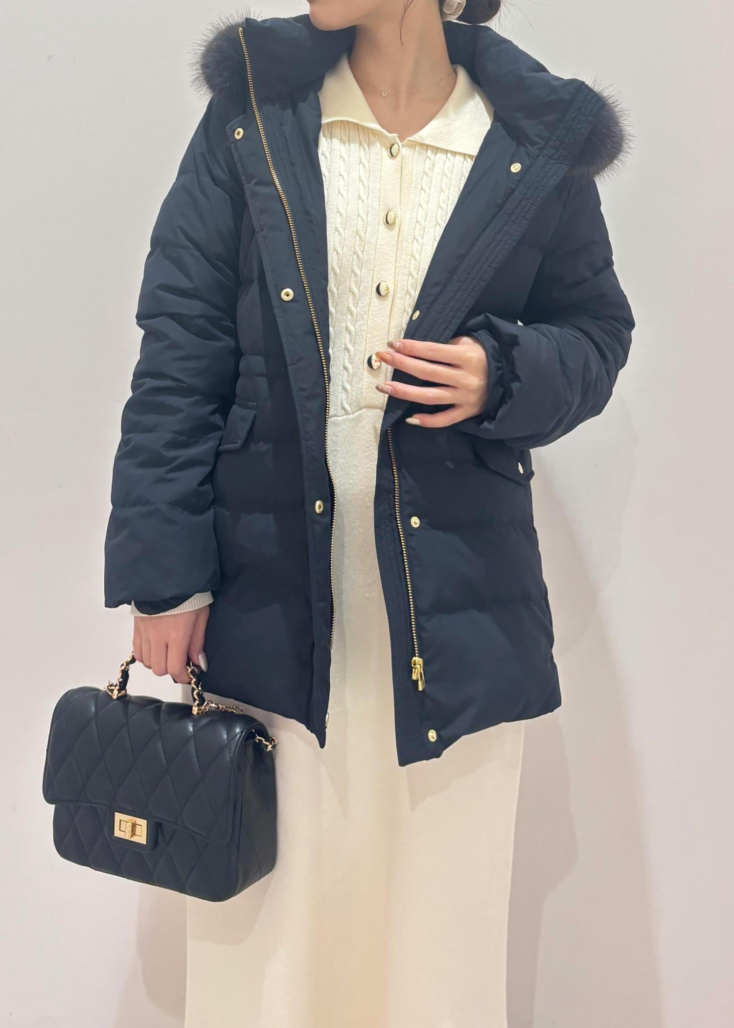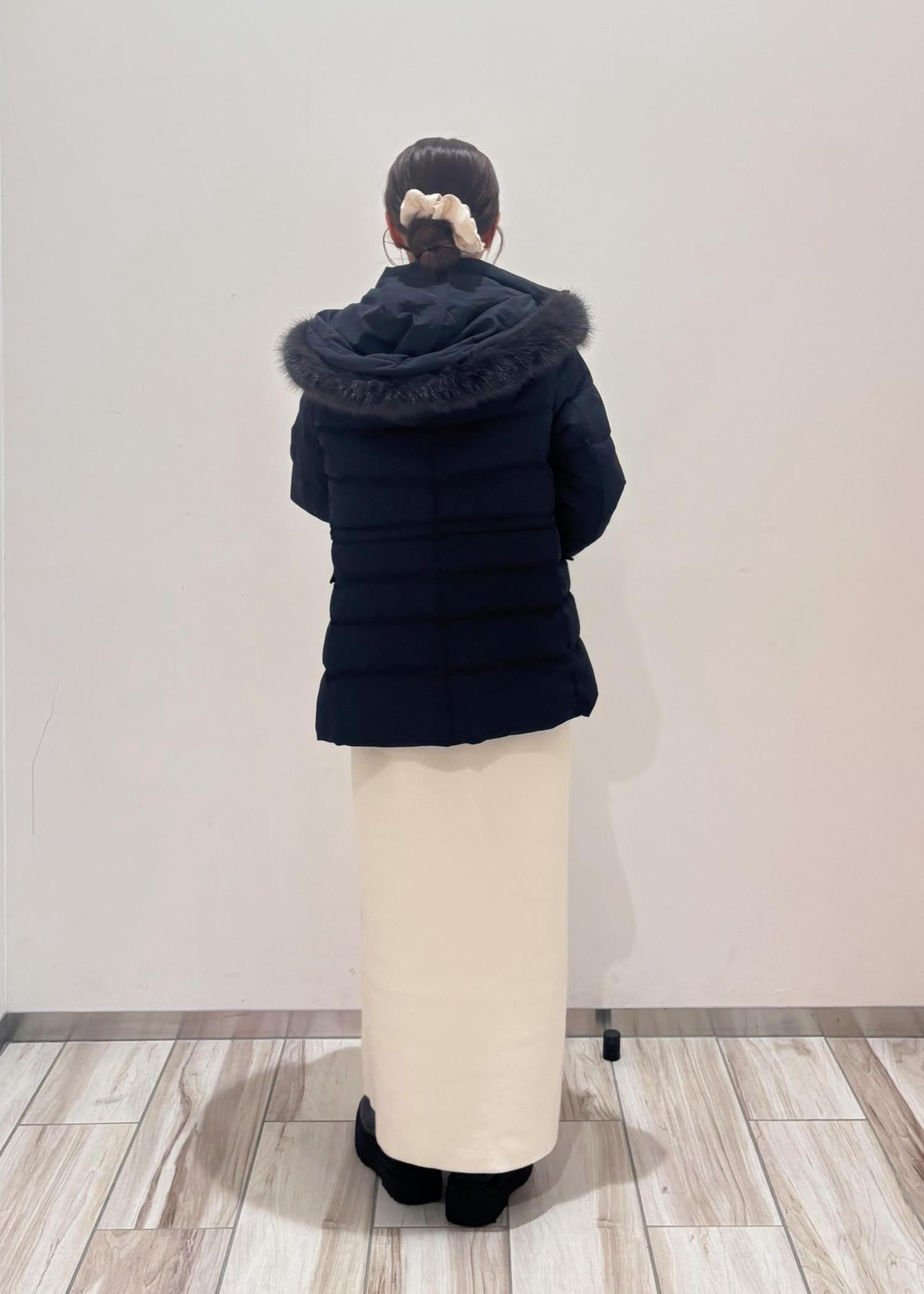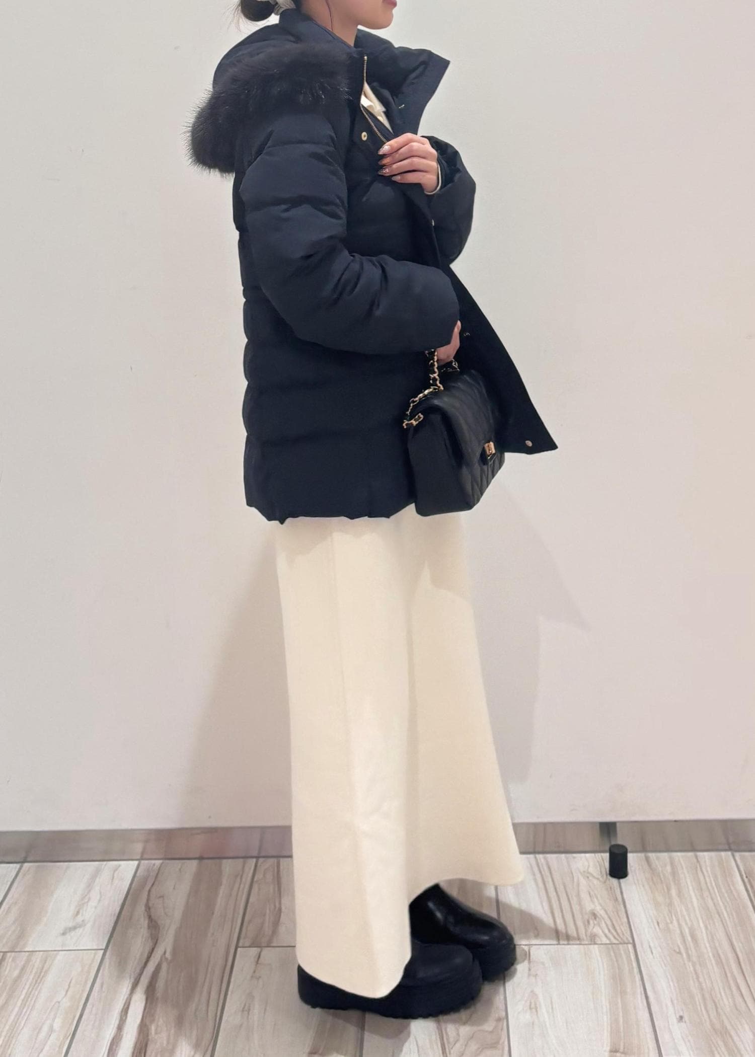 ネイビーファーダウン×白ワンピで冬のデートコーデ♪