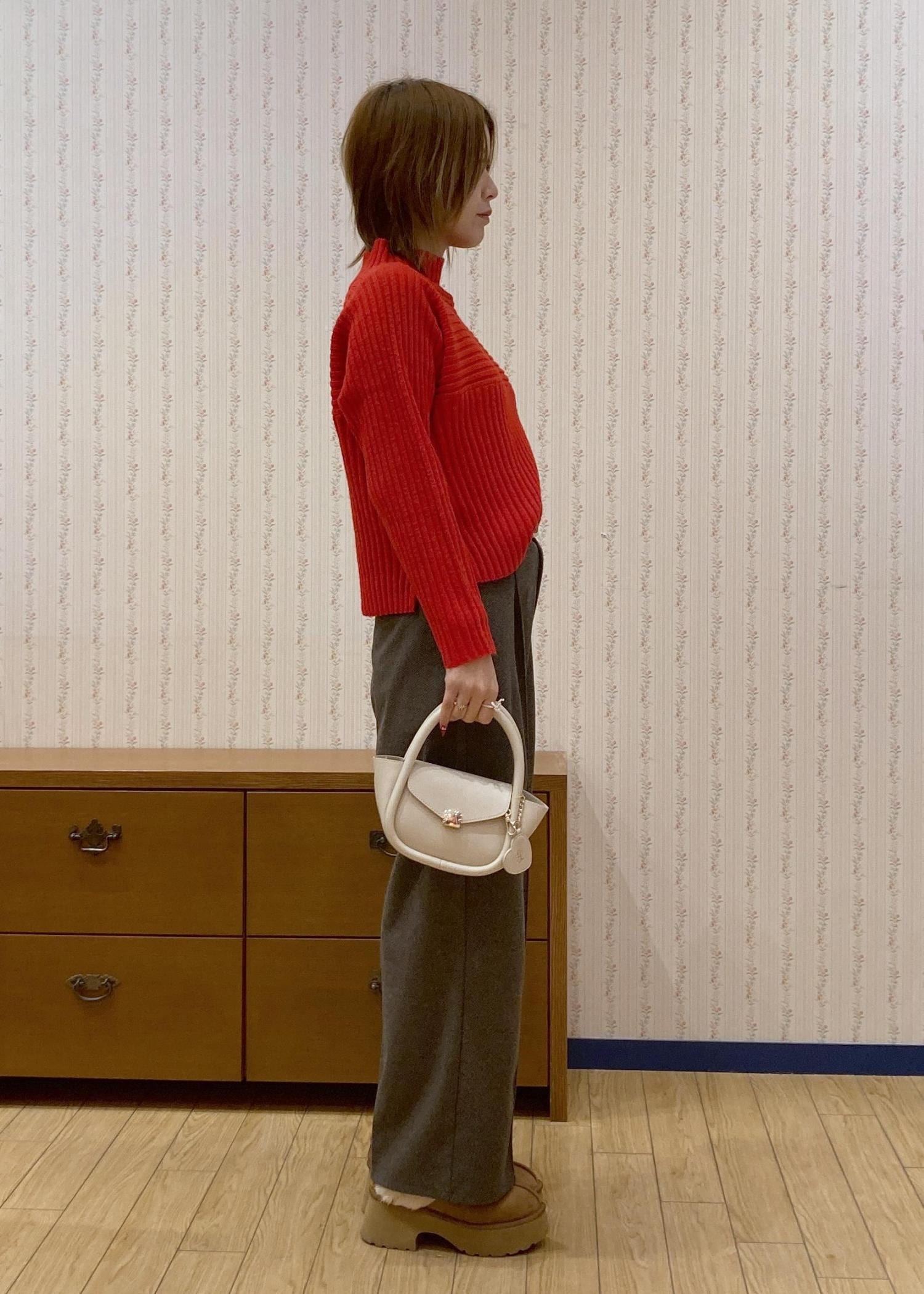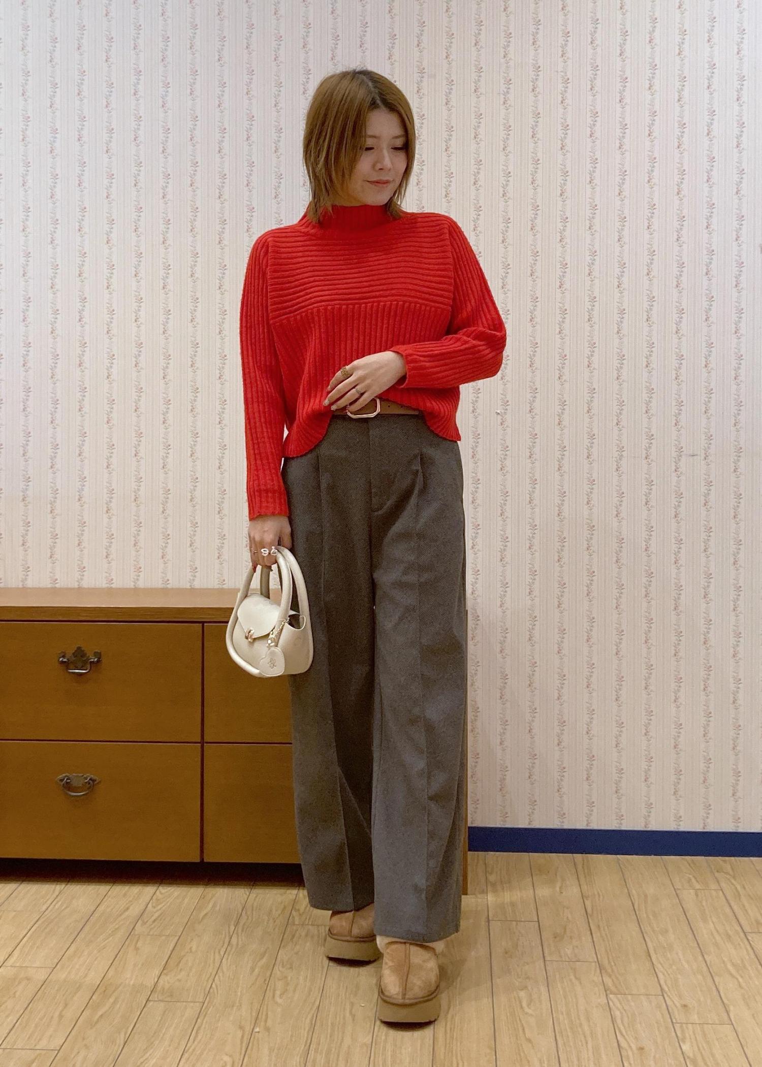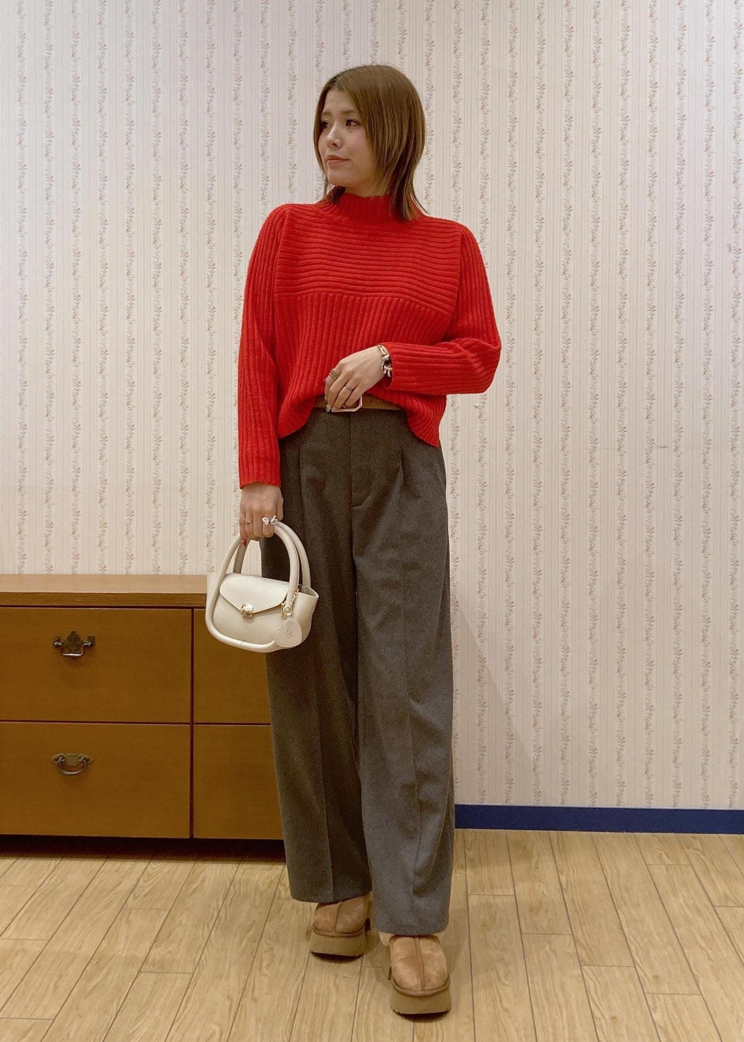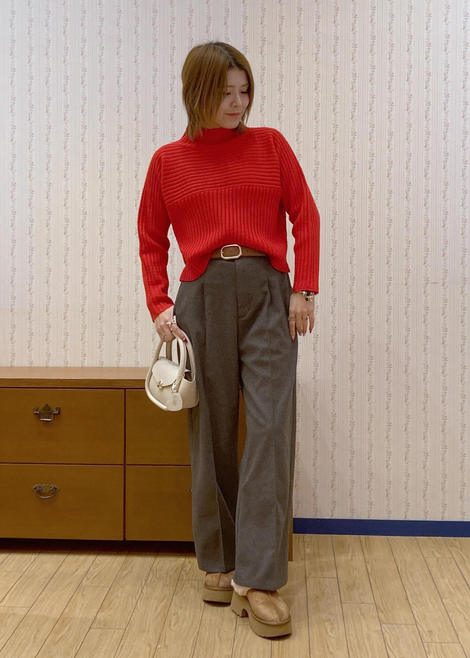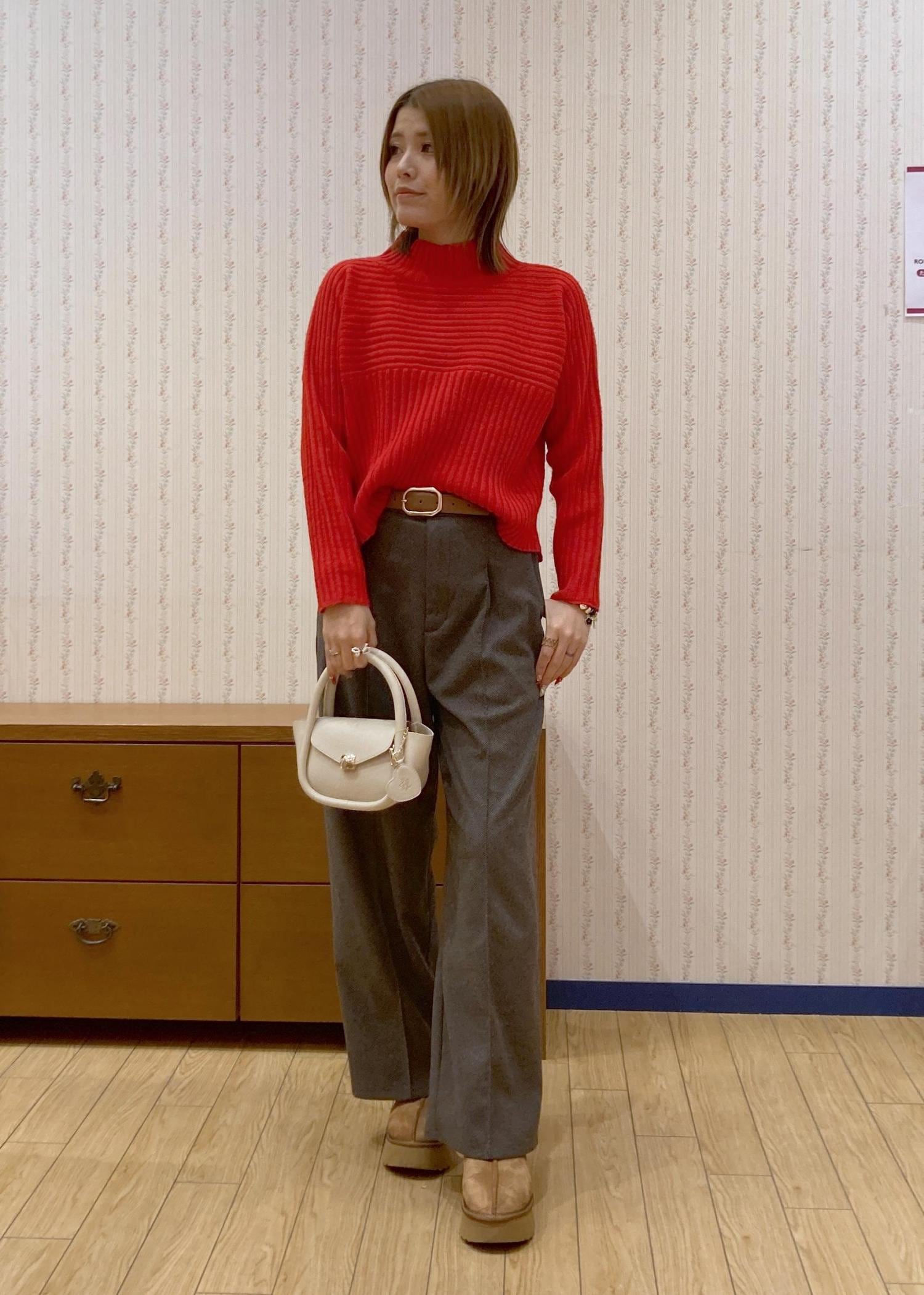 赤ニットを主役にブラウン系でまとめたシンプルなキレイめカジュアルコーディネートです。