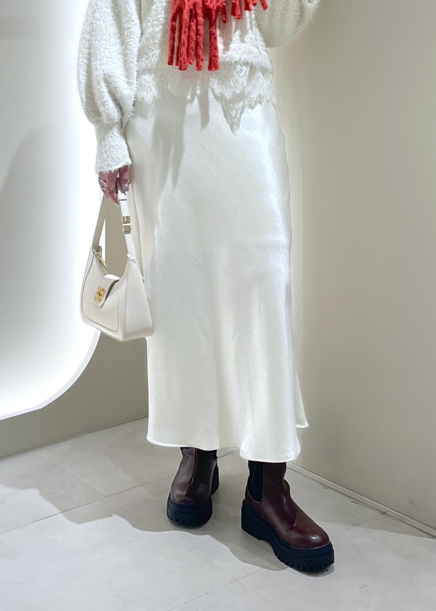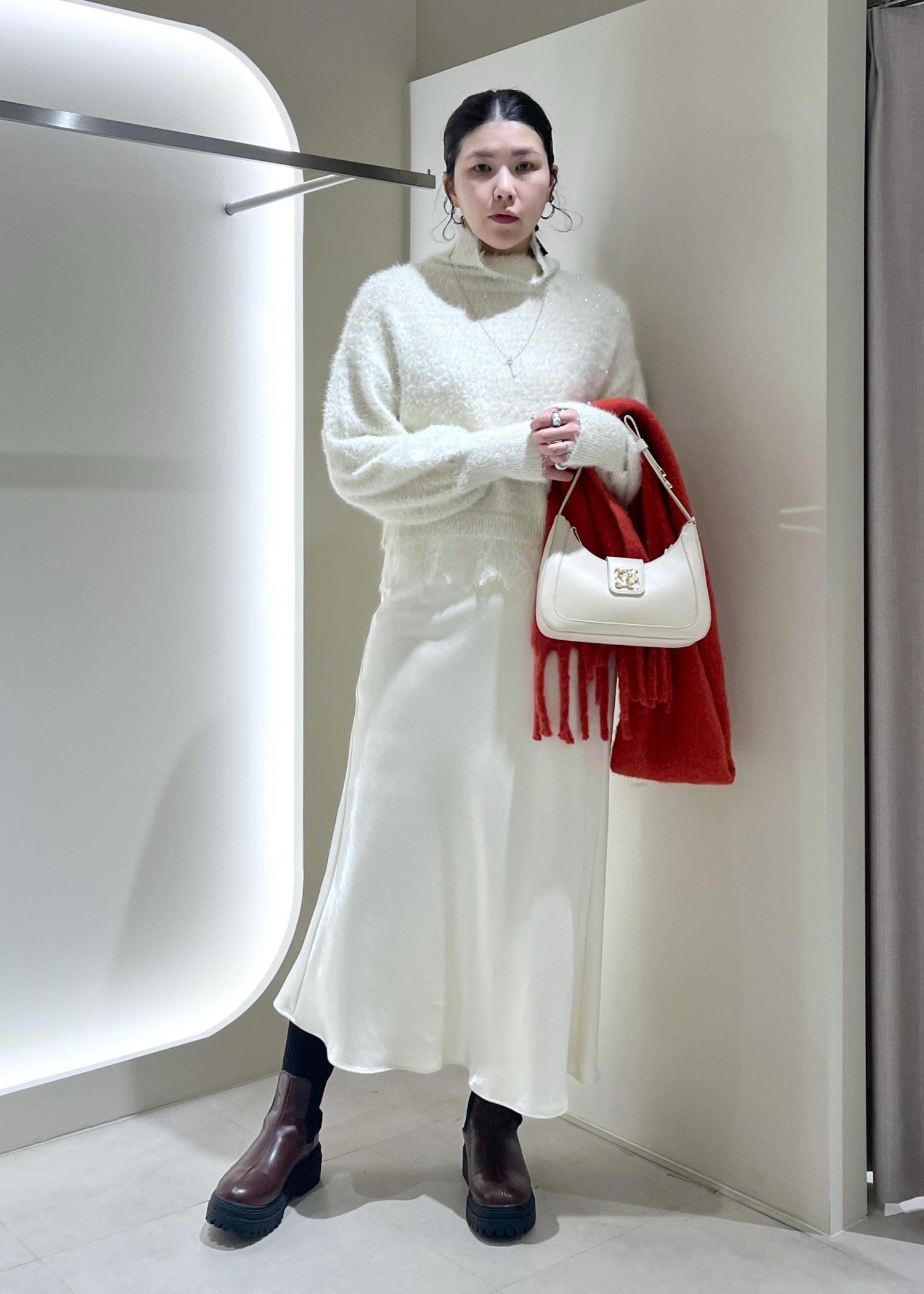 キラキラのラメニットに、上品な光沢感があるナロースカート合わせで冬にぴったりのコーデに!
